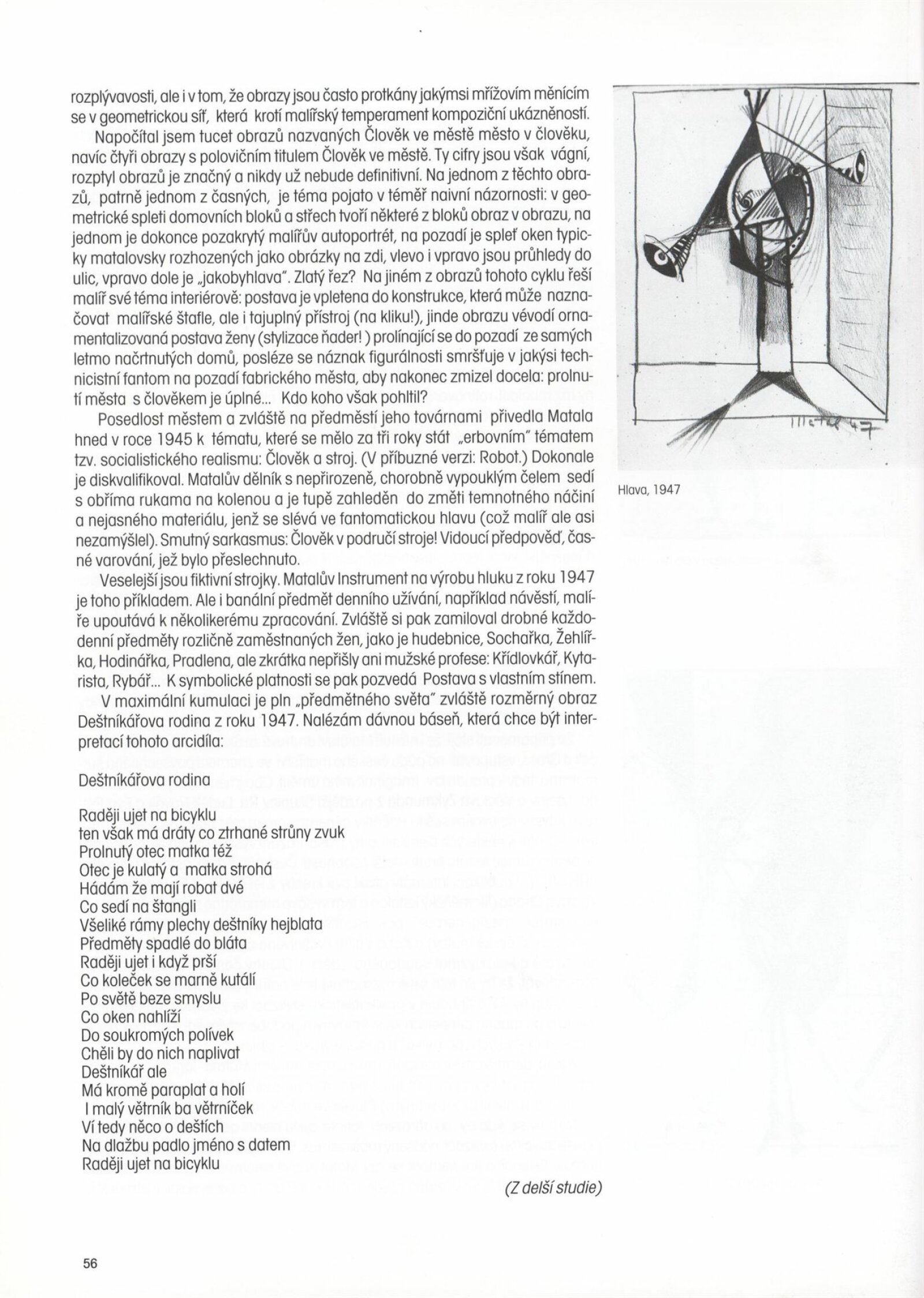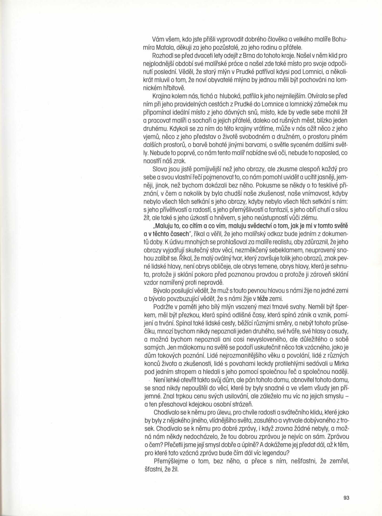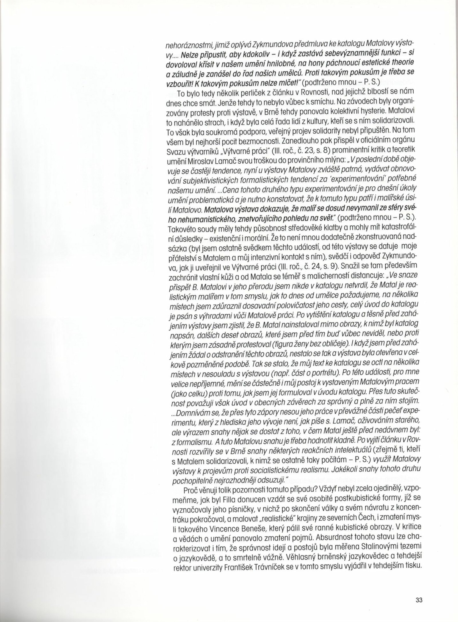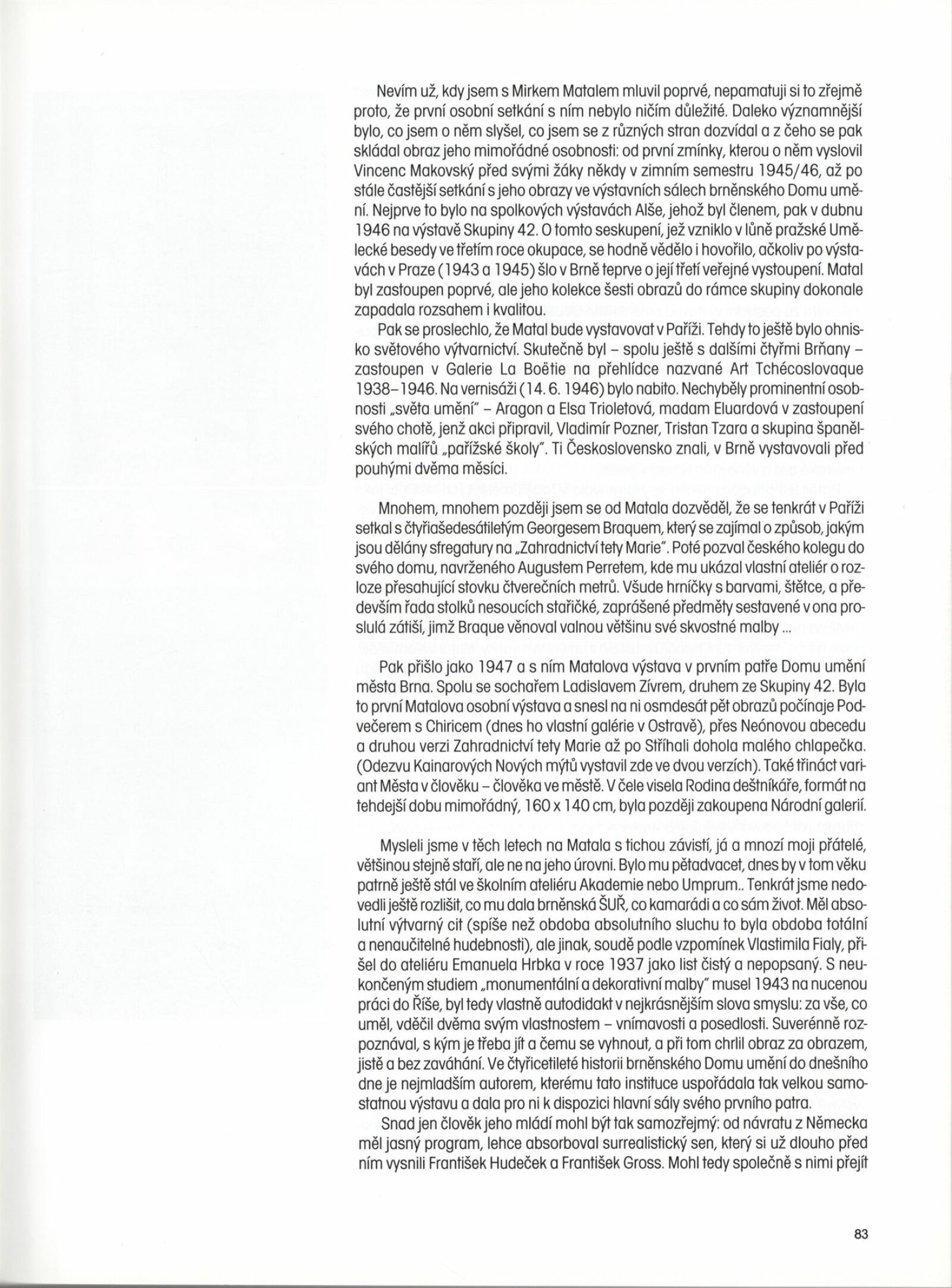 pozvánka na vernisáž a na setkání s přáteli B. Matala, katalog, tisková zpráva, texty k výstavě, materiály ke katalogu, životopis umělce, fotografie, negativy a diapozitivy (vernisáž, výstava, jednotlivá díla, fotografie pro katalog), seznam vystavených děl, korespondence o realizaci výstavy, provozní korespondence, smlouvy a potvrzení o zapůjčení děl, finanční smlouvy, anotace, rozpočet, recenze v tisku, katalogy z jiných výstav umělce, poznámky