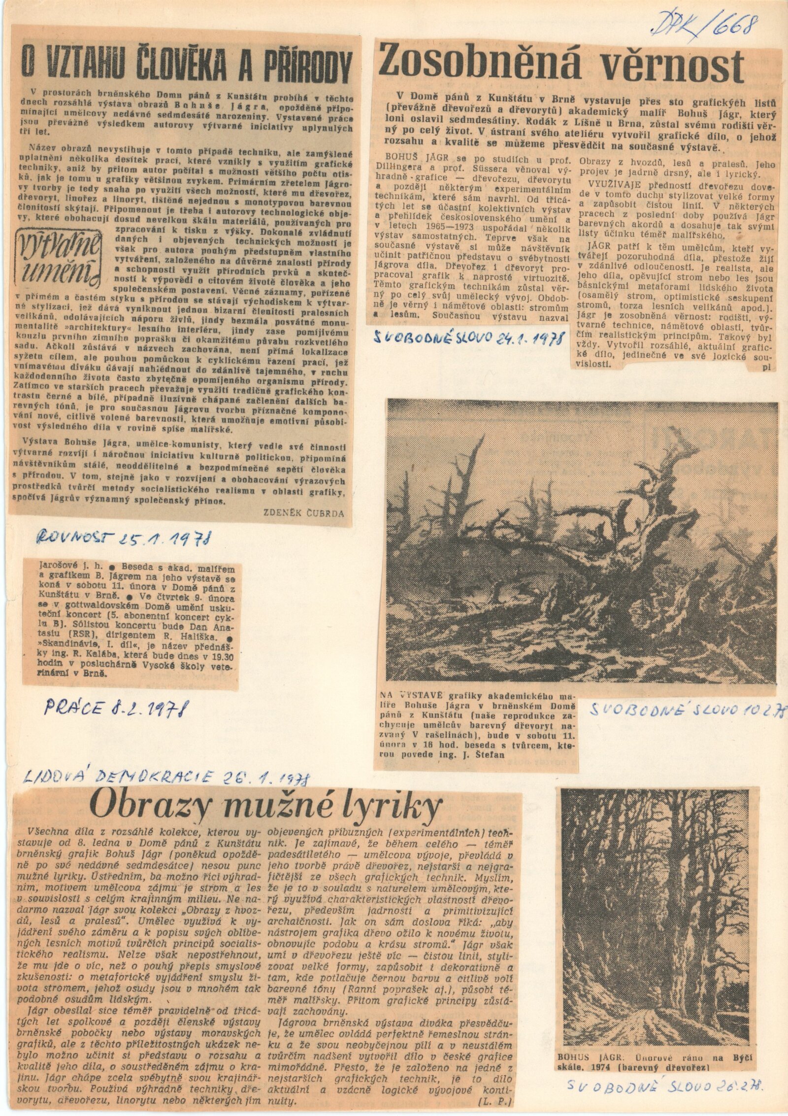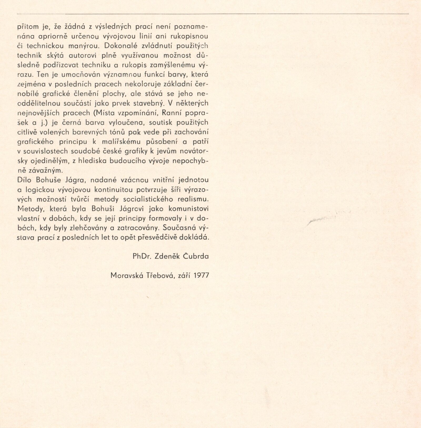 Bohuš Jágr. Grafika. Výstava k autorovým 70. narozeninám: Dům pánů z Kunštátu 8. 1. – 12. 2. 1978 / Text Zdeněk Čubrda. - Brno: DUmB, - 13 s., obr. DPK 668; MZK