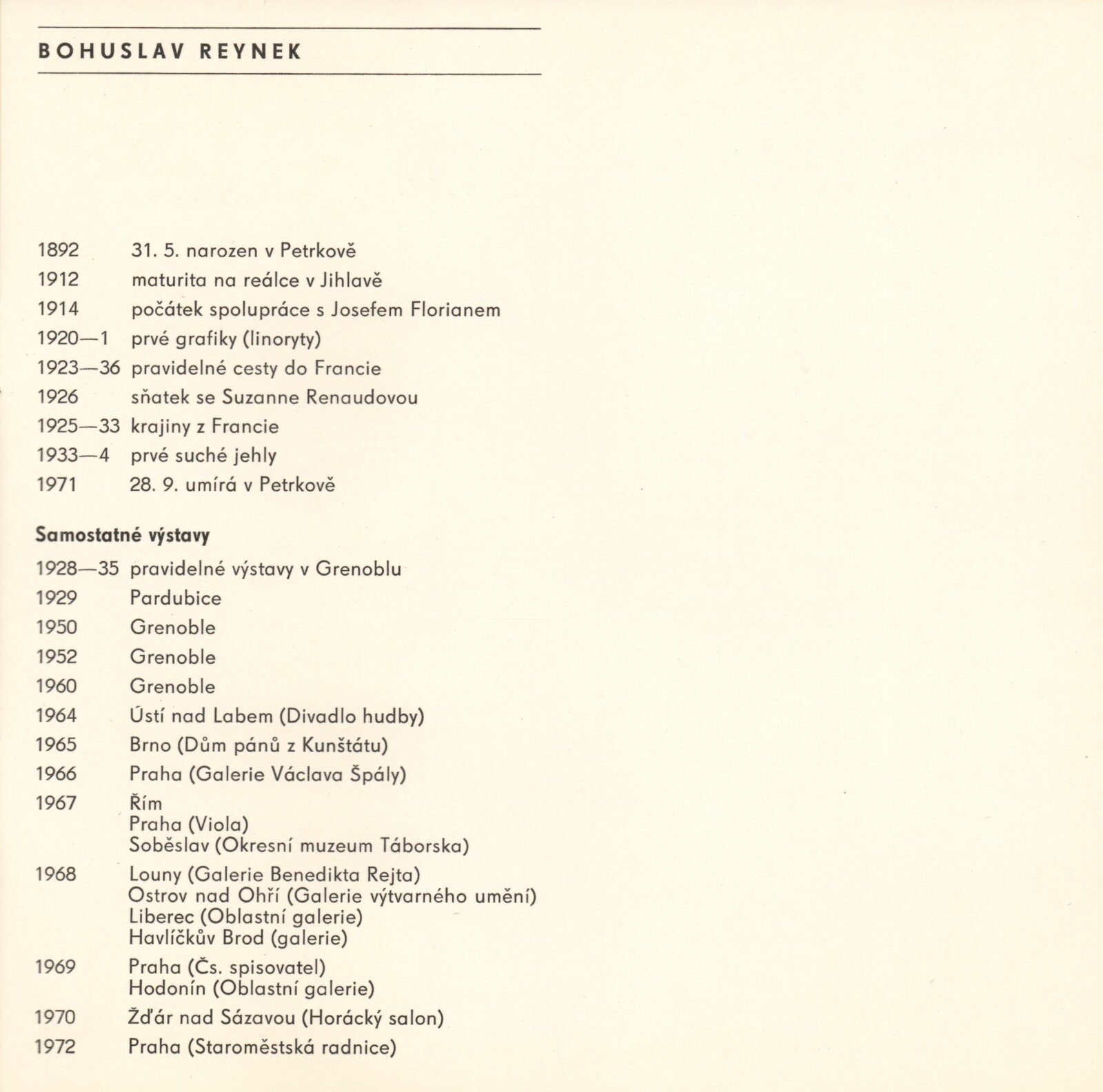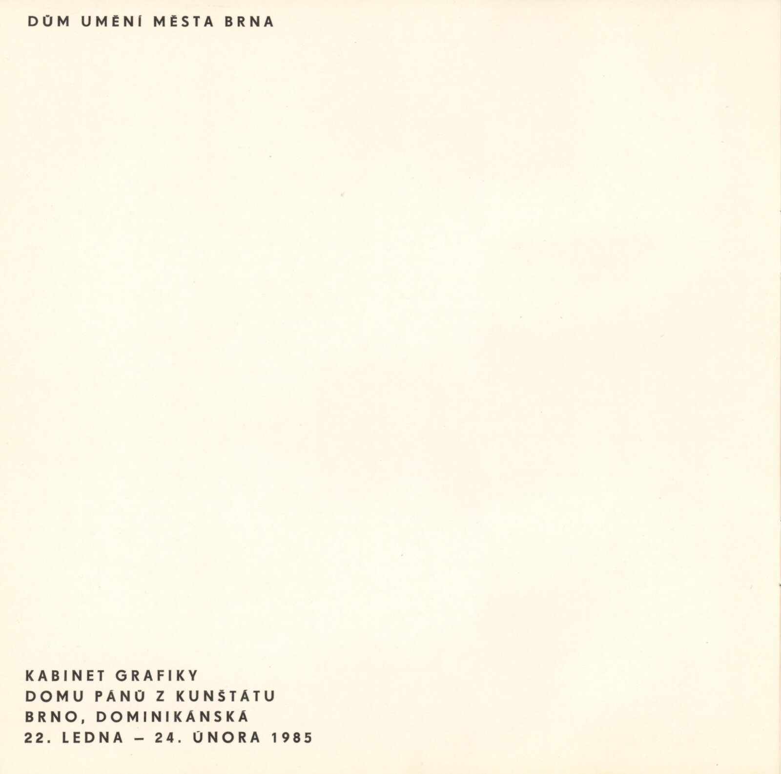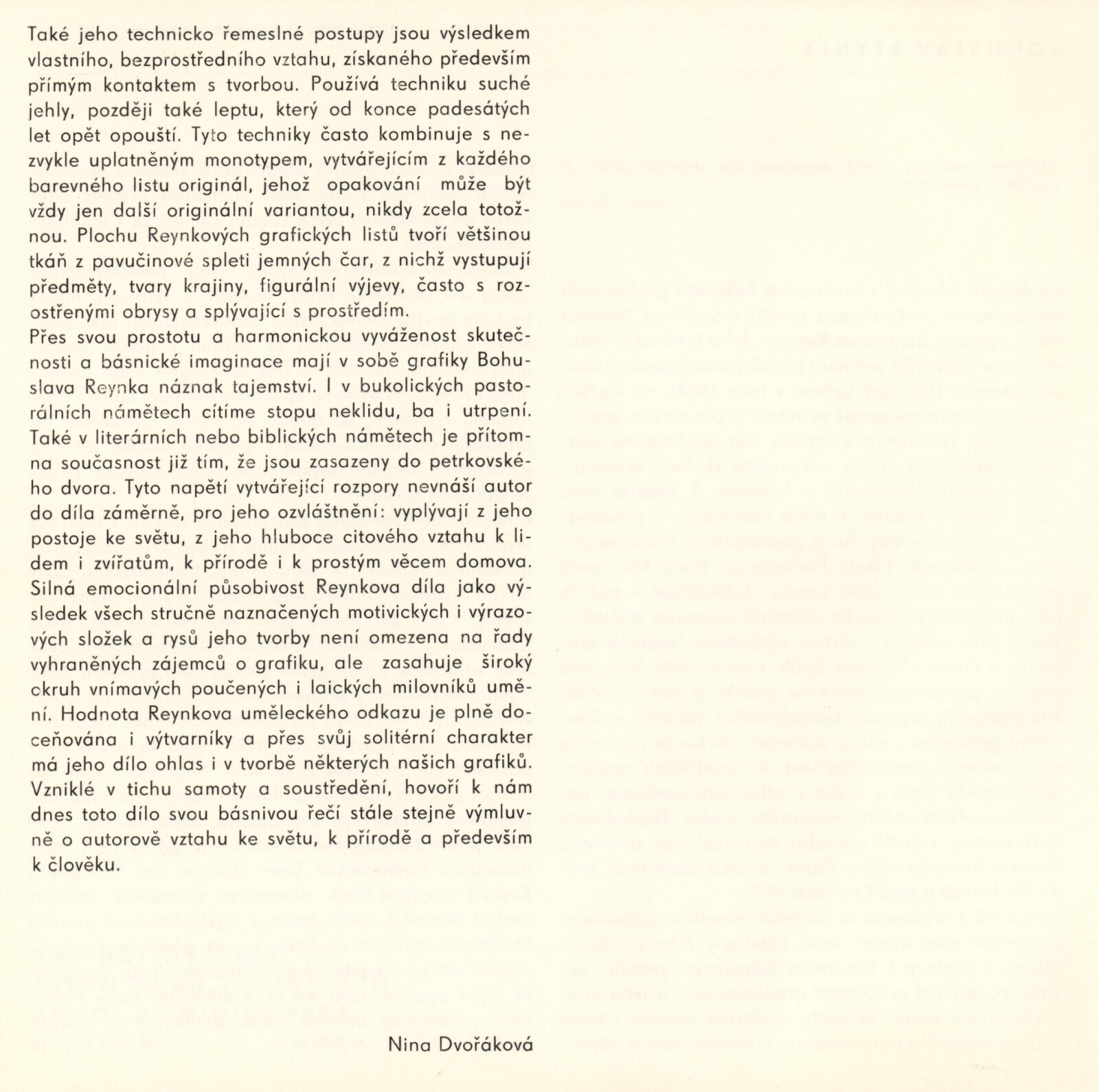 Bohuslav Reynek. Grafika, kresby: Dům umění / Dům pánů z Kunštátu, Kabinet grafiky, 22. 1. – 24. 2. 1985 / Text: Nina Dvořáková. – Brno: DUmB, 1985. – 17 s., obr., životní data, výstavy, DPK 834. – MZK; MG; MMB