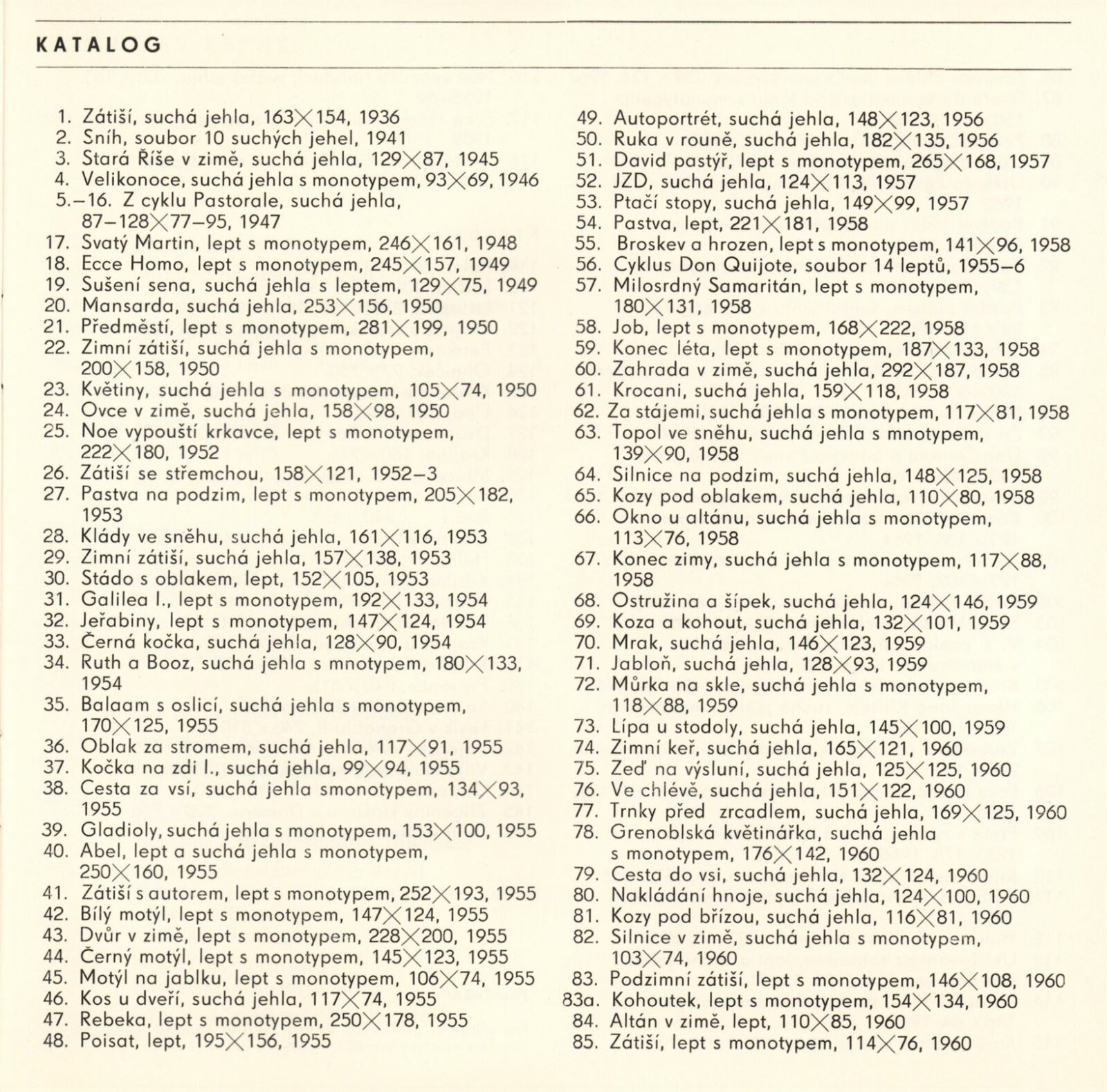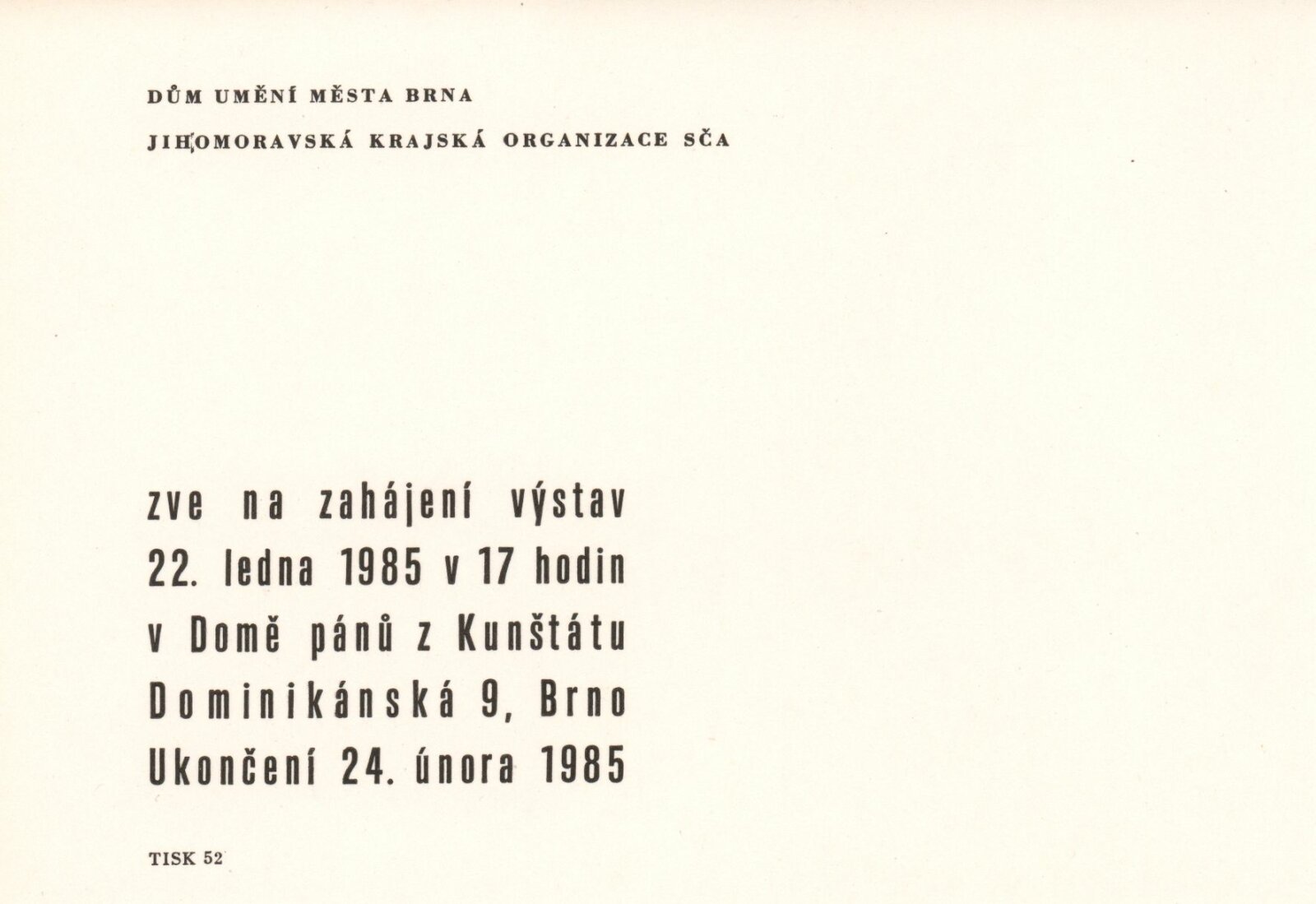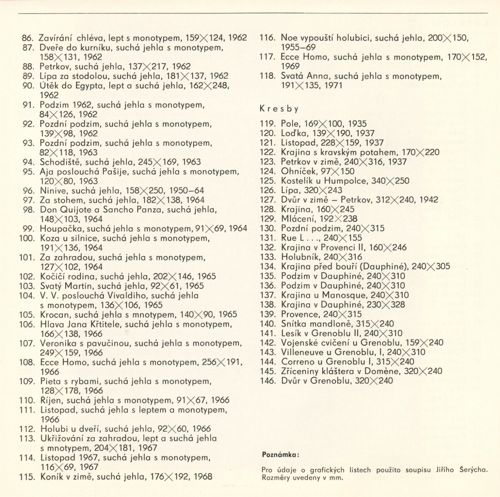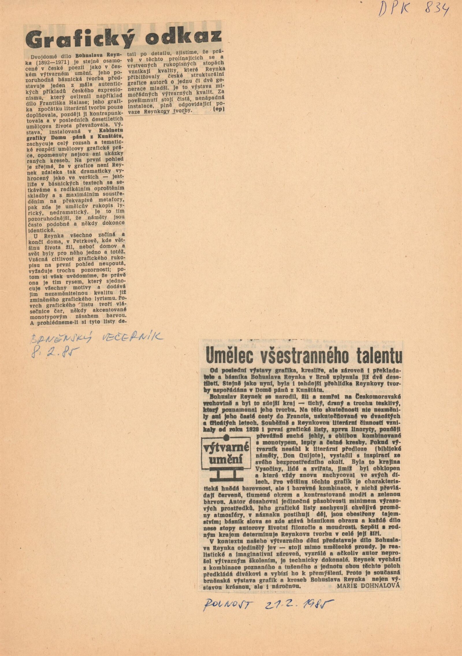 Bohuslav Reynek. Grafika, kresby: Dům umění / Dům pánů z Kunštátu, Kabinet grafiky, 22. 1. – 24. 2. 1985 / Text: Nina Dvořáková. – Brno: DUmB, 1985. – 17 s., obr., životní data, výstavy, DPK 834. – MZK; MG; MMB