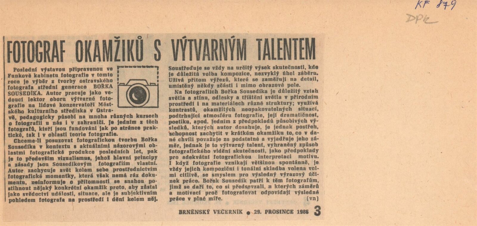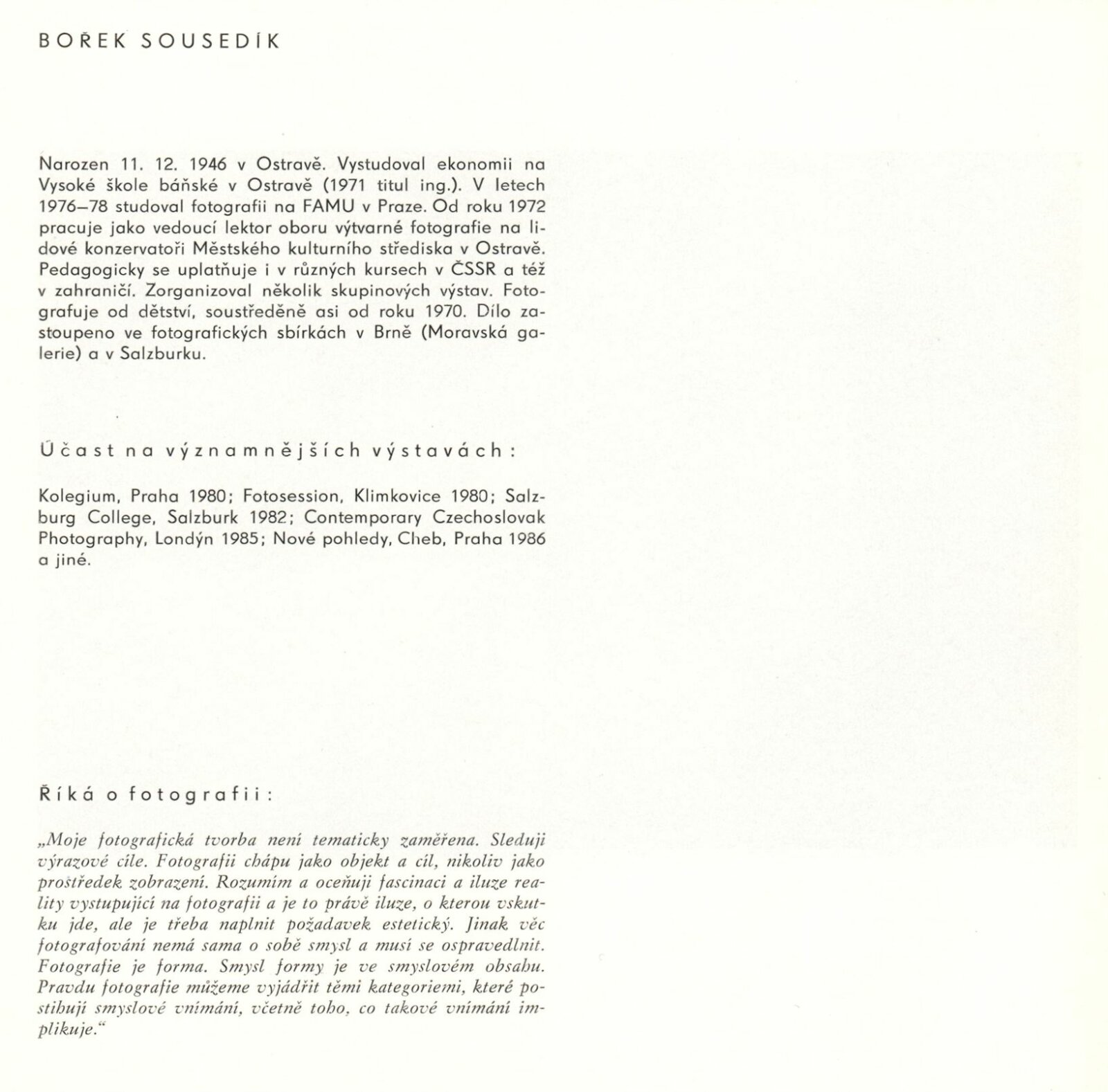 Bořek Sousedík. Fotografie: Dům umění / Dům pánů z Kunštátu, Kabinet fotografie Jaromíra Funka, 16. 12. 1986 – 18. 1. 1987 / Text: Antonín Dufek. – Brno: DUmB, 1986. – [12] s., obr., životopis, výstavy, DPK 879. – MZK; MG; MMB