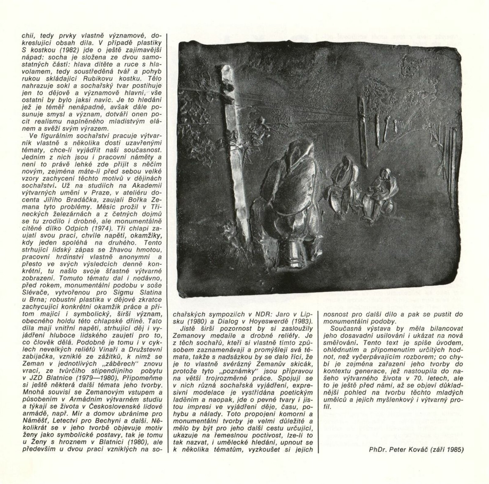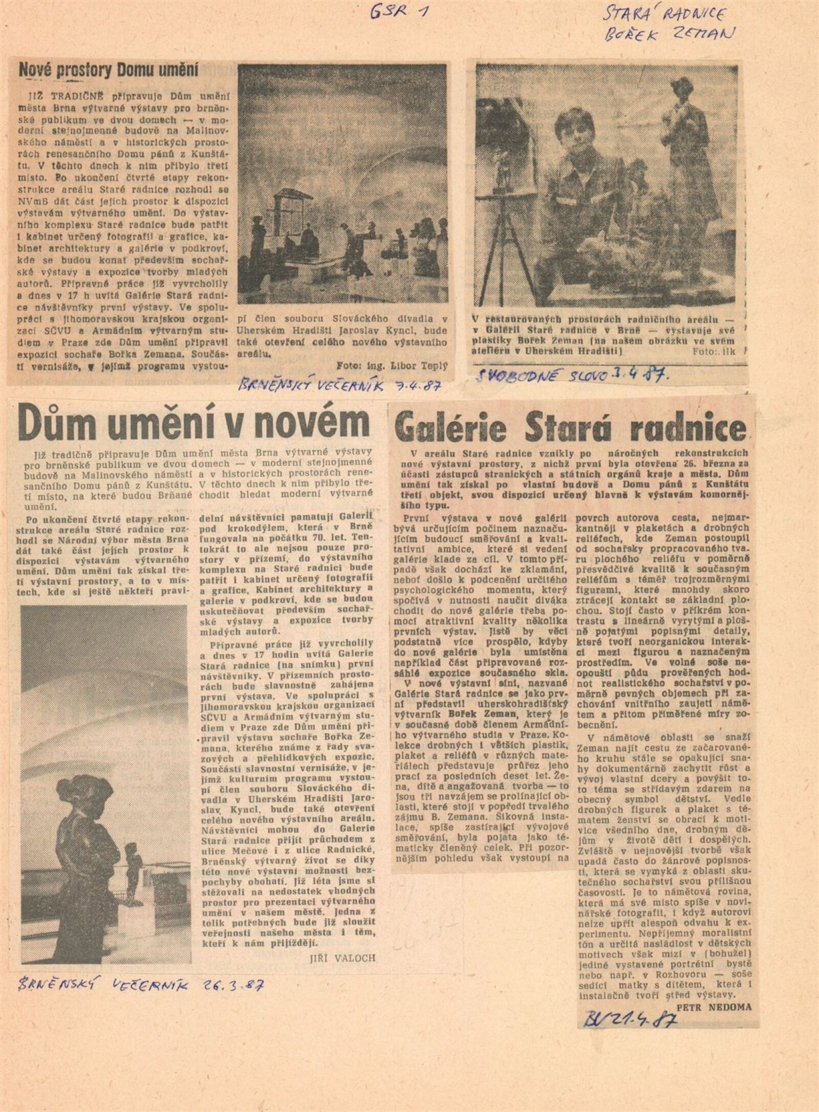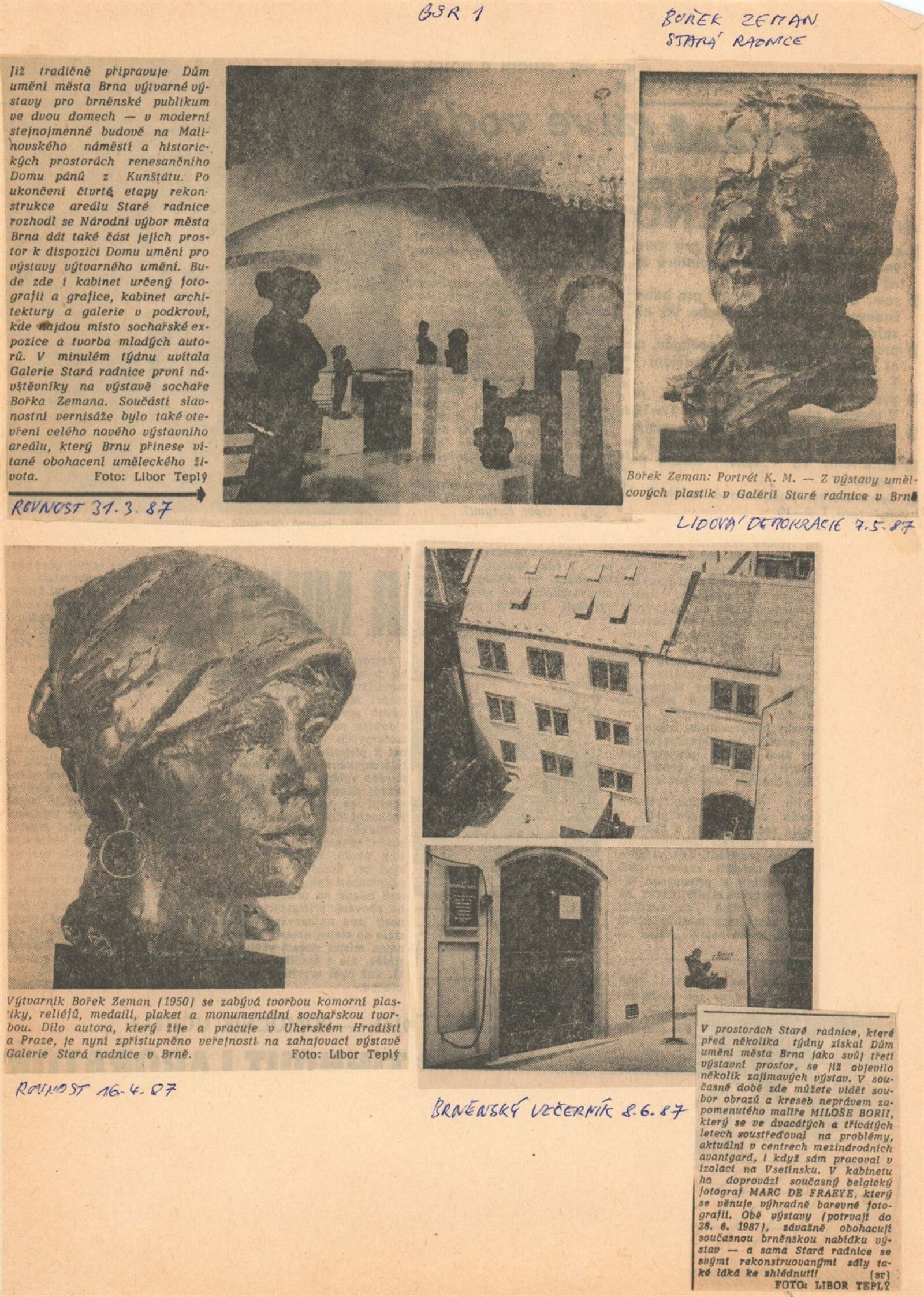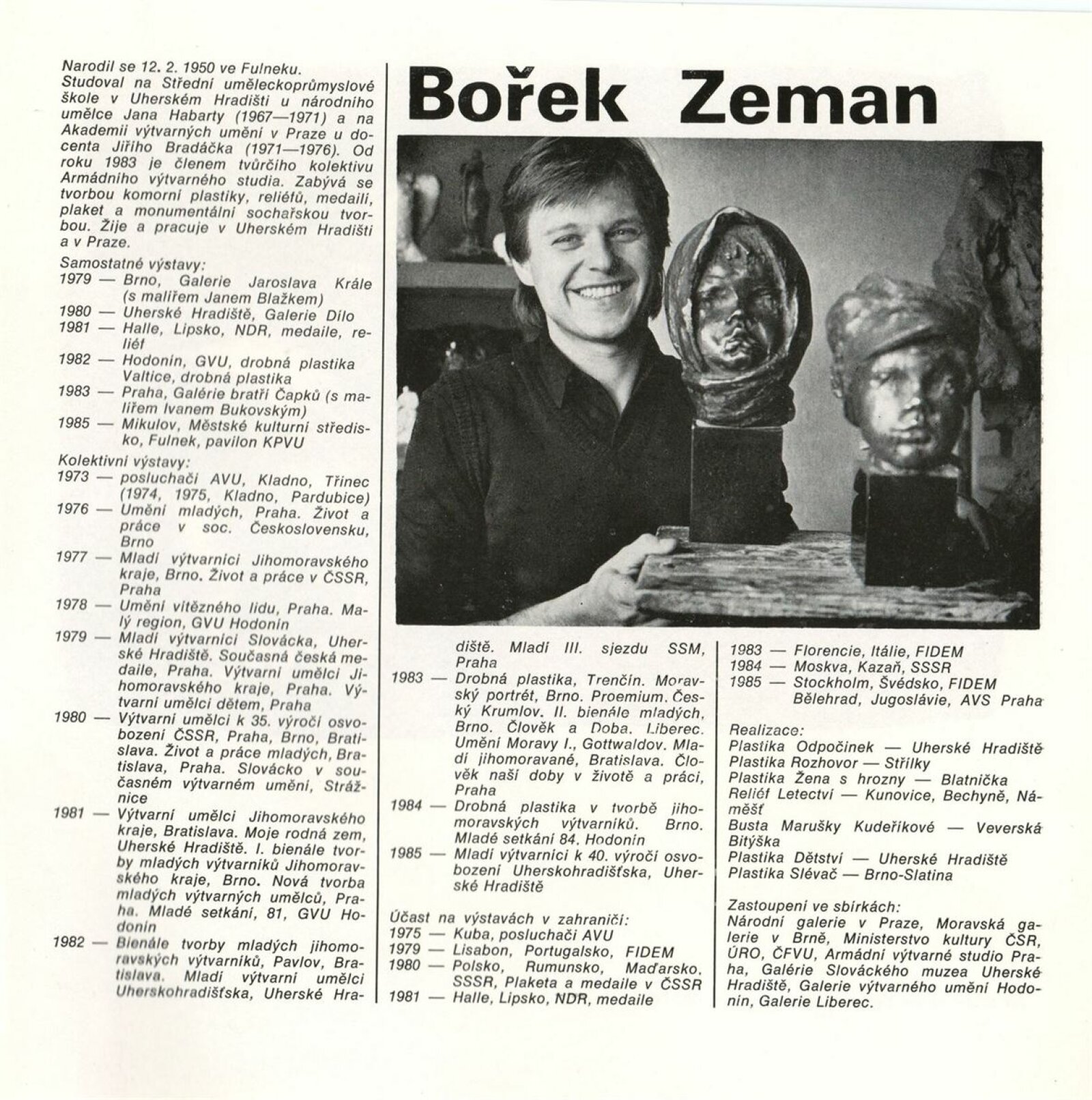 Bořek Zeman. [Plastiky: Galerie Stará radnice, 26. 3. – 10. 5. 1987] / Text :Peter Kováč. – Praha: Armádní výtvarné studio, 1986. – [12] s., obr., portrét, životní data, výstavy, realizace, zastoupení ve sbírkách, slavnostní otevření galerie, GSR 1. – MMB