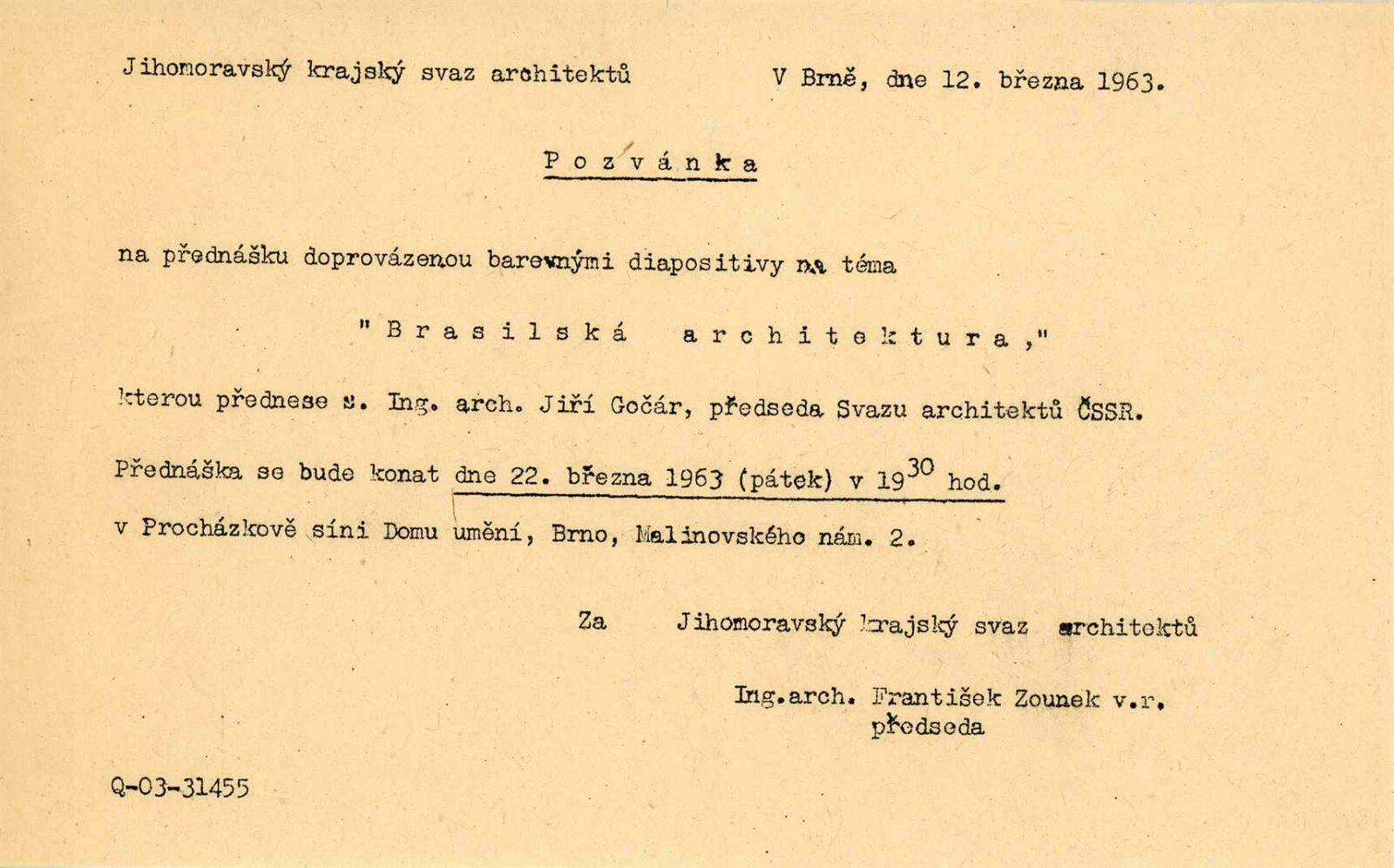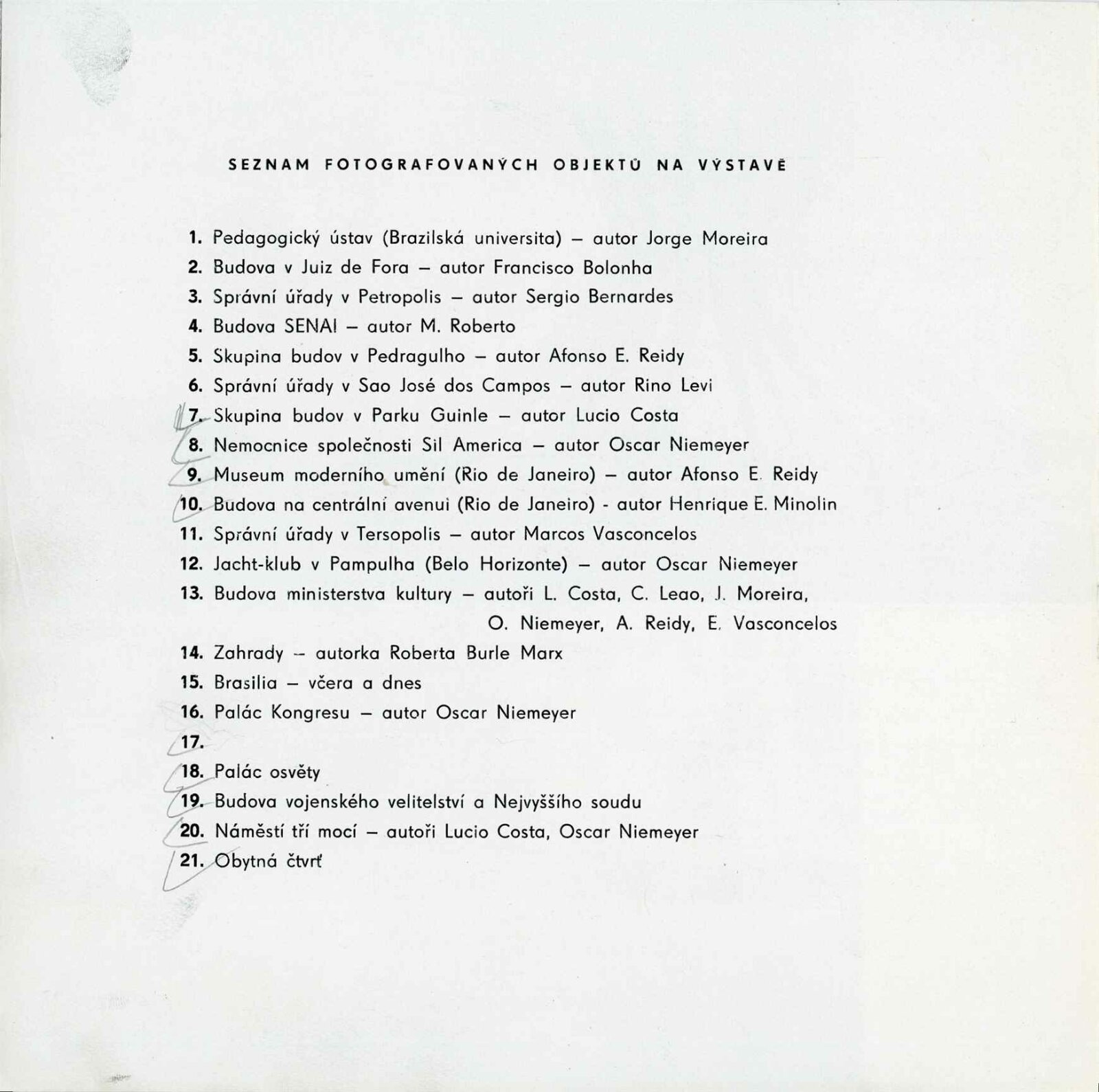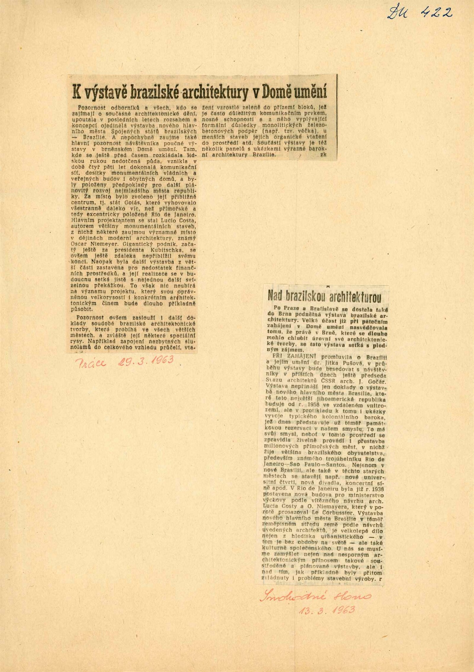 Brazilská architektura: Dům umění města Brna, Galerie Jaroslava Krále, 15. 3. – 31. 3. 1963 / Převzatý katalog. Brazilská architektura: Výstavní síň paláce Dunaj, Praha, leden 1963 / Praha: Ministerstvo školství a kultury, 1963. – 10 s., obr., DU 422. – MG