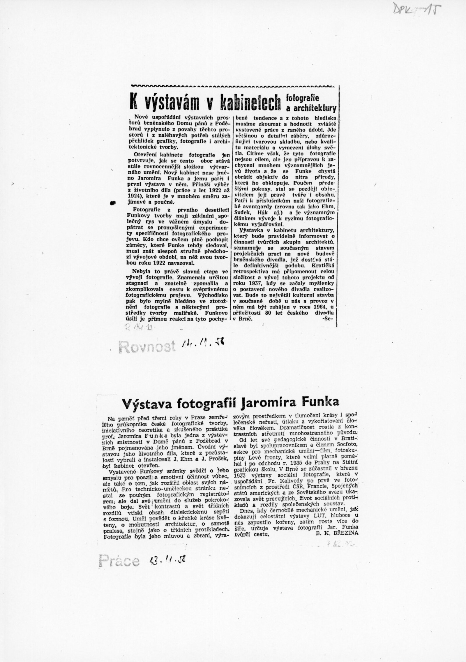 Úvodní výstava v Kabinetu architektury v Domě umění. Název výstavy na pozvánce „Nové brněnské divadlo“ odpovídá názvu projektu před ukončením.