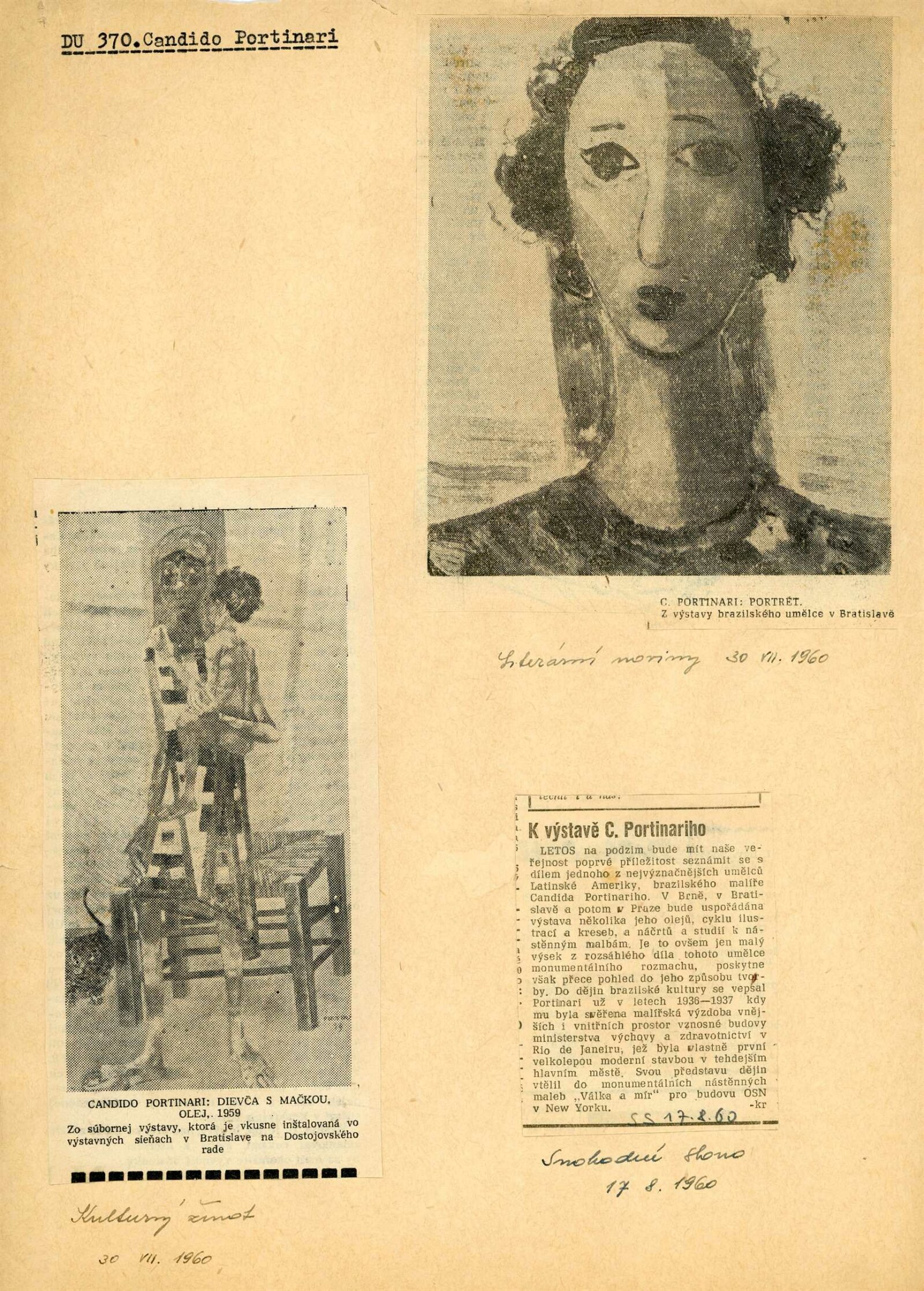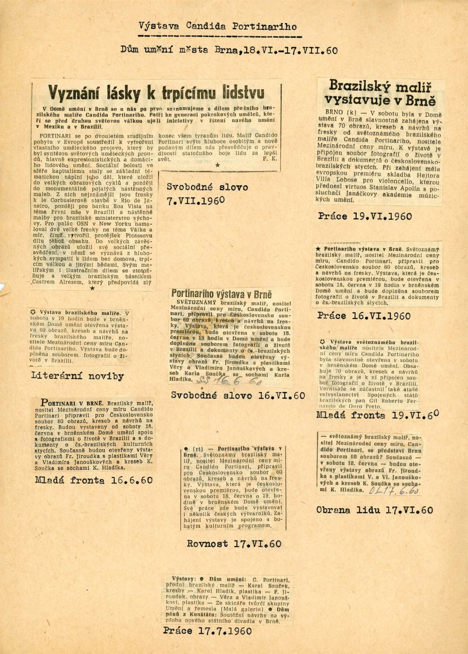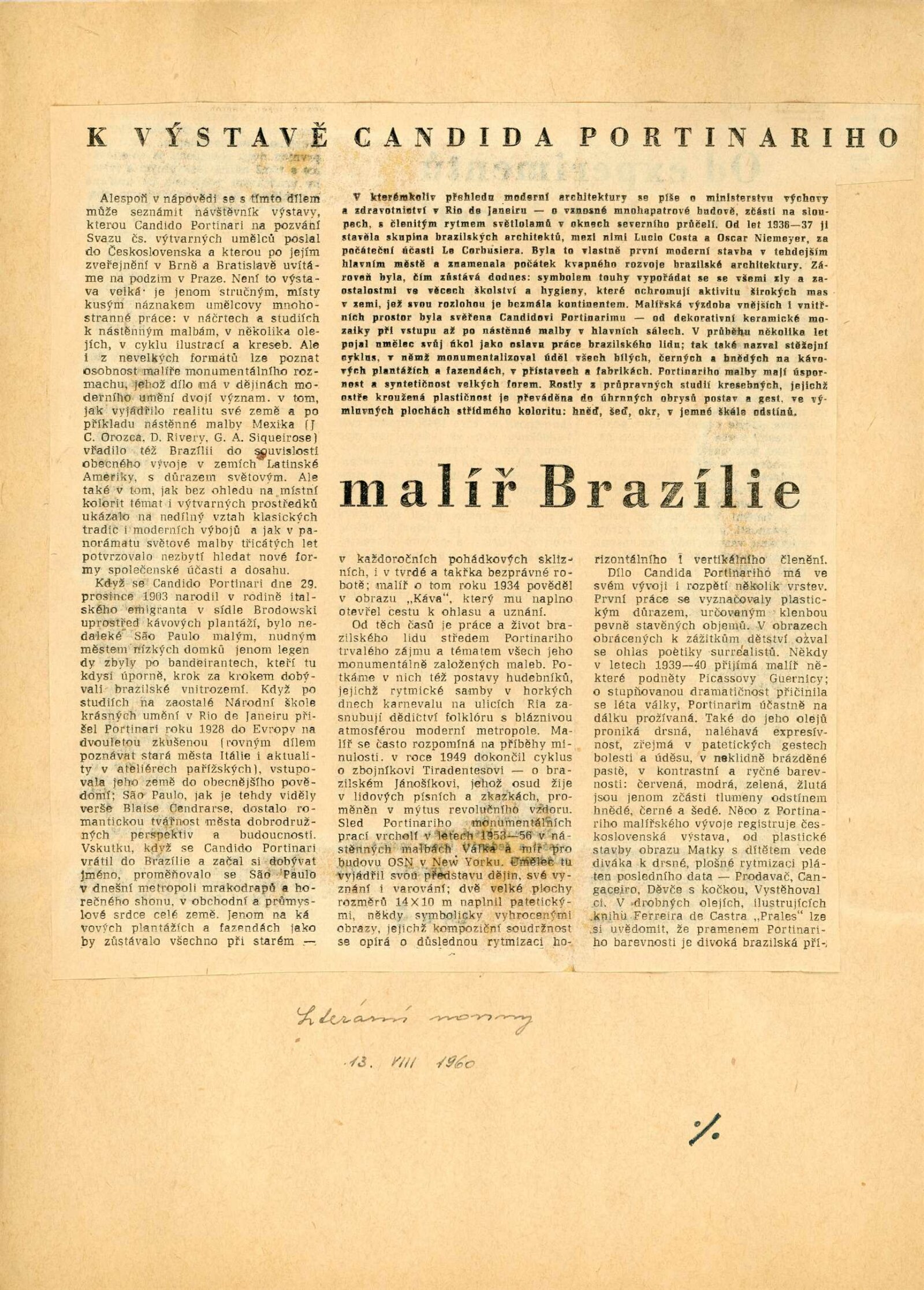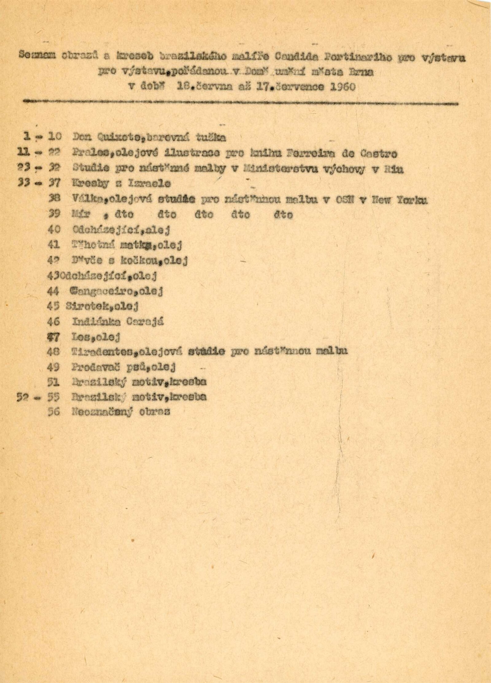 Candido Portinari: Dům umění města Brna, 18. 6. – 17. 7. 1960 / Převzatý katalog. Candido Portinari: Výstavné miestnosti SSVU, Dostojevského rad 2, Bratislava, 22. 7. – 7. 8. 1960 / Text: Ľubor Kára. – Bratislava: SFVU, 1960. – 8 s., obr., DU 374. – UPM