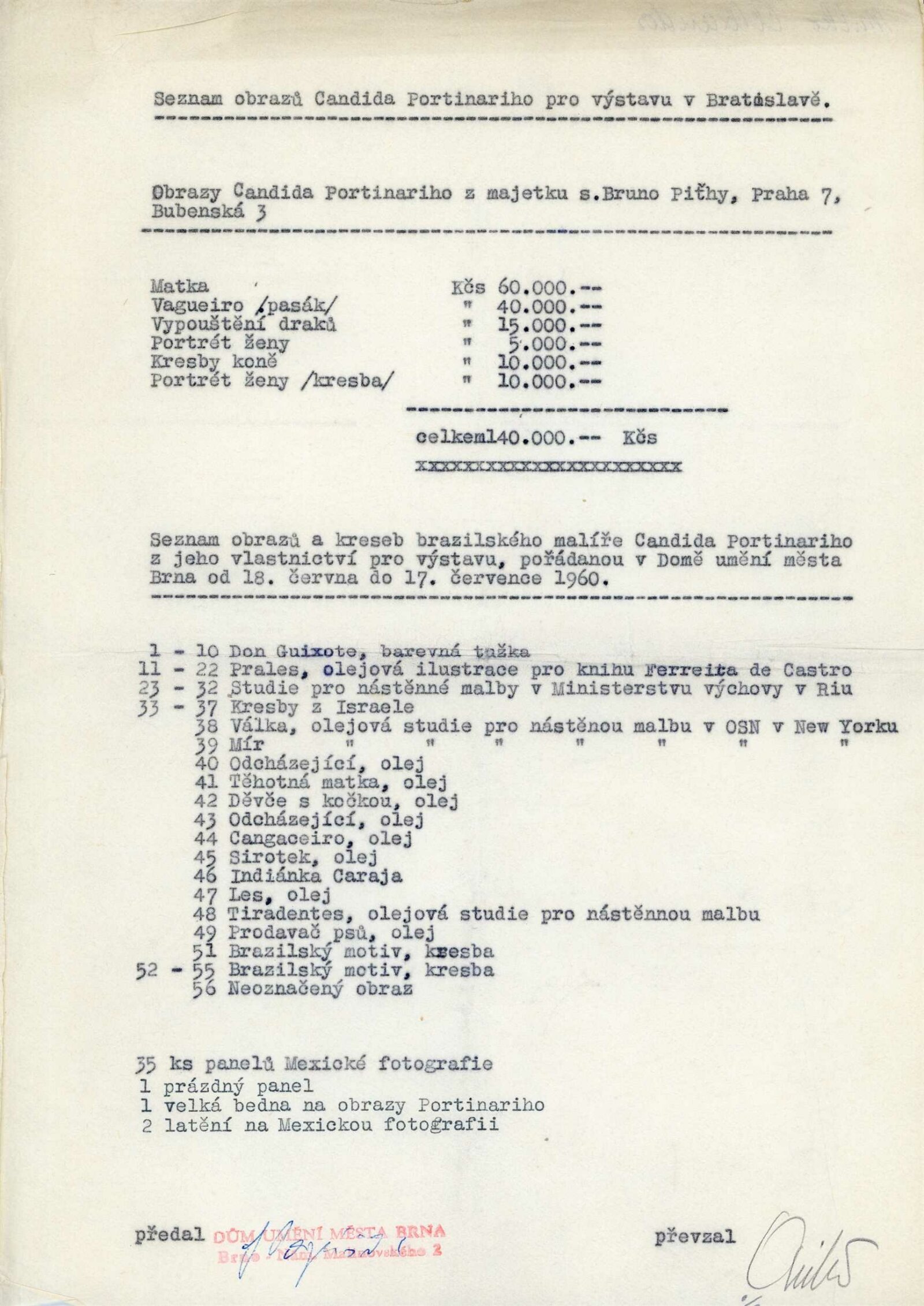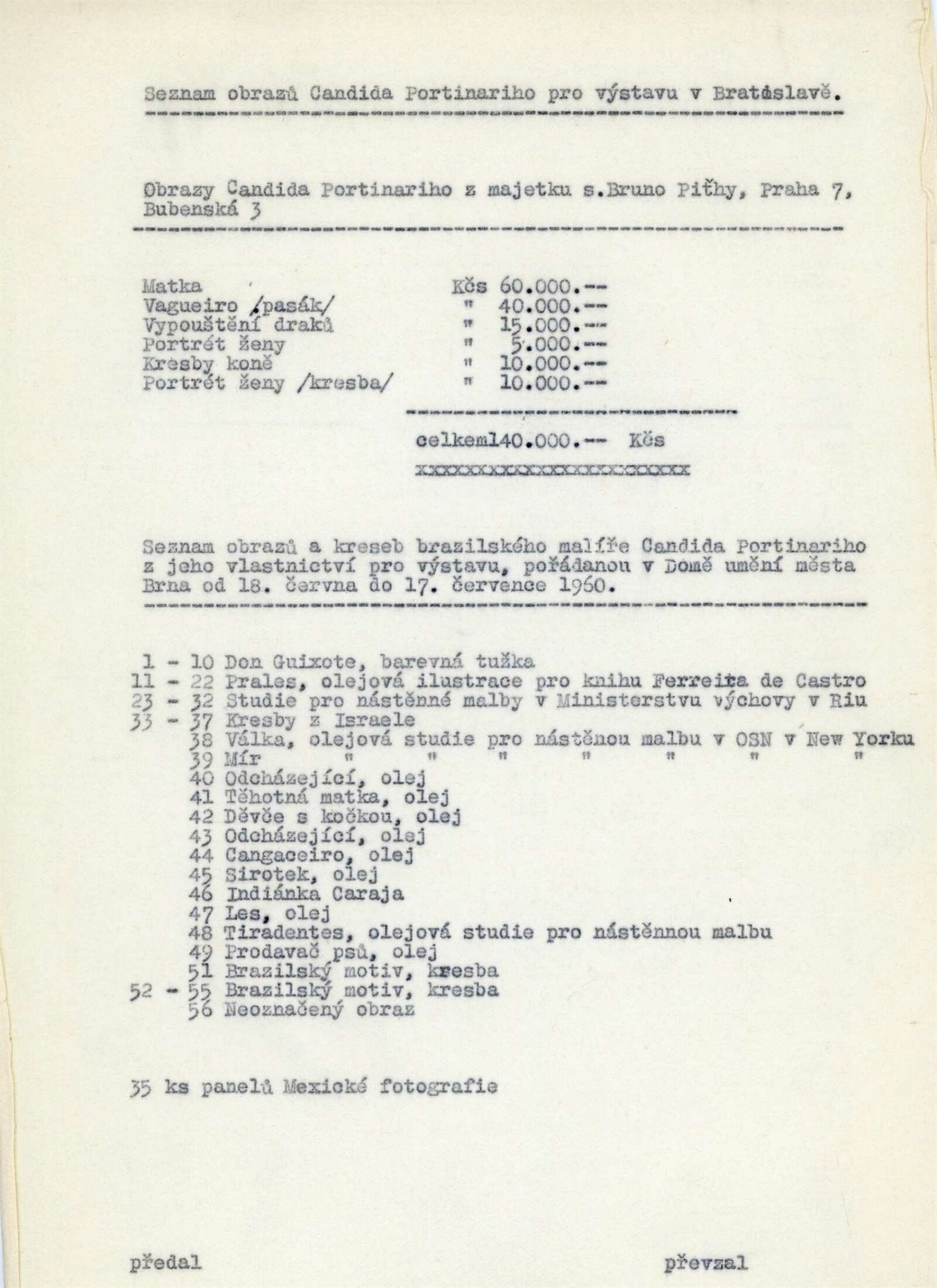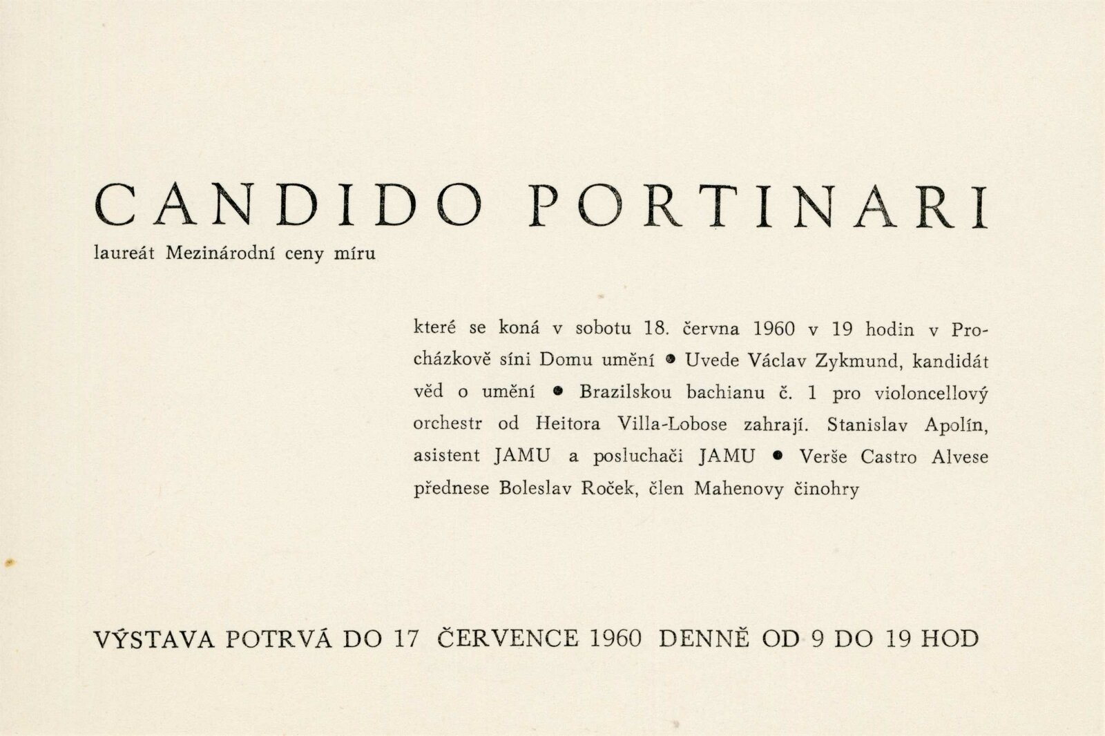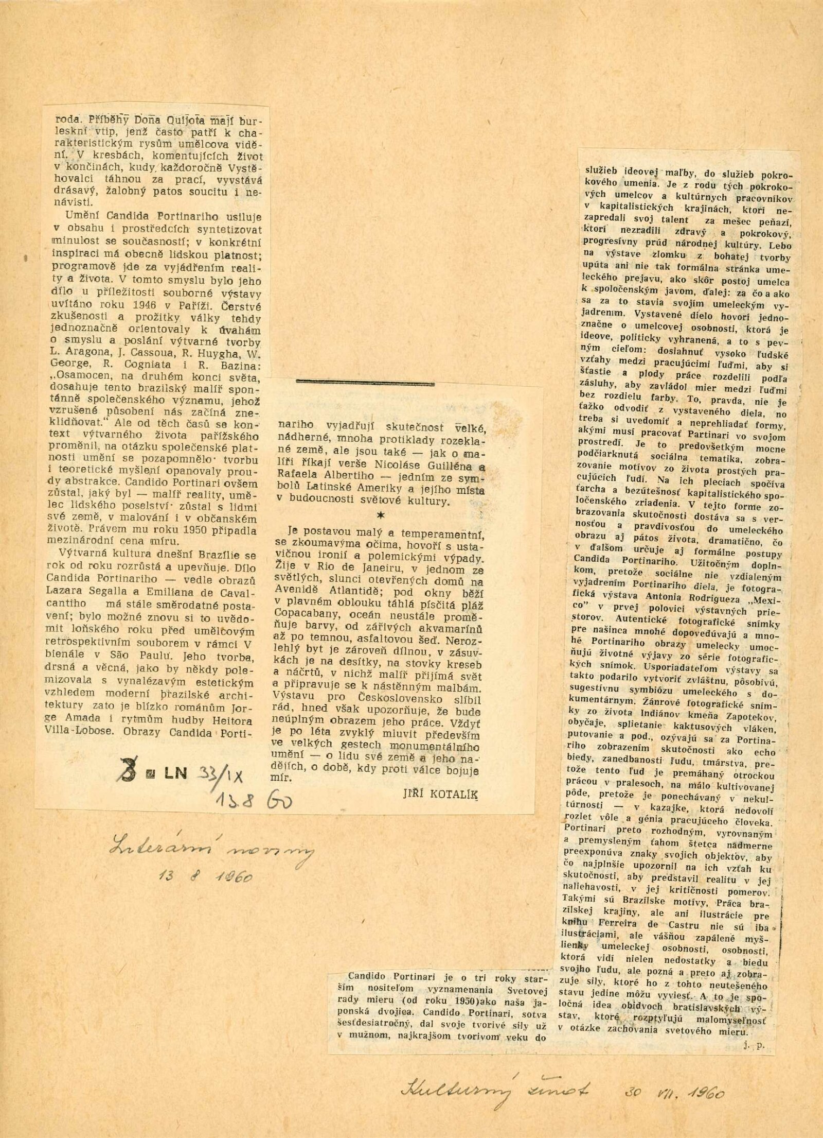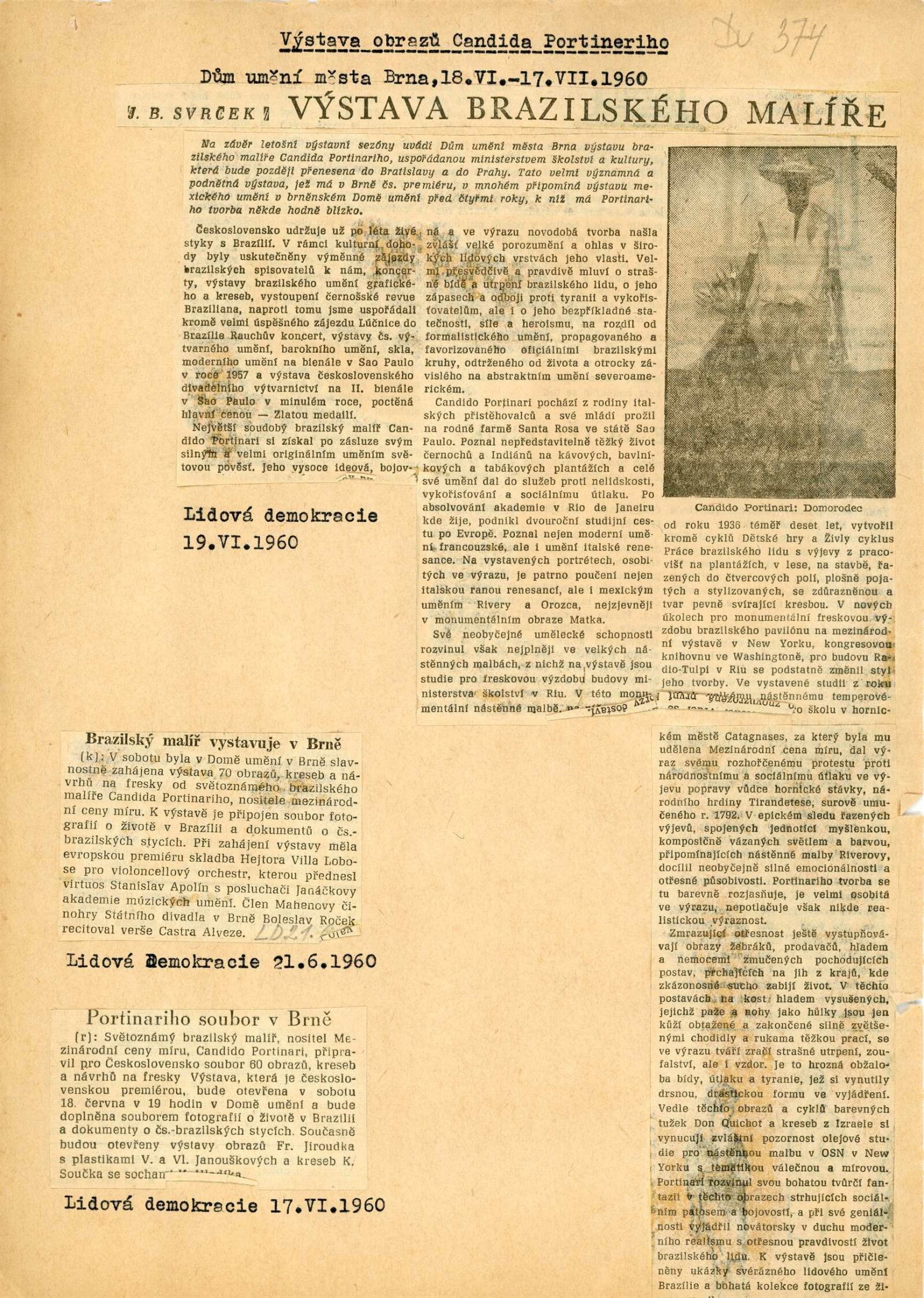 Candido Portinari: Dům umění města Brna, 18. 6. – 17. 7. 1960 / Převzatý katalog. Candido Portinari: Výstavné miestnosti SSVU, Dostojevského rad 2, Bratislava, 22. 7. – 7. 8. 1960 / Text: Ľubor Kára. – Bratislava: SFVU, 1960. – 8 s., obr., DU 374. – UPM