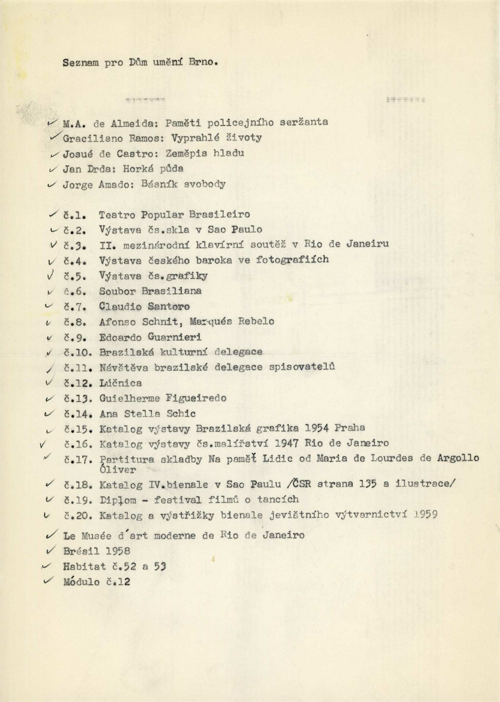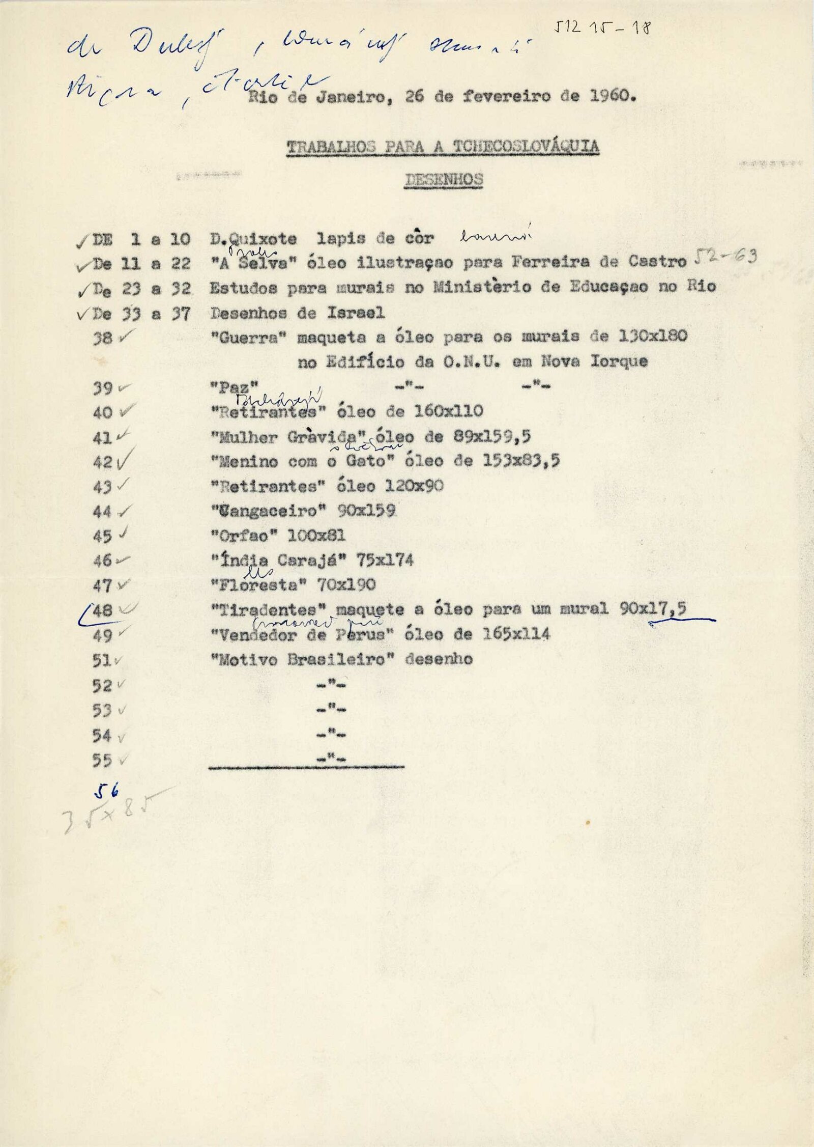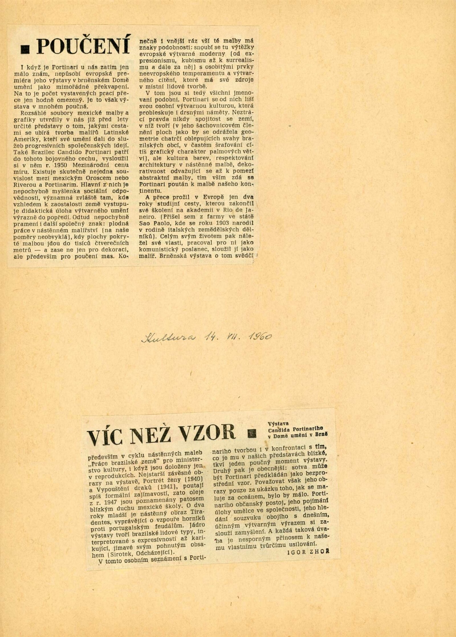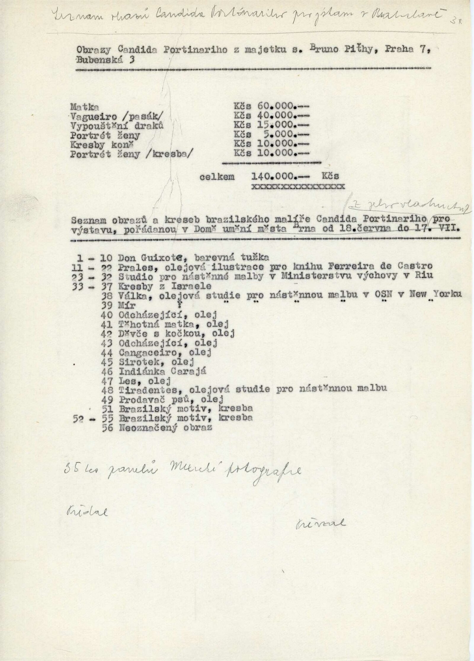 Candido Portinari: Dům umění města Brna, 18. 6. – 17. 7. 1960 / Převzatý katalog. Candido Portinari: Výstavné miestnosti SSVU, Dostojevského rad 2, Bratislava, 22. 7. – 7. 8. 1960 / Text: Ľubor Kára. – Bratislava: SFVU, 1960. – 8 s., obr., DU 374. – UPM
