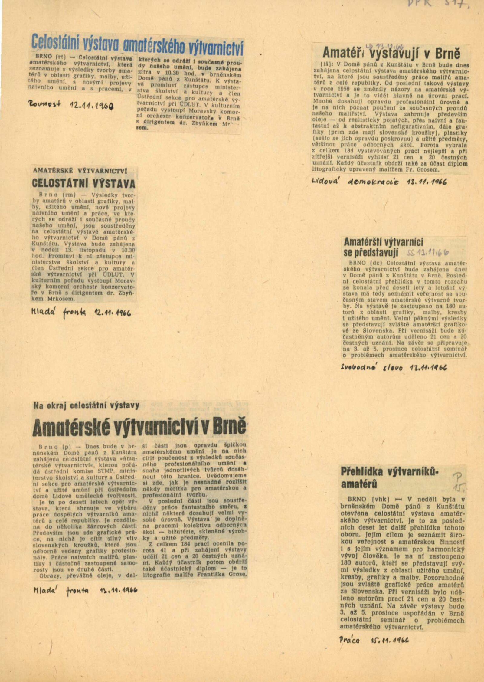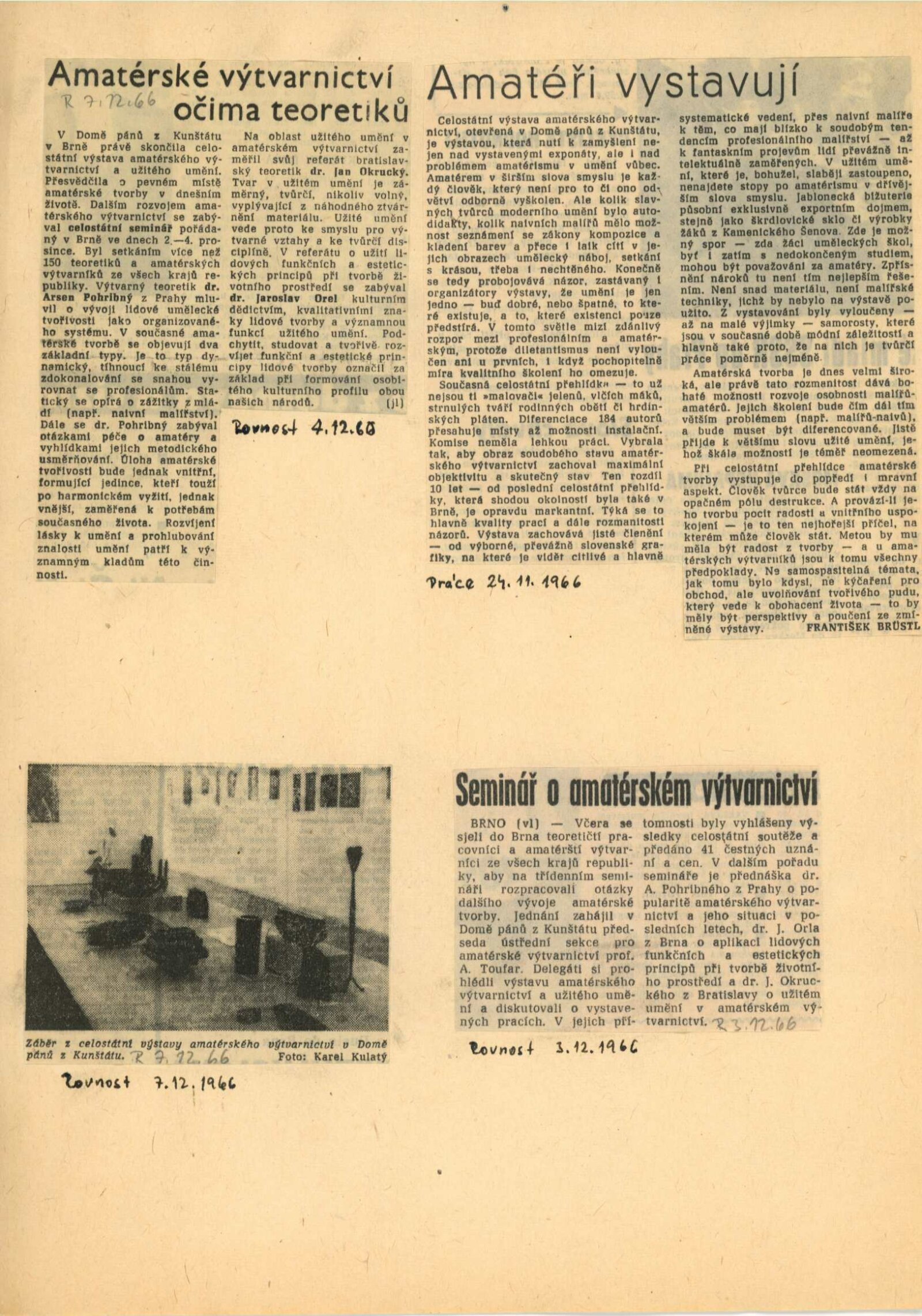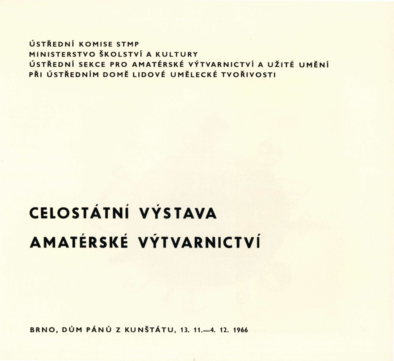 Celostátní výstava amatérské výtvarnictví: Dům umění města Brna / Dům pánů z Kunštátu, 13. 11. – 4. 12. 1966 / Texty: Alois Troufar, Jarmila Velká. – Praha: Ústřední komise SMTP, 1966. – 14 s., obr., seznam vystavených prací 8 s., DPK 317; MZK; MG