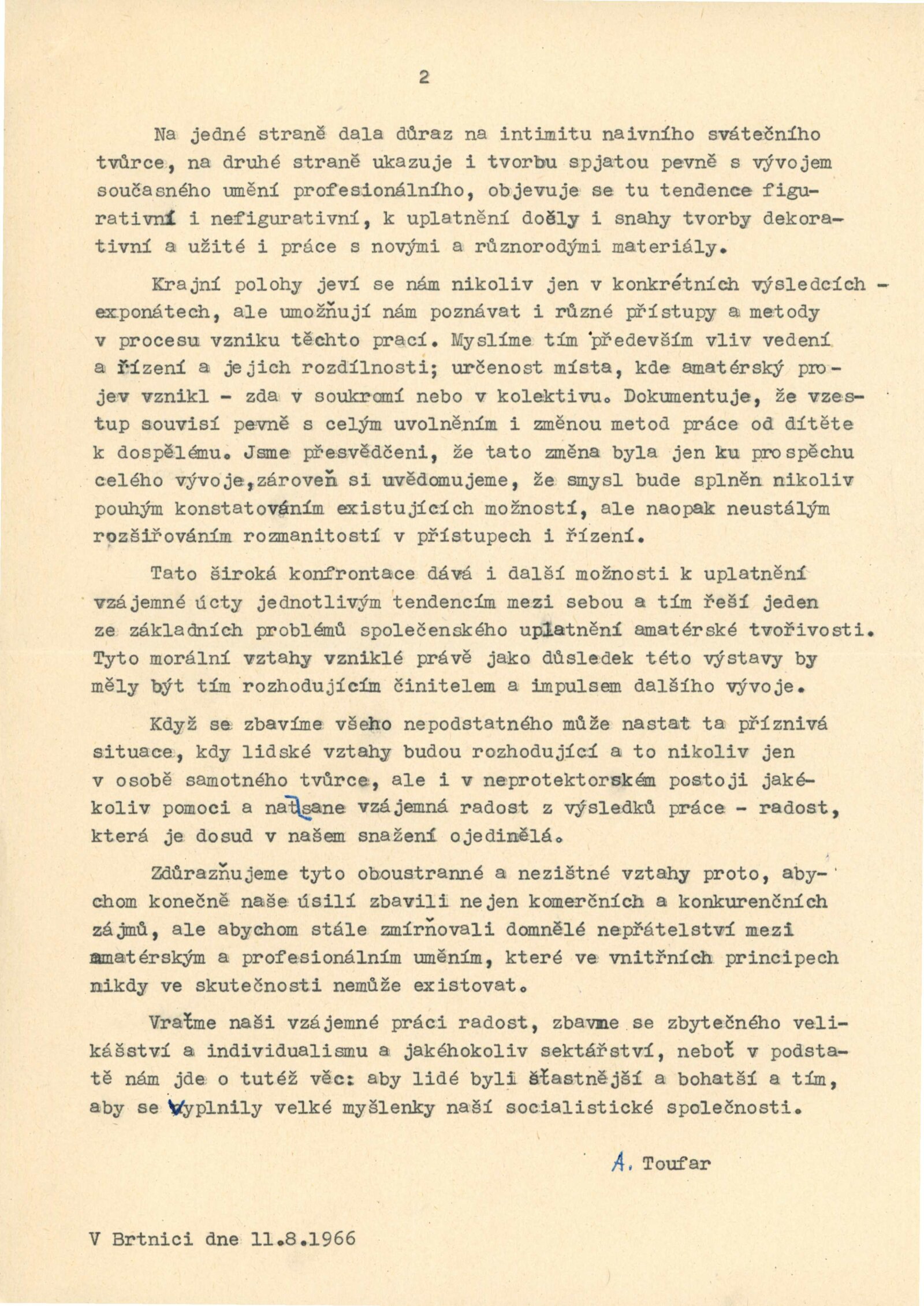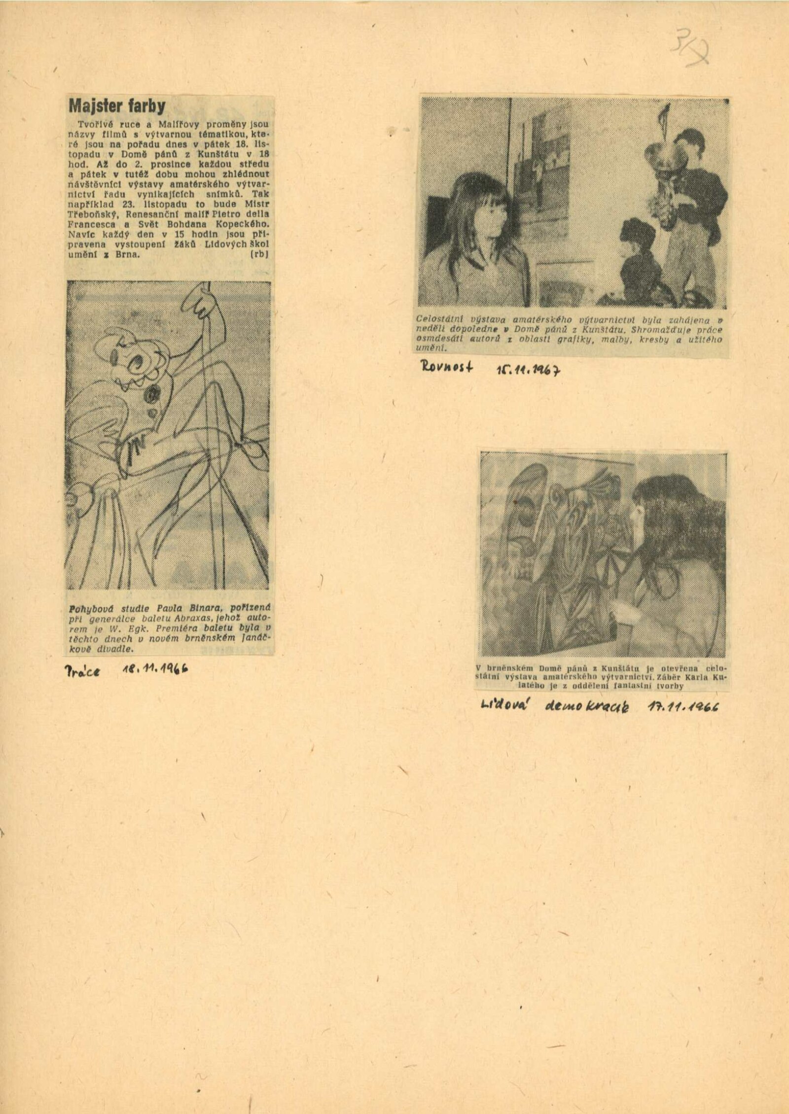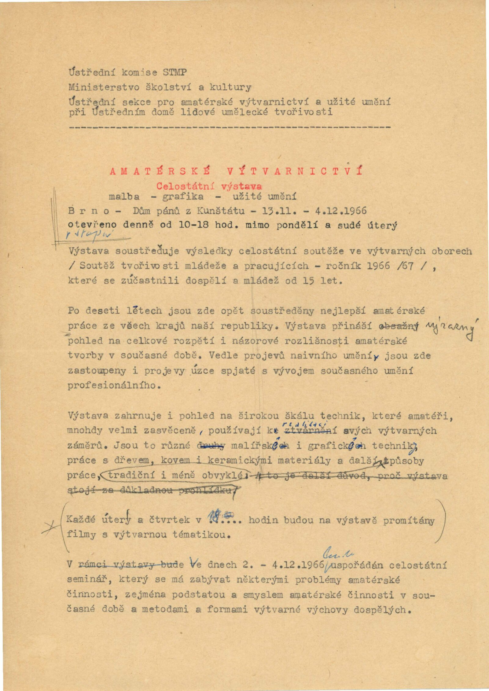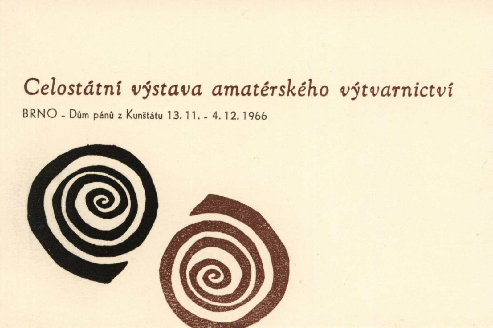 Celostátní výstava amatérské výtvarnictví: Dům umění města Brna / Dům pánů z Kunštátu, 13. 11. – 4. 12. 1966 / Texty: Alois Troufar, Jarmila Velká. – Praha: Ústřední komise SMTP, 1966. – 14 s., obr., seznam vystavených prací 8 s., DPK 317; MZK; MG