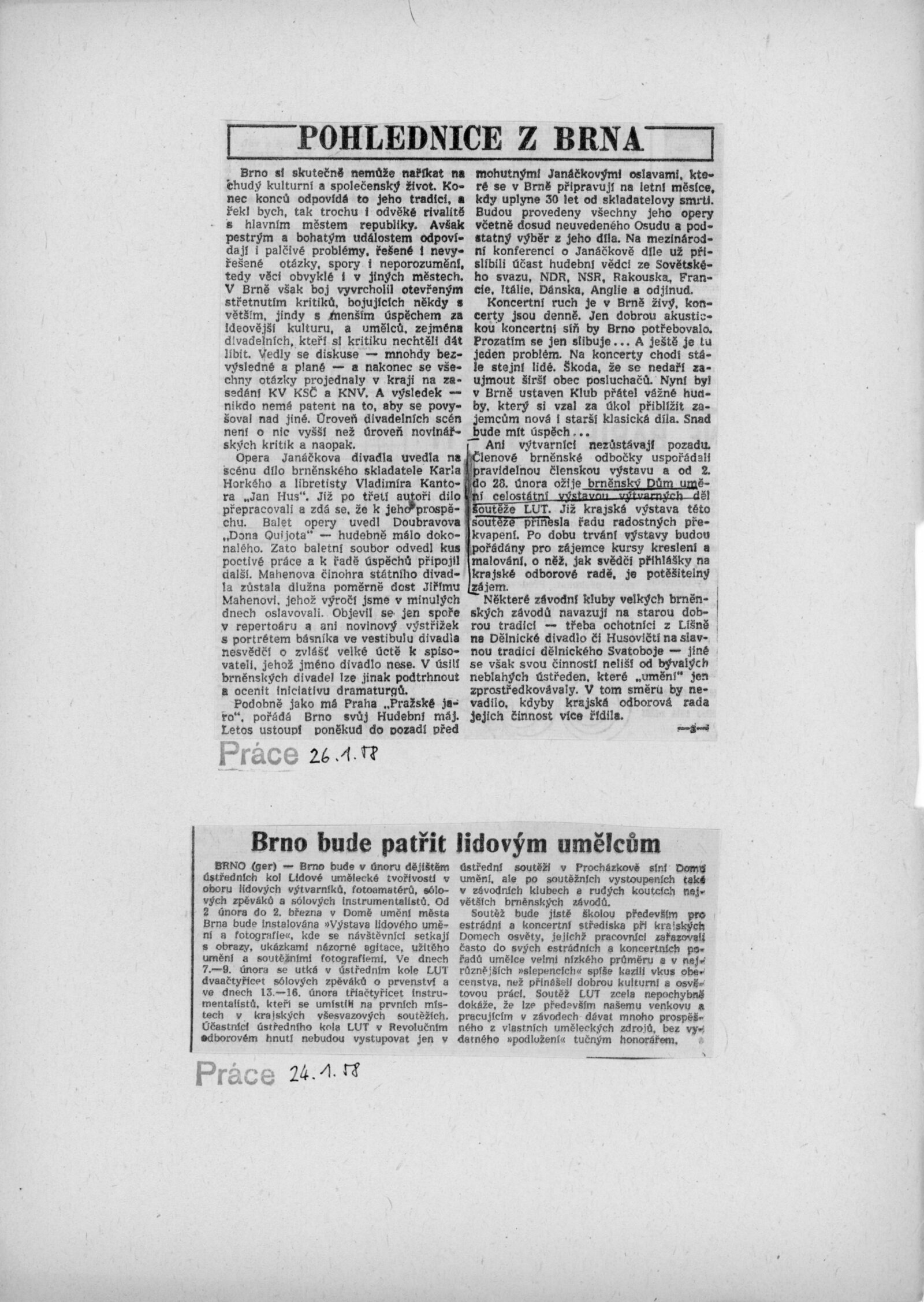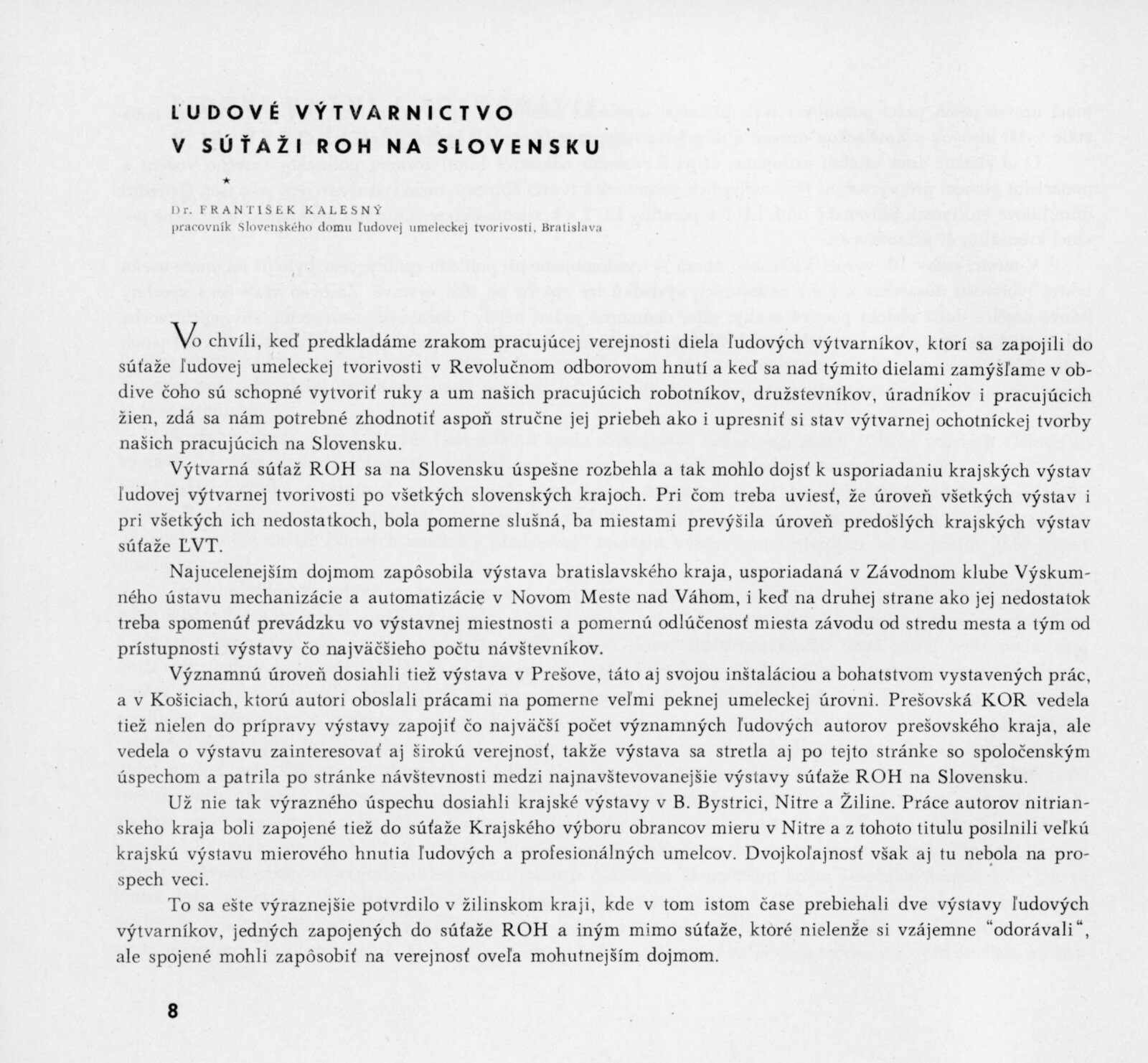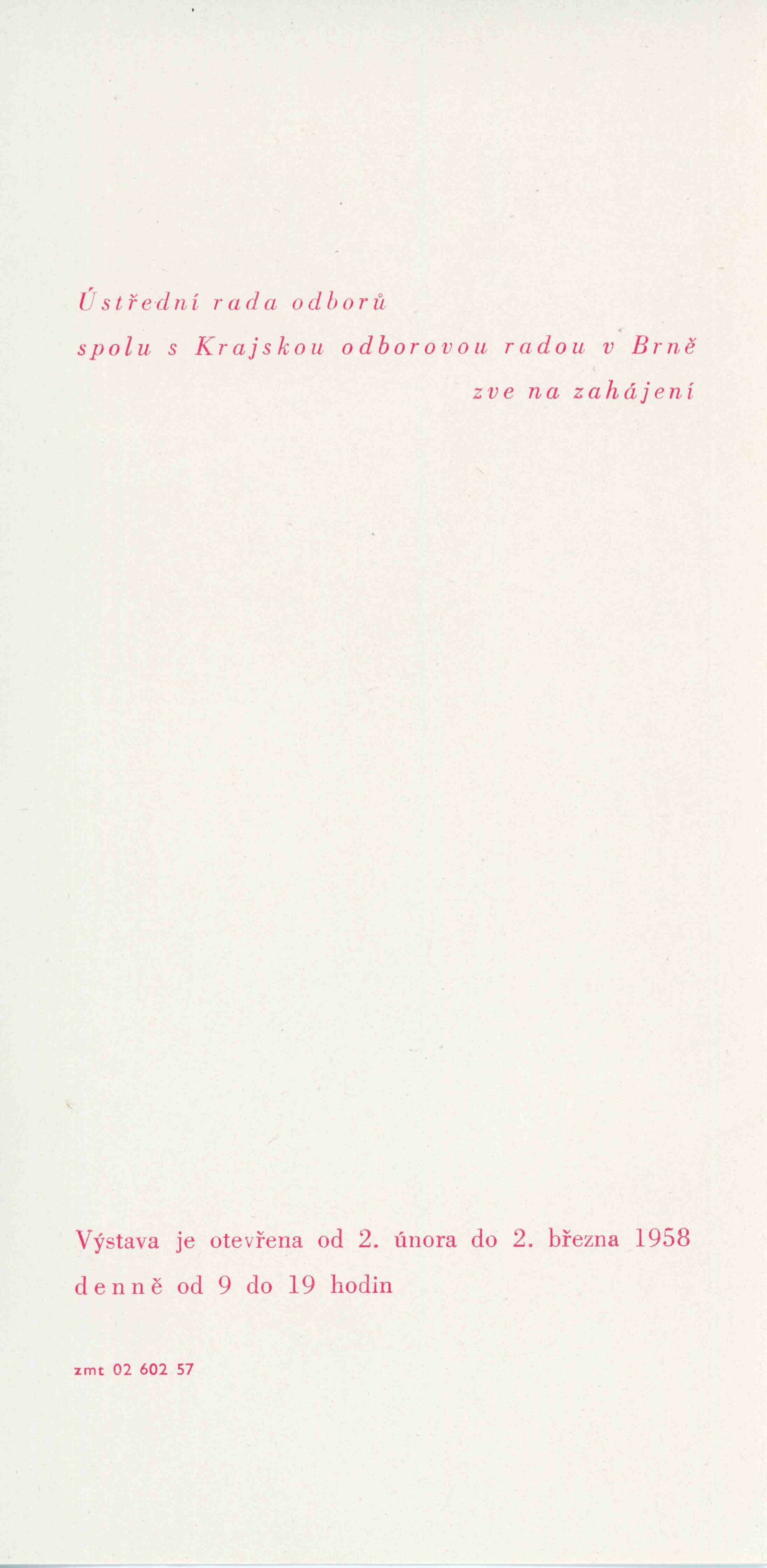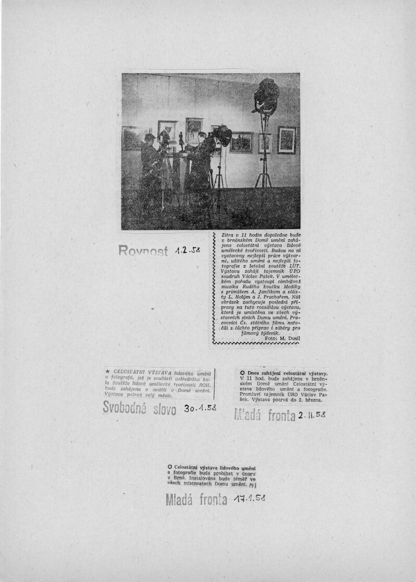 Celostátní výstava lidového umění a fotografie k 10. výročí Vítězného února: Dům umění Brno, 2. 2. – 2. 3. 1958 / Texty: Robert Kheck, Ivana Angelová, František Kalesný, Stanislav Pecha, Ladislav Noel. – Praha: Ústřední rada odborů, 1958. – 34 s., 12 s. obr. příl., DU 304. – MG