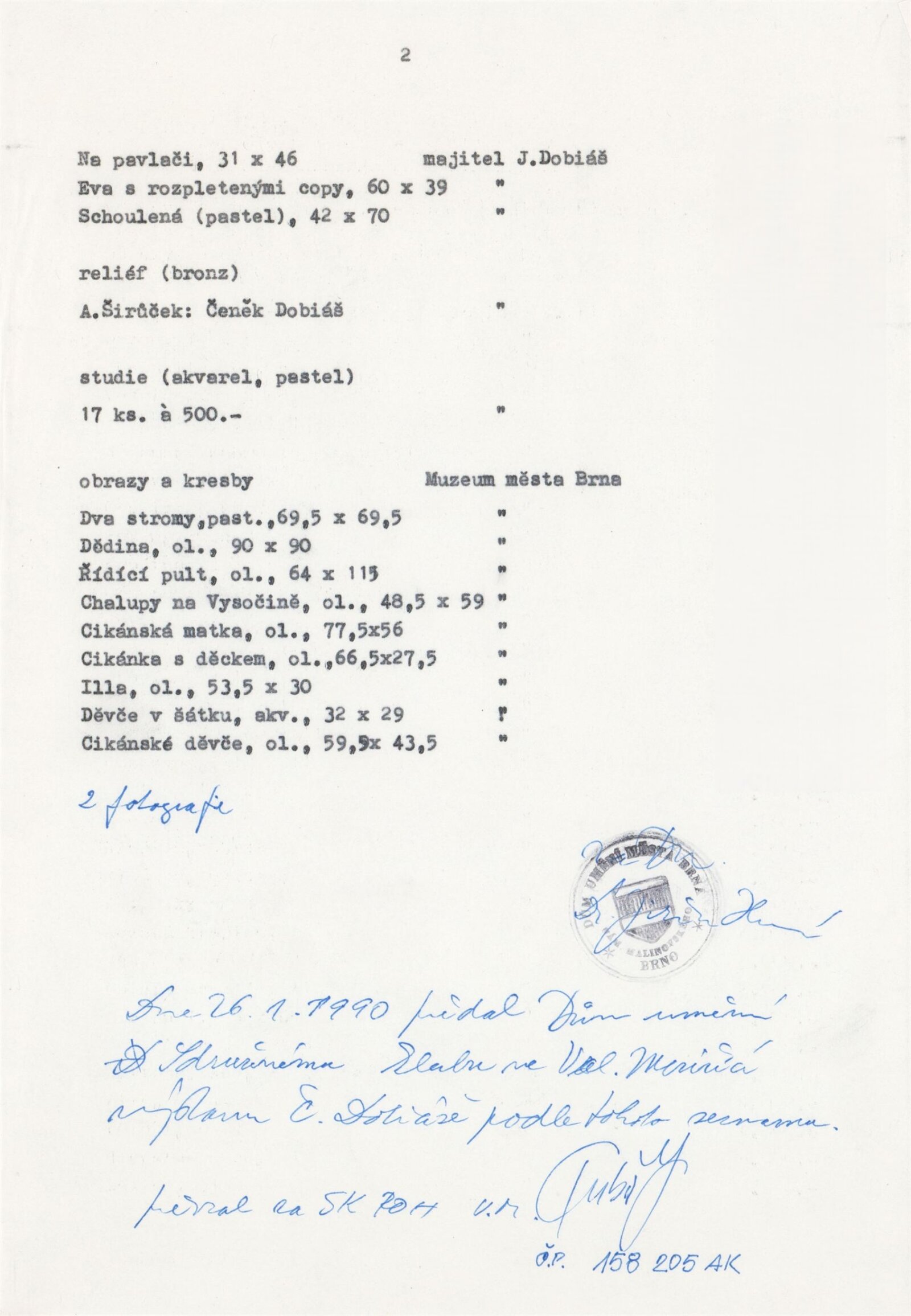 pozvánka, katalog, část strojopisu, seznam vystavených děl, korespondence (1990-1987), smlouva o spolupořádání, žádost o výstavu, recenze v tisku, pozvánka na výstavu Čeňka Dobiáše v Novém Městě na Moravě (1989) a ve Velkém Meziříčí ( 1990)