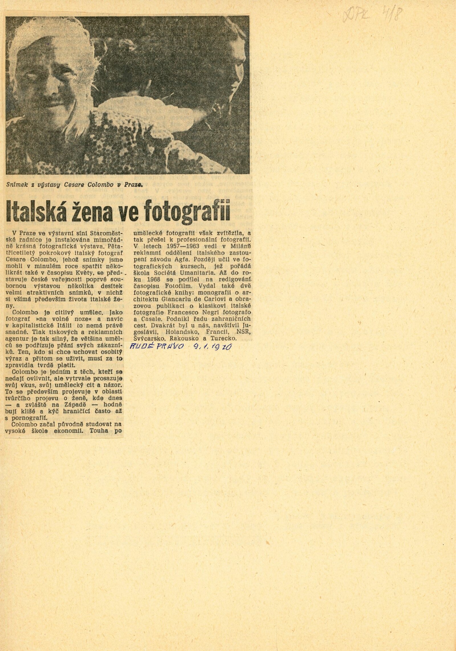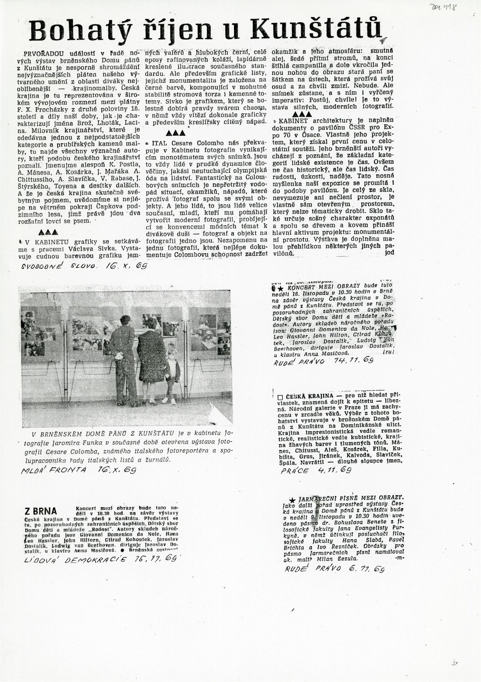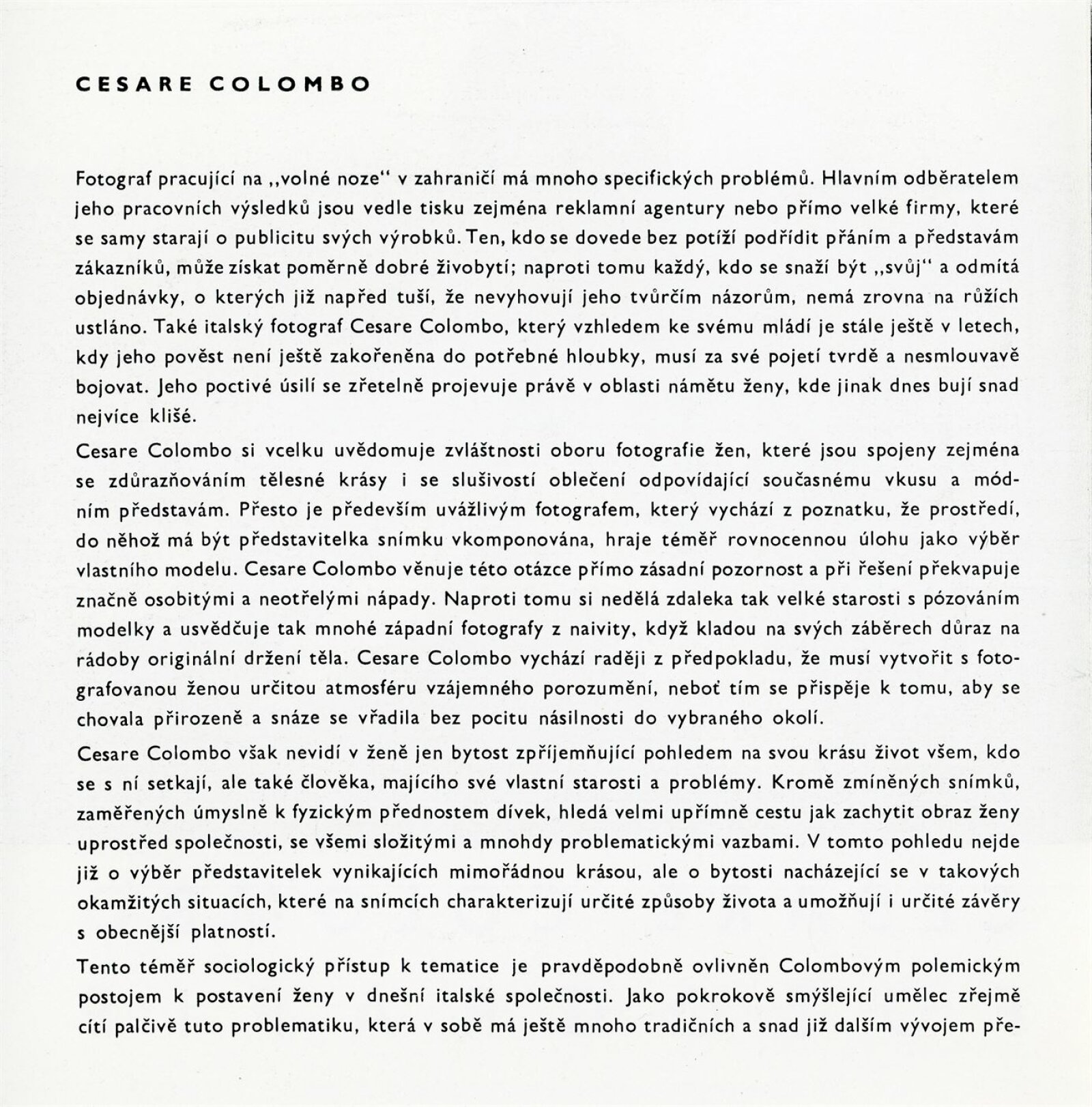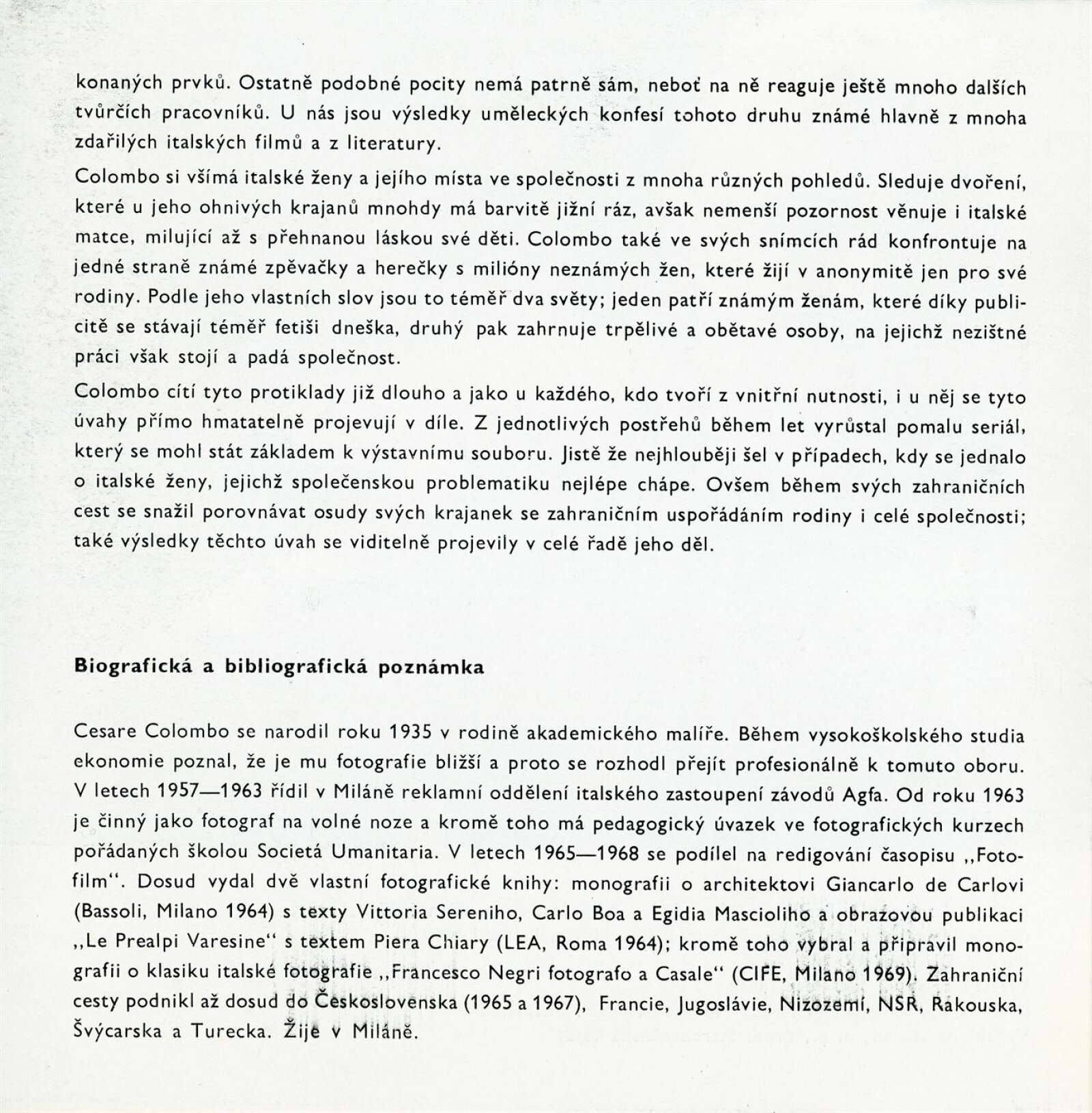 Cesare Colombo /IT/ Fotografie: Dům umění města Brna / Dům pánů z Kunštátu, 100. výstava Kabinetu fotografie Jaromíra Funka, 3. 10. – 2. 11. 1969 / Text: Petr Tausk. – Brno: DUmB, 1969. – 4 s., obr., životní data, bibliografie, DPK 418. – MZK; MG