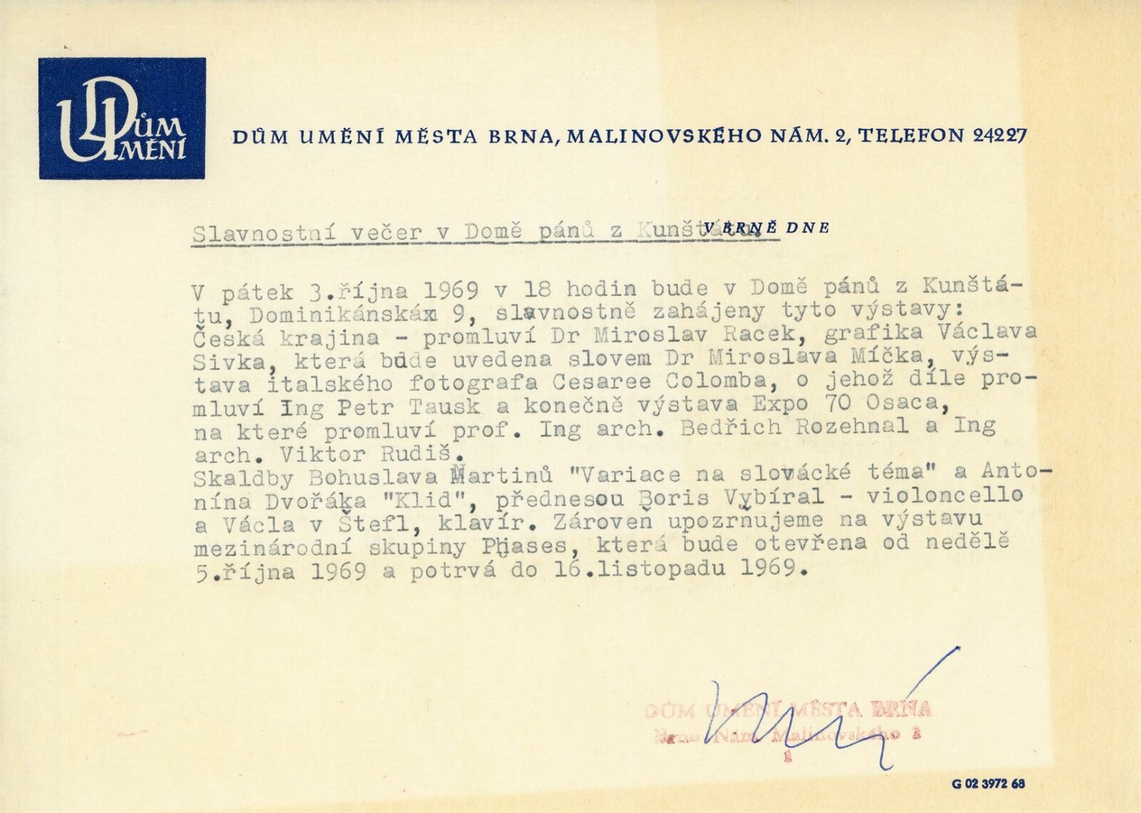 společná pozvánka DPK 417–419, katalog, strojopis katalogu, strojopis textu pro rozhlas, fotografie pro katalog, korespondence (příprava výstavy – Petr Tausk / DU, převzetí výstavy GHMP po ukončení v Brně, provozní korespondence, zaslání materiálů k výstavě – C. Colombo), potvrzení o převzetí výstavy, recenze v tisku