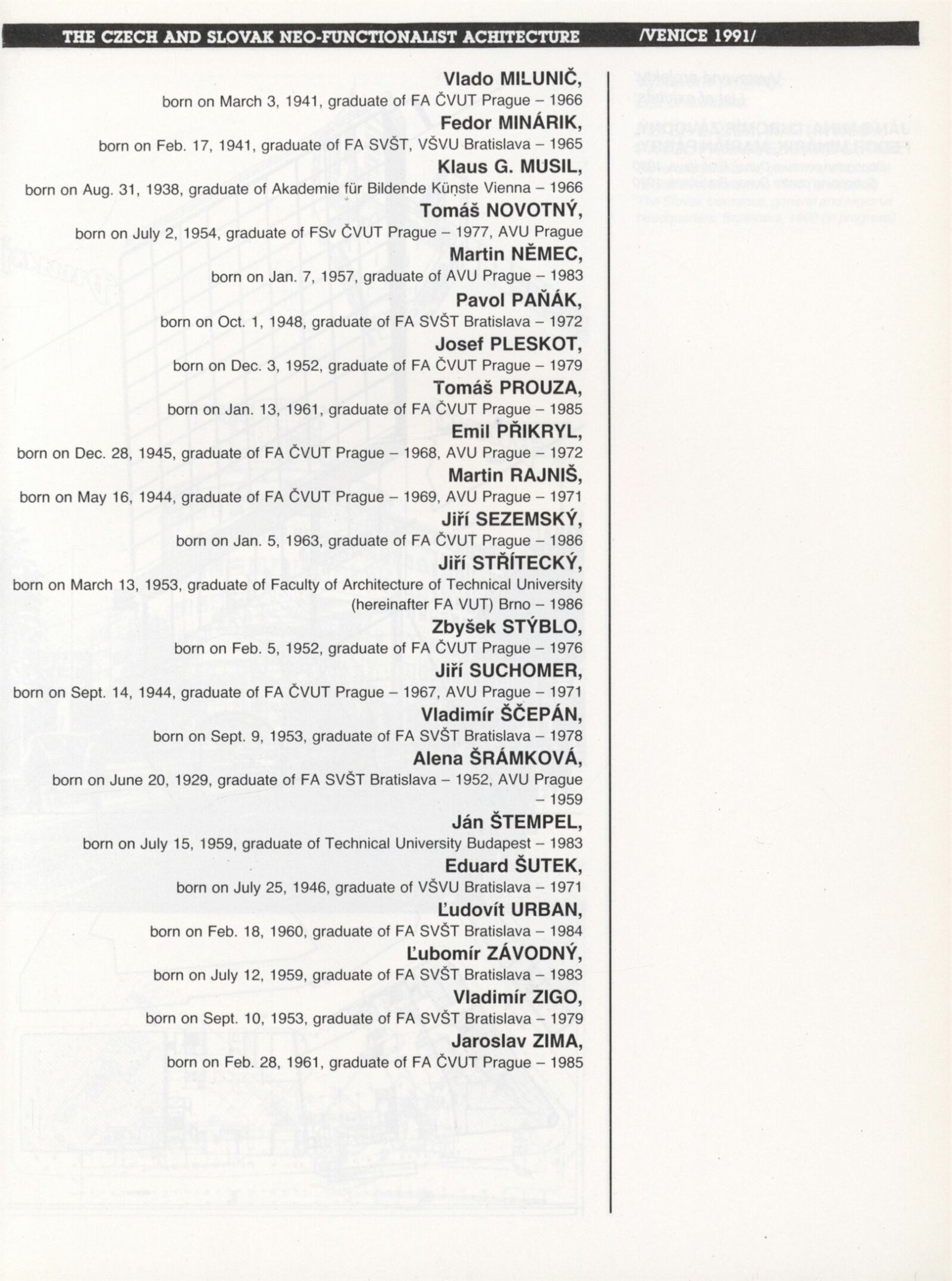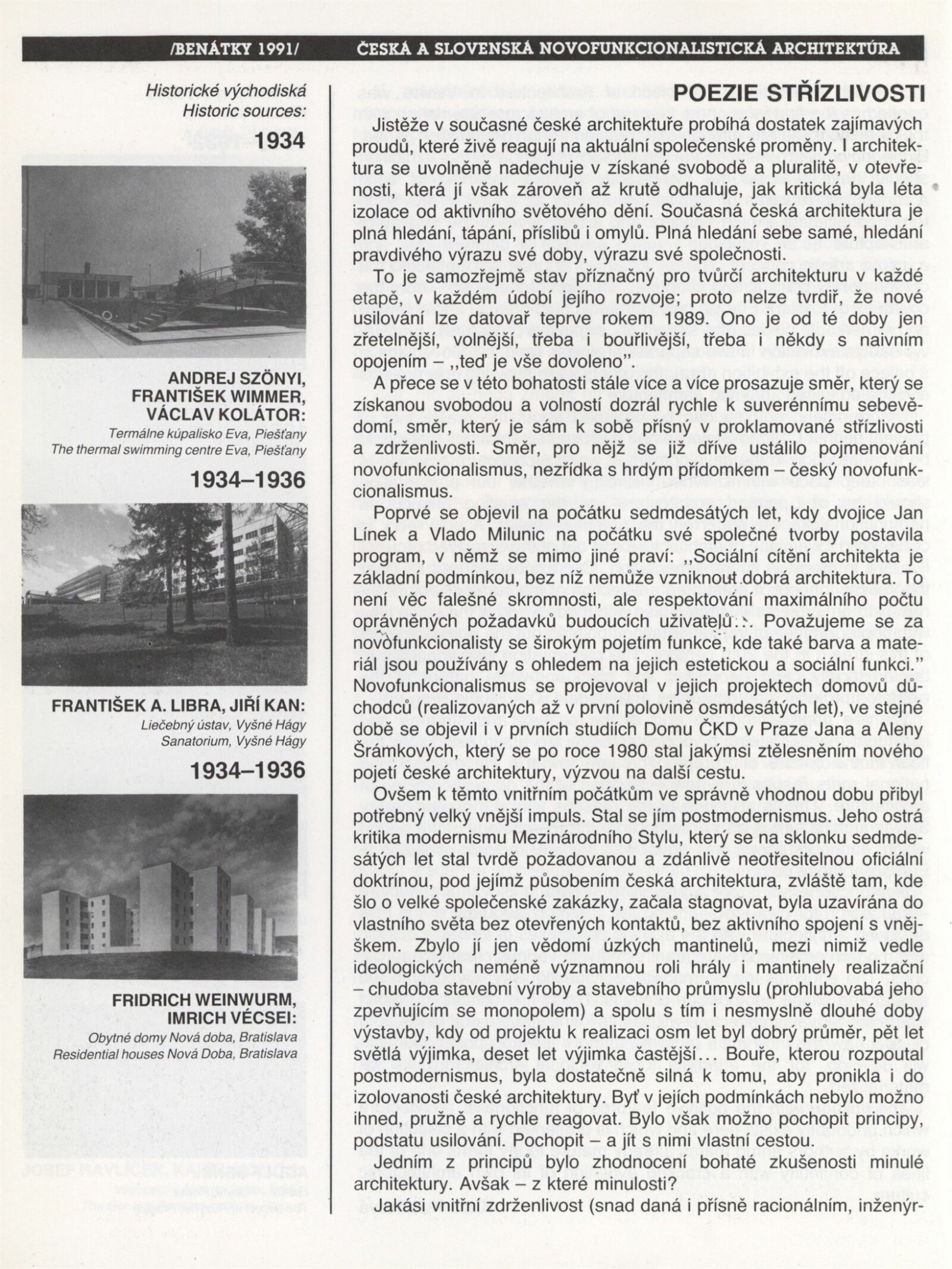 Česká a slovenská novofunkcionalistická architektura: Kabinet architektury, Galerie Stará radnice 3. – 29. 3. 1992. Převzatý katalog Česká a slovenská novofunkcionalisticka architektúra: ... Bratislava, Slovenská národná galéria, Dessewffovský palac 28. 11. 1991 – 2. 1. 1992 ... / Texty Radomíra Sedláková, Klára Kubíčková. - Bratislava: Slovenská národná galéria, - [36] s., obr. Název a text též anglicky. Katalog výstavy pro V. mezinárodní výstavu architektury v Benátkách 8. 9. – 6. 10. GSR 120; MZK