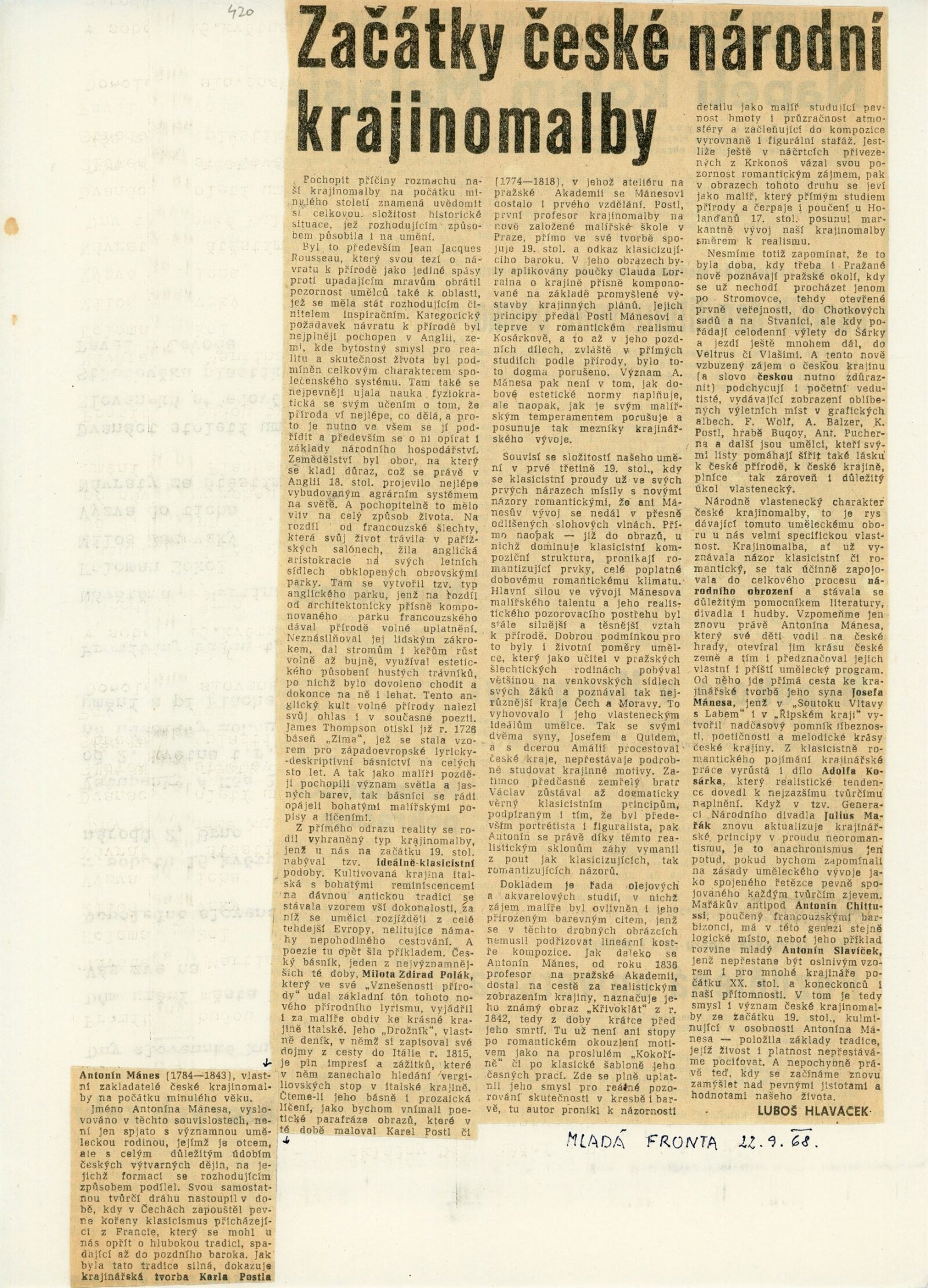 pozvánka, katalog, strojopis anotace, text k výstavě (besedy, průvody), popisky s obrazům, korespondence (provozní korespondence – AJG/NG/DU, dopisy o realizaci výstavy DU/Adolf Kroupa + NG/Jiří Kotalík + AJG/Houdek), předávací protokol, smlouva + seznam pojištěných exponátů, recenze v tisku, pozvánka (AJG)