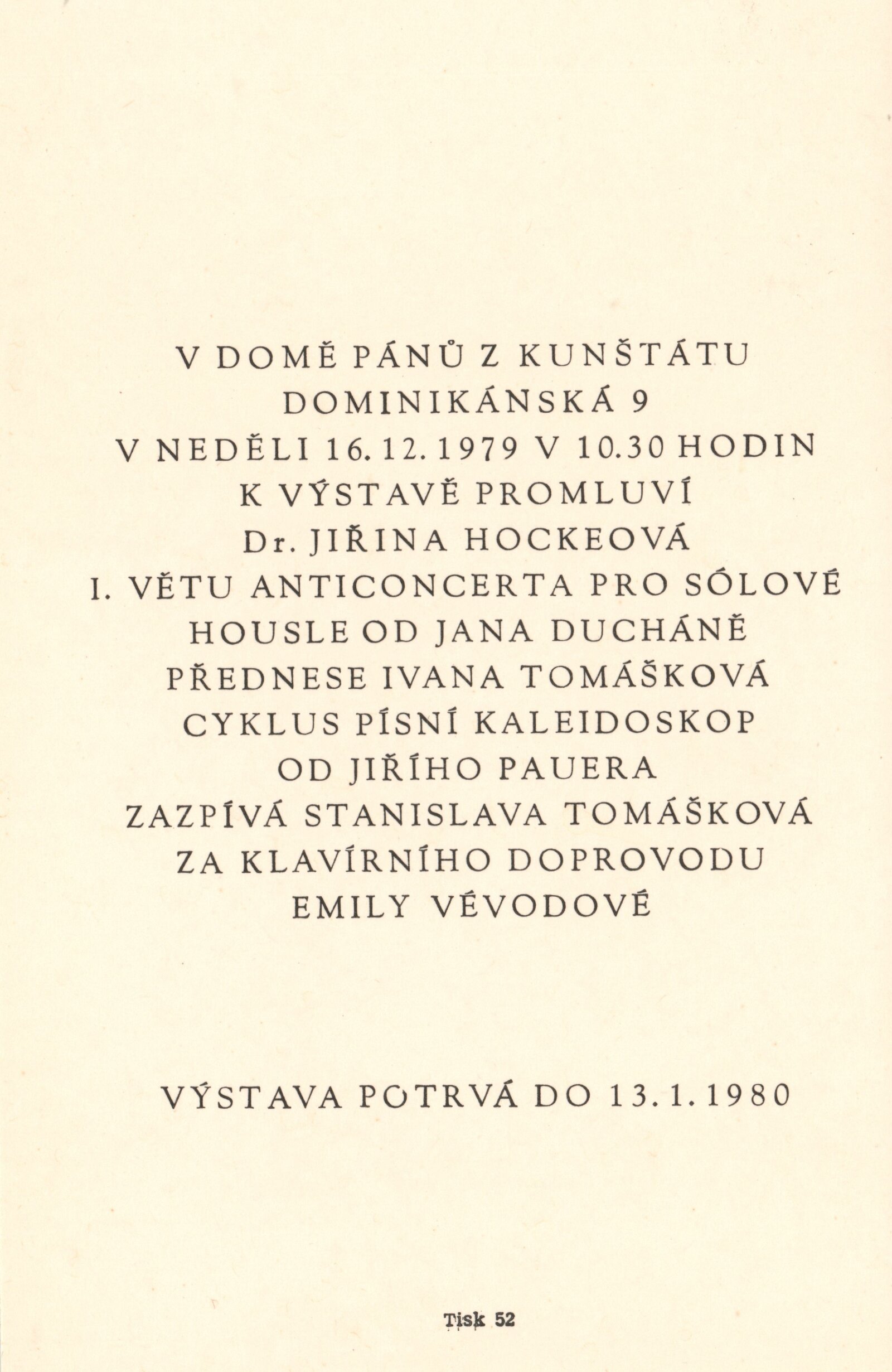 Česká portrétní malba XX. století: Dům pánů z Kunštátu 16. 12. 1979 – 13. 1. 1980 / Text Jiřina Hockeová. - Brno: DUmB, 1979. - 24 s., obr. + seznam vystavených prací 4 s. DPK 726; MG