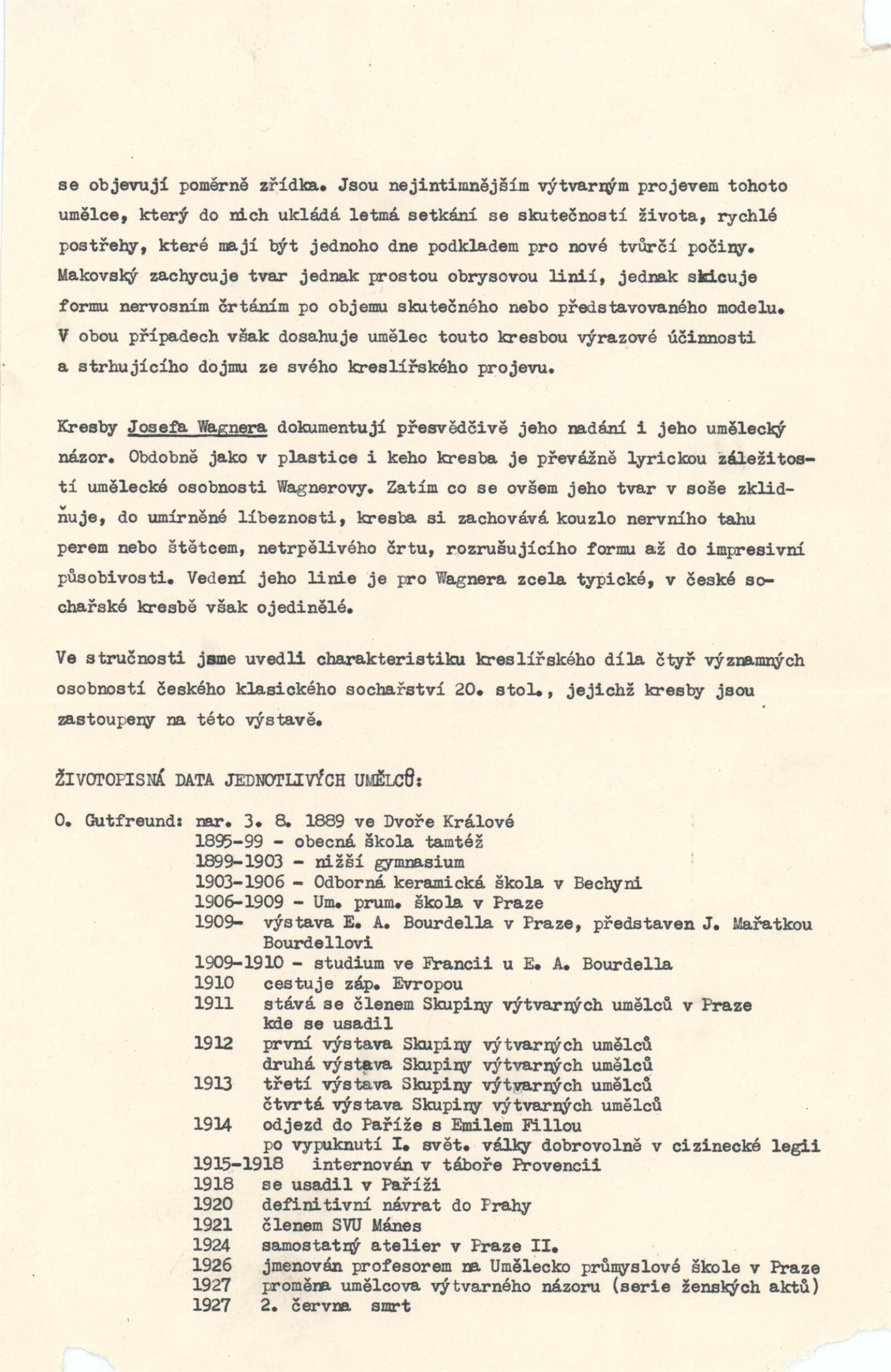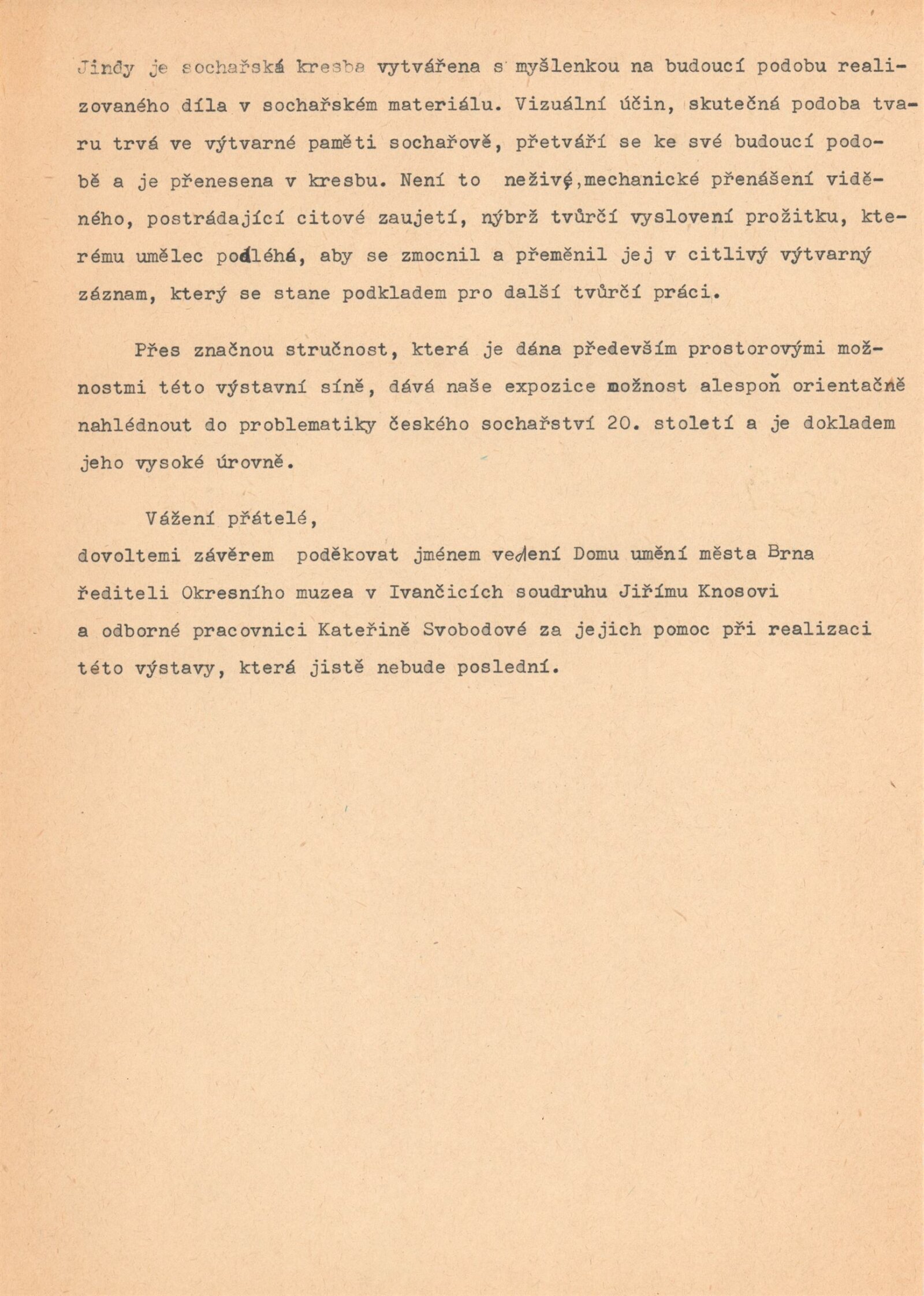 pozvánky (2 druhy), katalogy, fotodokumentace děl, úvodní slovo na vernisáži (Jiřina Hockeová), strojopis textu pro katalog, provozní korespondence, recenze v tisku