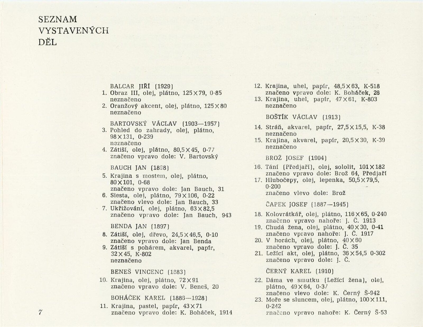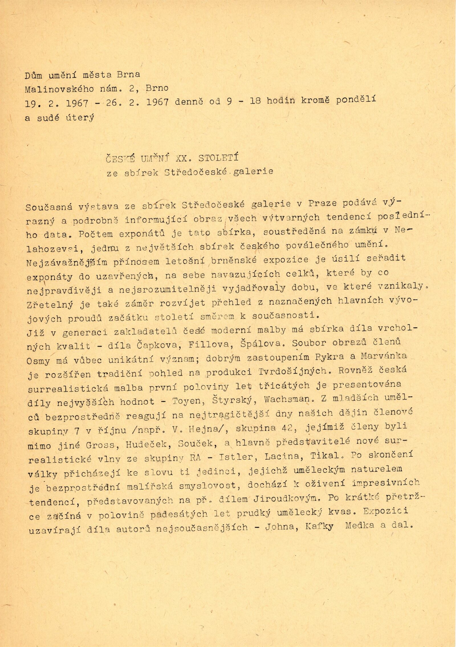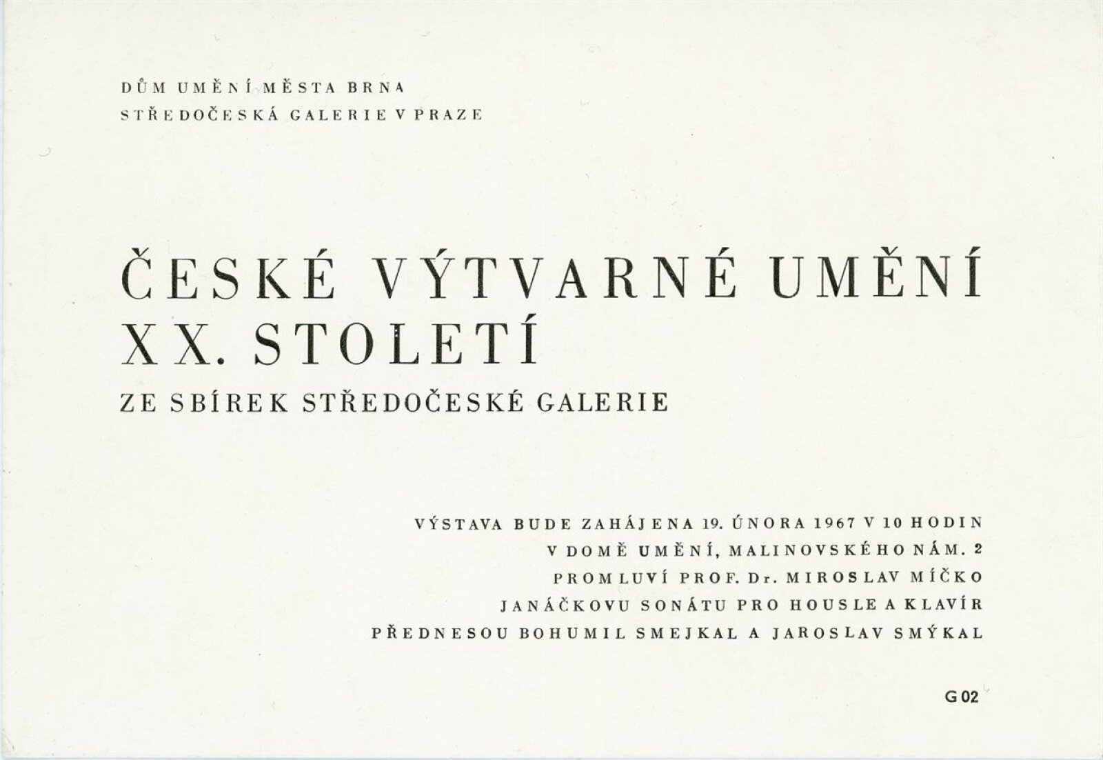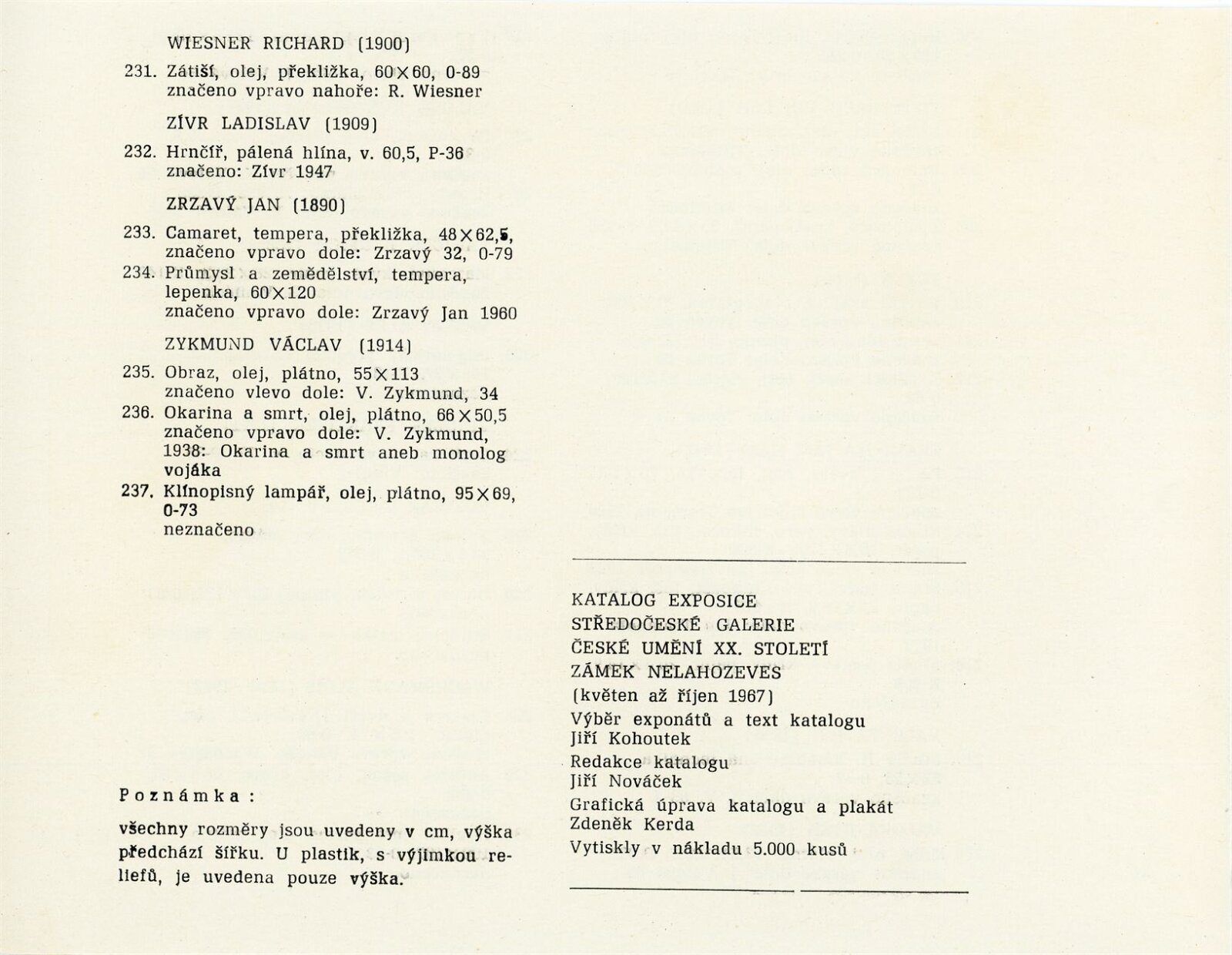 České výtvarné umění XX. století ze sbírek Středočeské galerie: Dům umění, 19. 2. – 27. 3. 1967/ Převzatý katalog s obálkou pro brněnskou výstavu. České umění XX. století: Středočeská galerie, Expozice Nelahozeves, květen–říjen 1967/ Text: Jiří Kohoutek. – Praha: Středočeská galerie, 1967. – 15 s., 46 l. obr. příl., DU 477