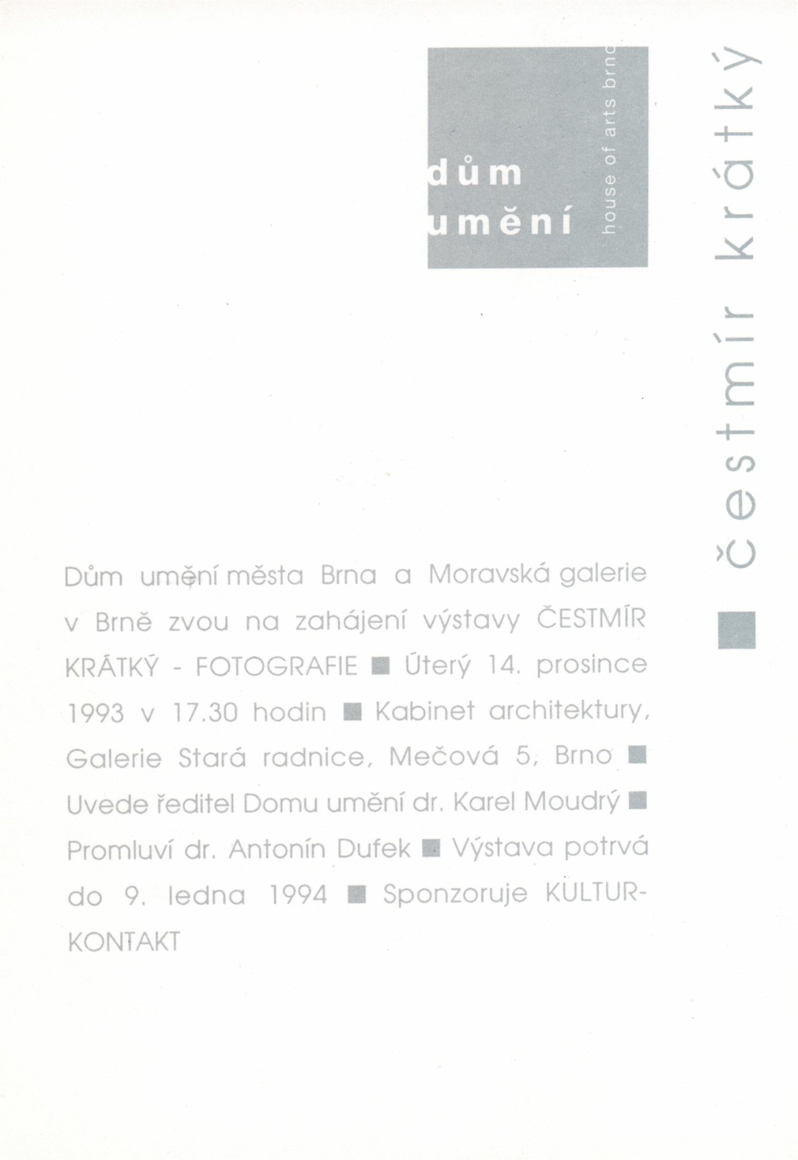 Čestmír Krátký. Fotografie: Galerie Stará radnice 14. 12. 1993 – 23. 1. 1994 / Text Antonín Dufek. - Brno: DUmB, - [4] s., obr. Životní data, výstavy, realizace v architektuře, zastoupení ve sbírkách, bibliografie GSR 151