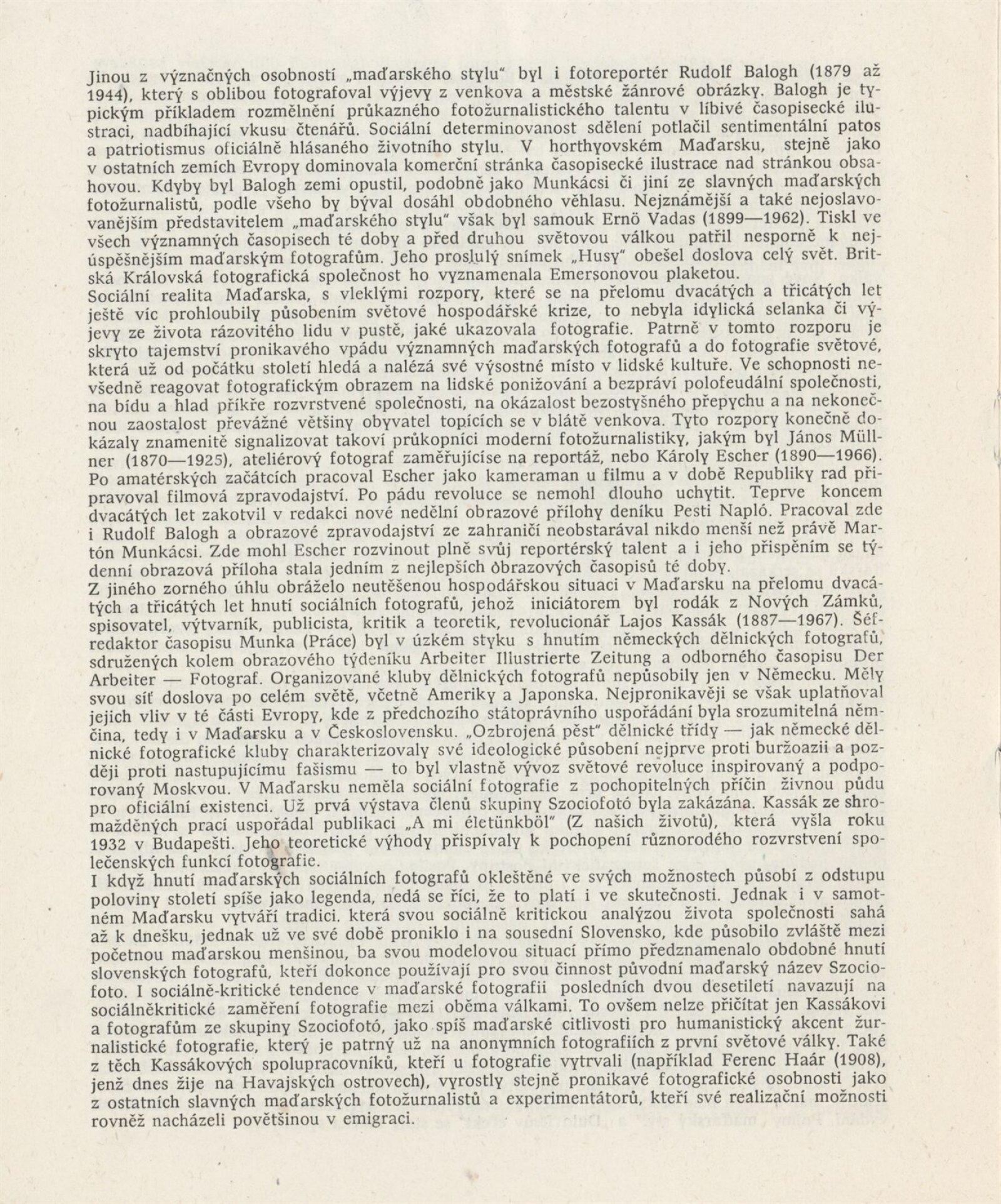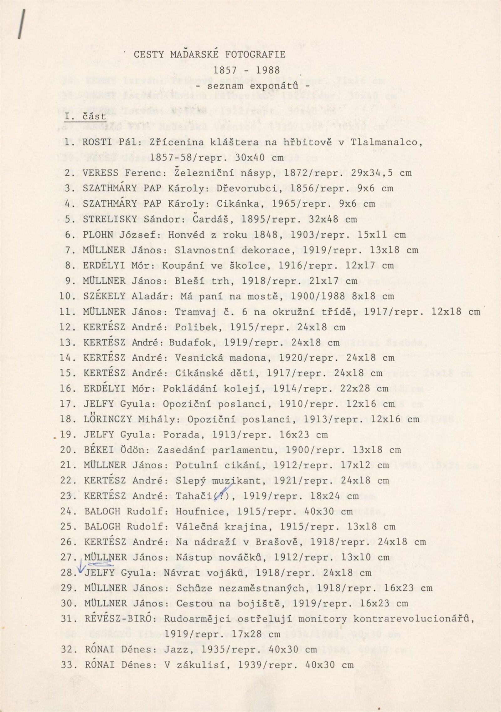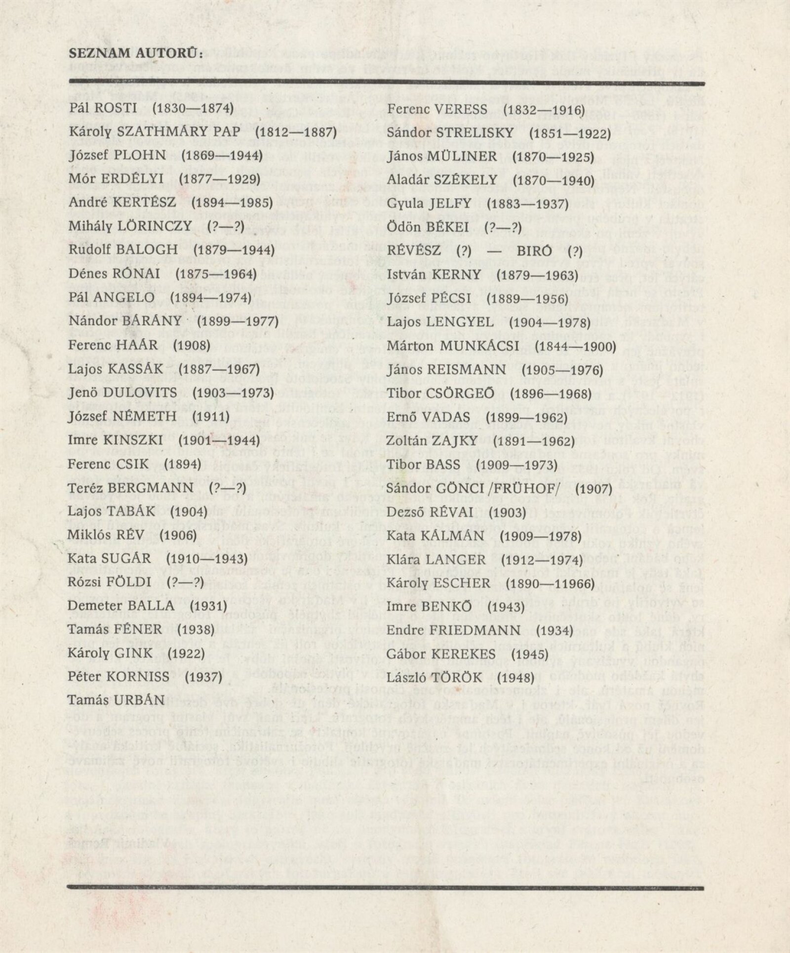 Pál Angelo, Demeter Balla, Rudolf Balogh, Tibor Bass, Nándor Bárány, Imre Benkő, Ödön Békei, Teréz Bergmann, Ferenc Csik, Tibor Csörgeő, Jenö Dulovits, Mór Erdélyi, Károly Escher, Rózsi Földi, Tamás Féner, Endre Friedmann, Károly Gink, Sándor Gönci/ Frühof/, Ferenc Haár, Gyula Jelfy, Kata Kálmán, Lajos Kassák, Gábor Kerekes, István Kerny, André Kertész, Imre Kinszki, Péter Korniss, Lajos Lengyel, Klára Langer, Mihály Lörinczy, Márton Munkácsi, János Müliner, József Németh, József Pécsi, József Plohn, János Reismann, Miklós Rév, Dezső Révai, Révész-Biró, Pál Rosti, Dénes Rónai, Sándor Strelisky, Kata Sugár, Károly Szathmáry Pap, Aladár Székely, Lajos Tabák, Péter Timár, László Török, Tamás Urbán, Ernő Vadas, Ferenc Veress, Zoltán Zajky