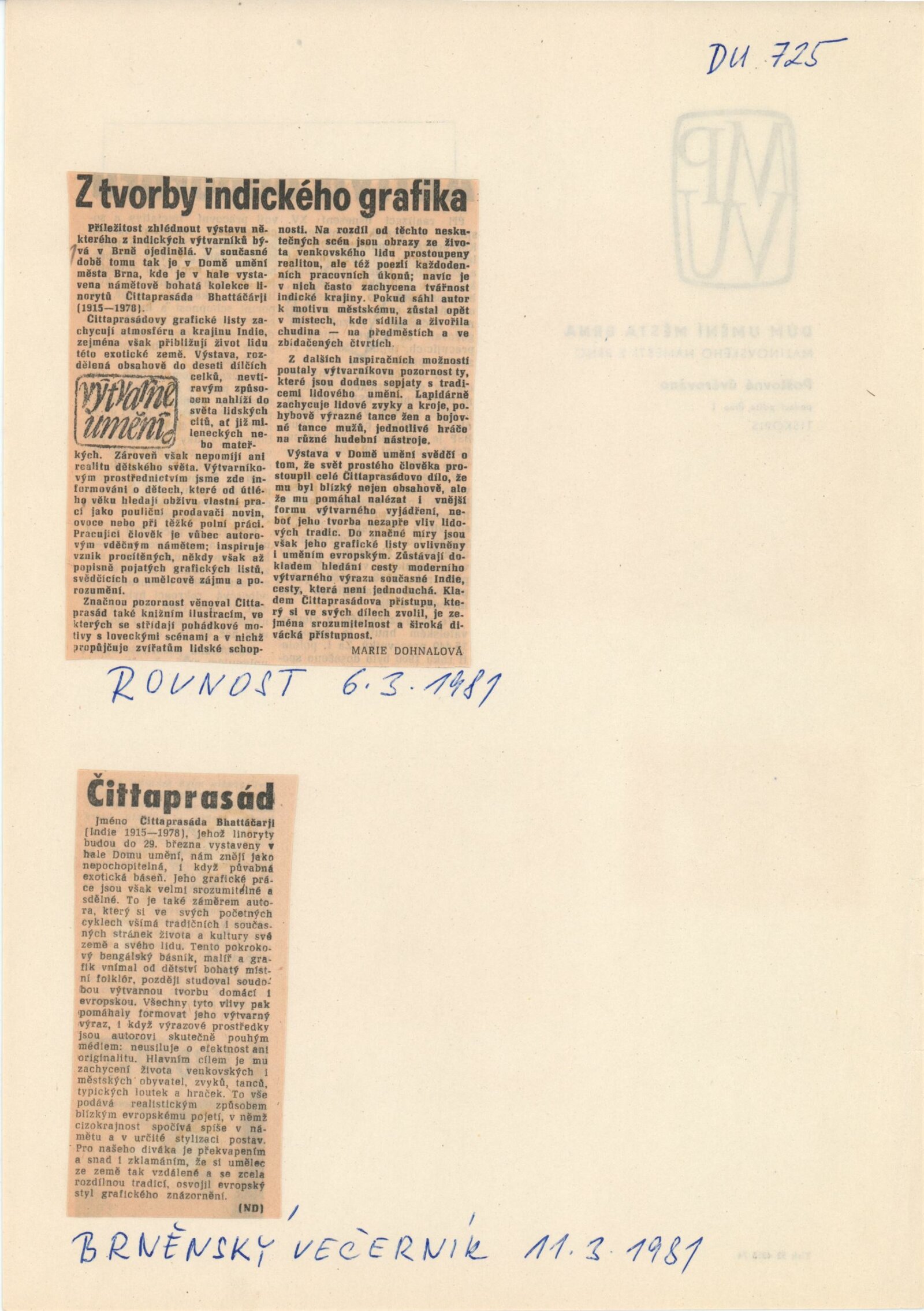pozvánka, katalog, strojopis, fotografie děl a instalace, fotografie autora, pojistné seznamy, dopis v hindštině, korespondence (Čsl. spol. pro mezinárodní styky 6. 6. 1979, Sbírka orientálního umění NG), pozvání na vernisáž veřejným činitelům a primátorovi, smlouva o dočasném užívání s NG a potvrzení o převzetí, recenze v tisku, pozvánka na autorovu výstavu v Litoměřicích (1980), katalog výstavy autora ve výst. síni FRONTA (1979)