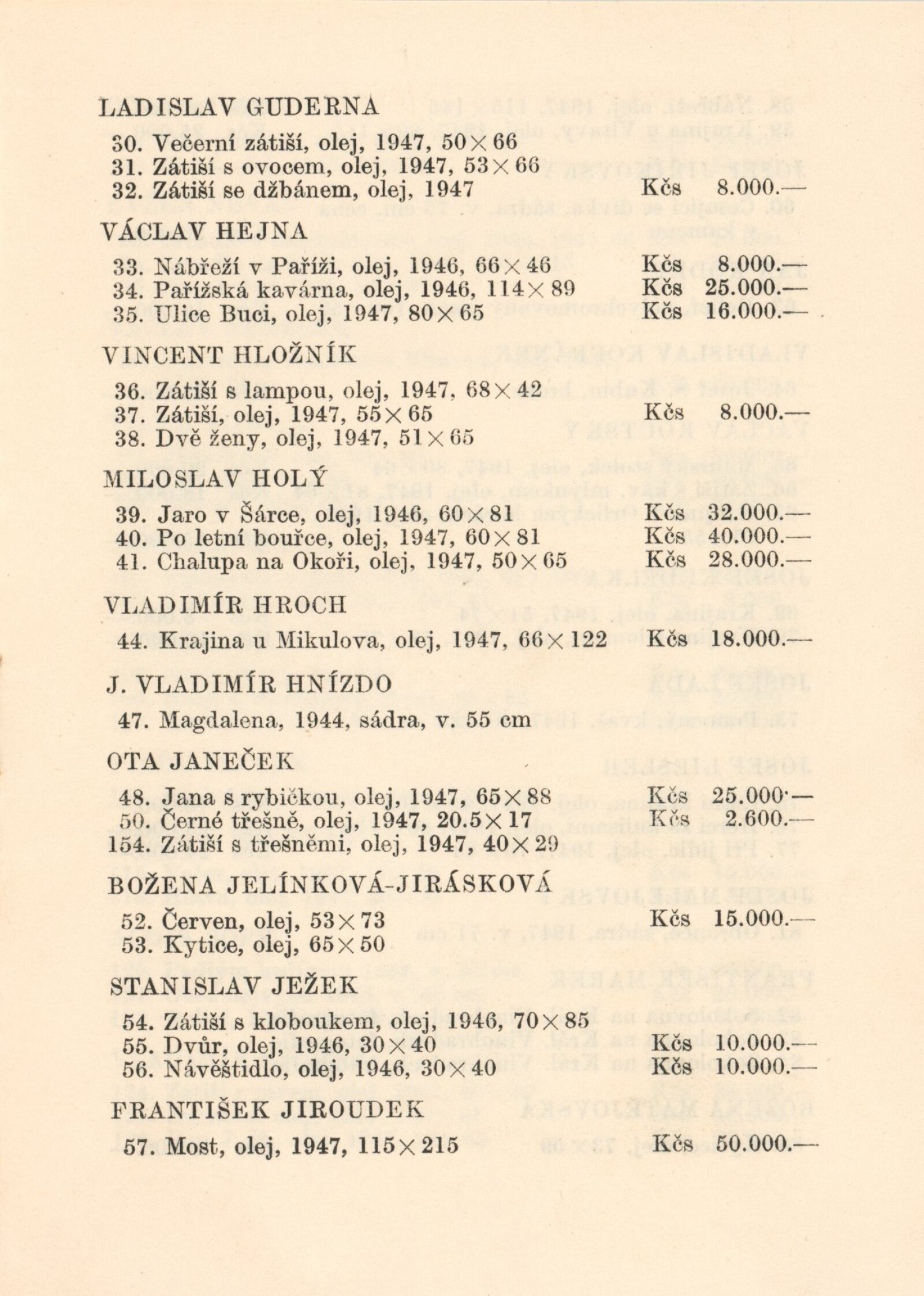 Břetislav Benda, Vincenc Beneš, Karel Černý, E. F. Černý, Jan Červ, Bohumír Dvorský, Karel Dvořák, Emil Filla, Alois Fišárek, Jaroslav Gruss, Ladislav Guderna, Václav Hejna, Vincent Hložník, Miloslav Holý, Vladimír Hroch, J. Vladimír Hnízdo, Ota Janeček, Božena Jelínková-Jirásková, Stanislav Ježek, František Jiroudek, Josef Jiříkovský, Jan Kodet, Vladislav Kofránek, Václav Koutský, Josef Kudělka, Josef Lada, Josef Liesler, Josef Malejovský, František Marek, Božena Matějovská, Otakar Mrkvička, Evžen Nevan, Václav Němeček, Vilém Nowak, Jaroslav Paur, Antonín Pelc, Vilém Plocek, Zdeněk Sklenář, Alois Sopr, Vladimír Sychra, Václav Šimek j. h., Otakar Švec, Václav Tikal, Vojtěch Tittelbach, Marie Wagnerová-Kulhánková, Jan A. Vítek, Richard Wiesner, Jarmila Zábranská, Václav Zykmund