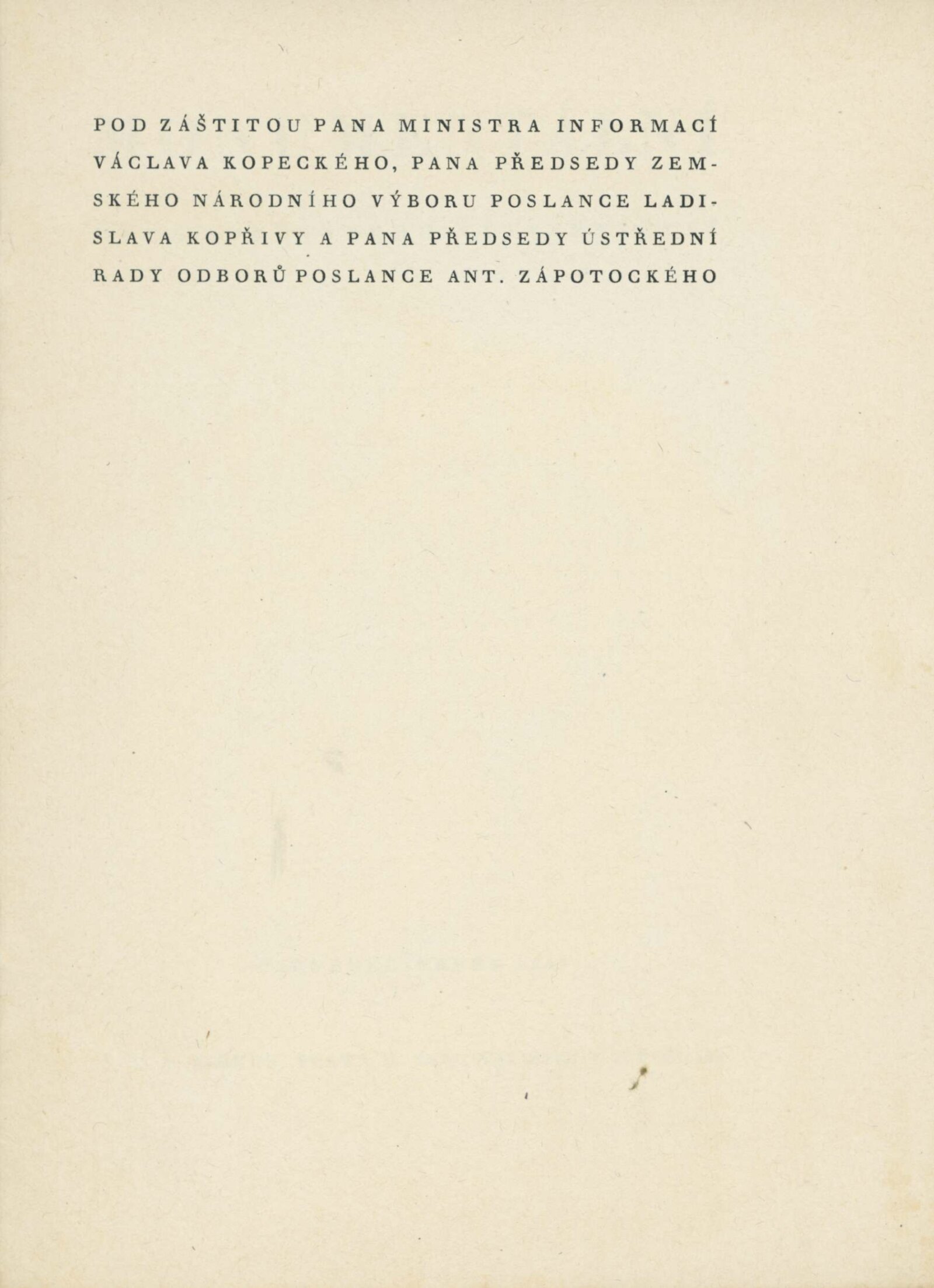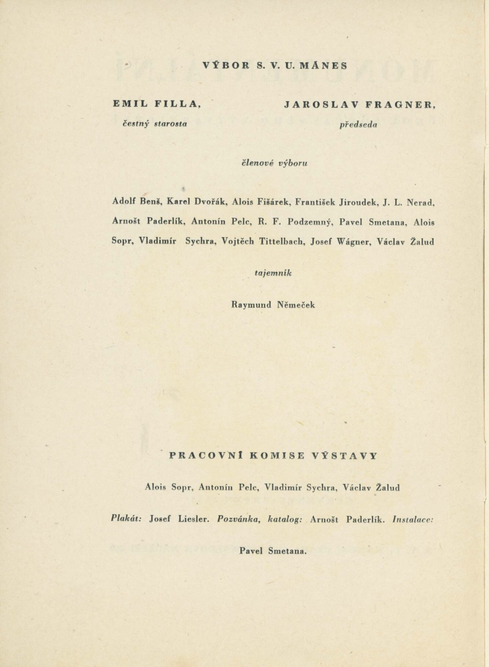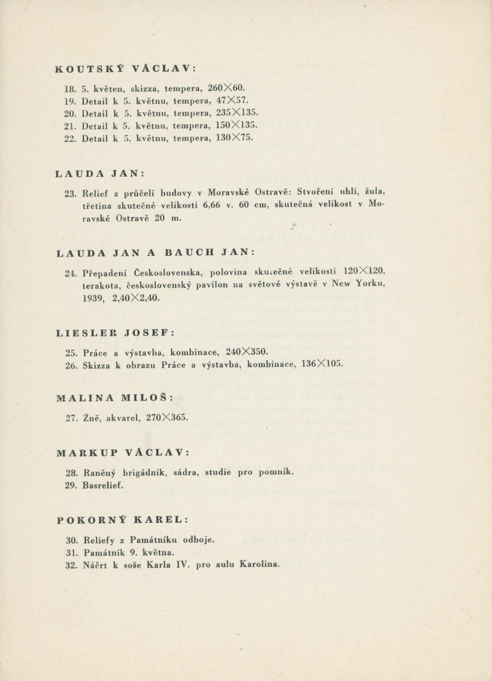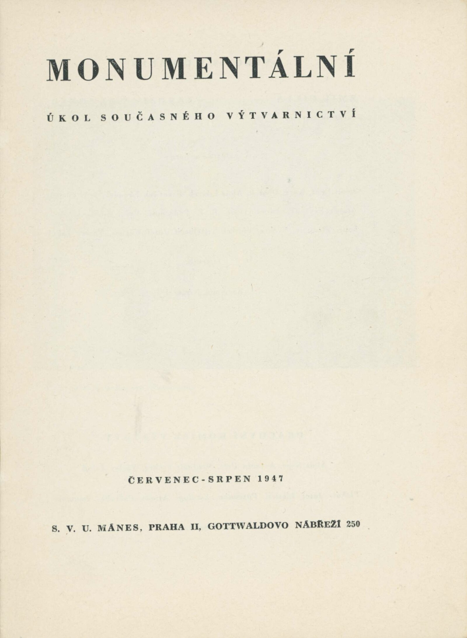 pozvánka, kopie zprávy pro tisk a rozhlas (originál, viz DU 61), společný tištěný seznam vystavených prací (K 191, viz složka DU 58), soupis vystavených prací (viz DU 59), katalog výstavy Monumentální úkol současného výtvarnictví (SVU Mánes Praha, 1947)