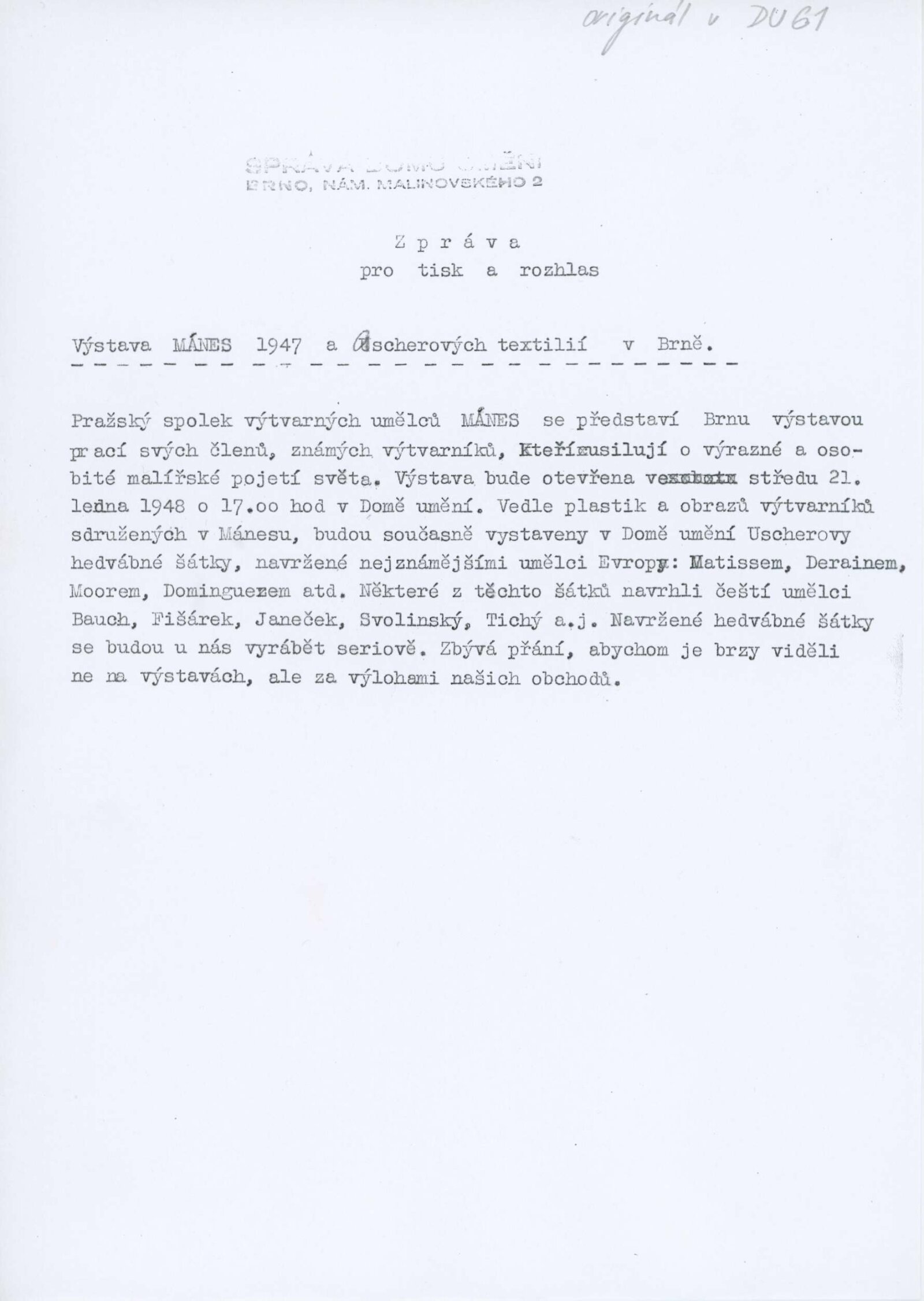 Katalog výstav Domu umění, pořádaných 21. 1. – 21. 2. 1948 / Obsahuje výstavy: Jan Zrzavý. 58. výstava, Výstava Ascherových šátků, Kresby brazilských malířů. 57. výstava, Členská výstava S.V.U. Mánes. – Brno: Dům umění, 1948. – 12 s., DU 58–61. – MG; MMB