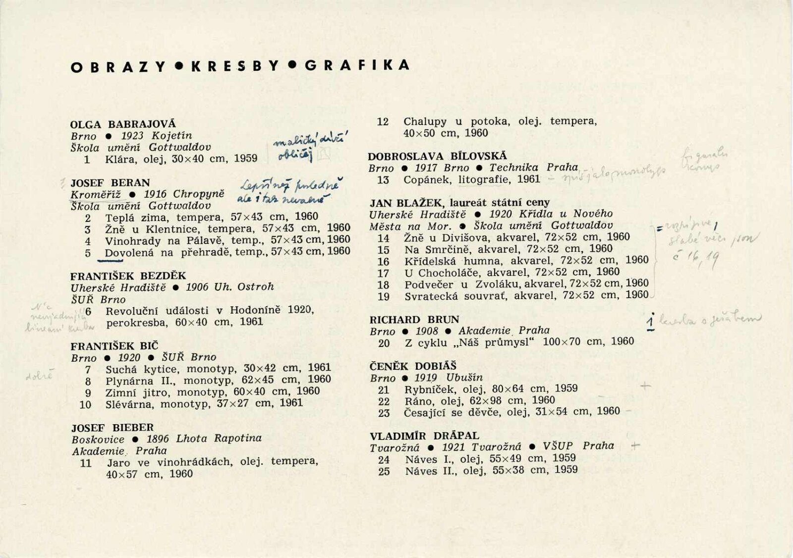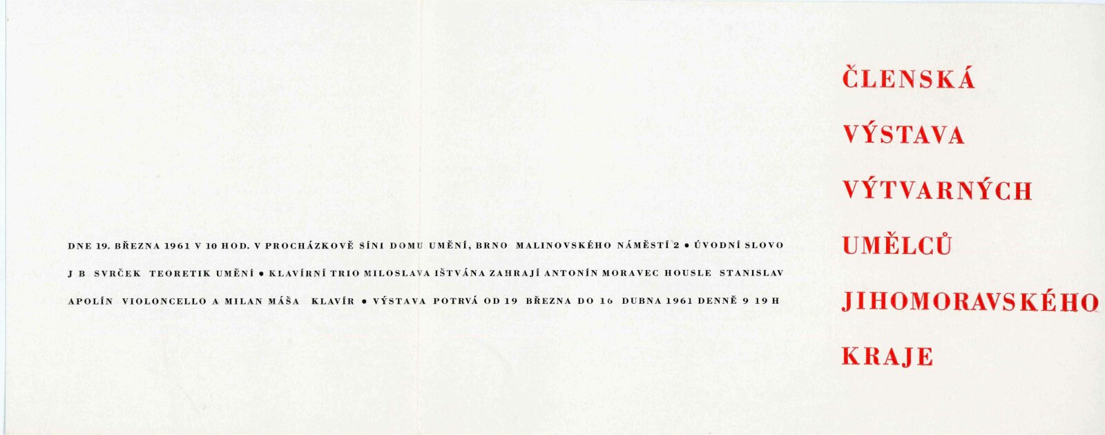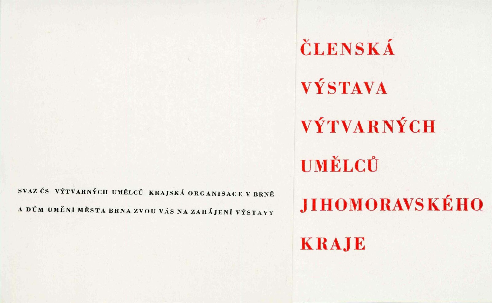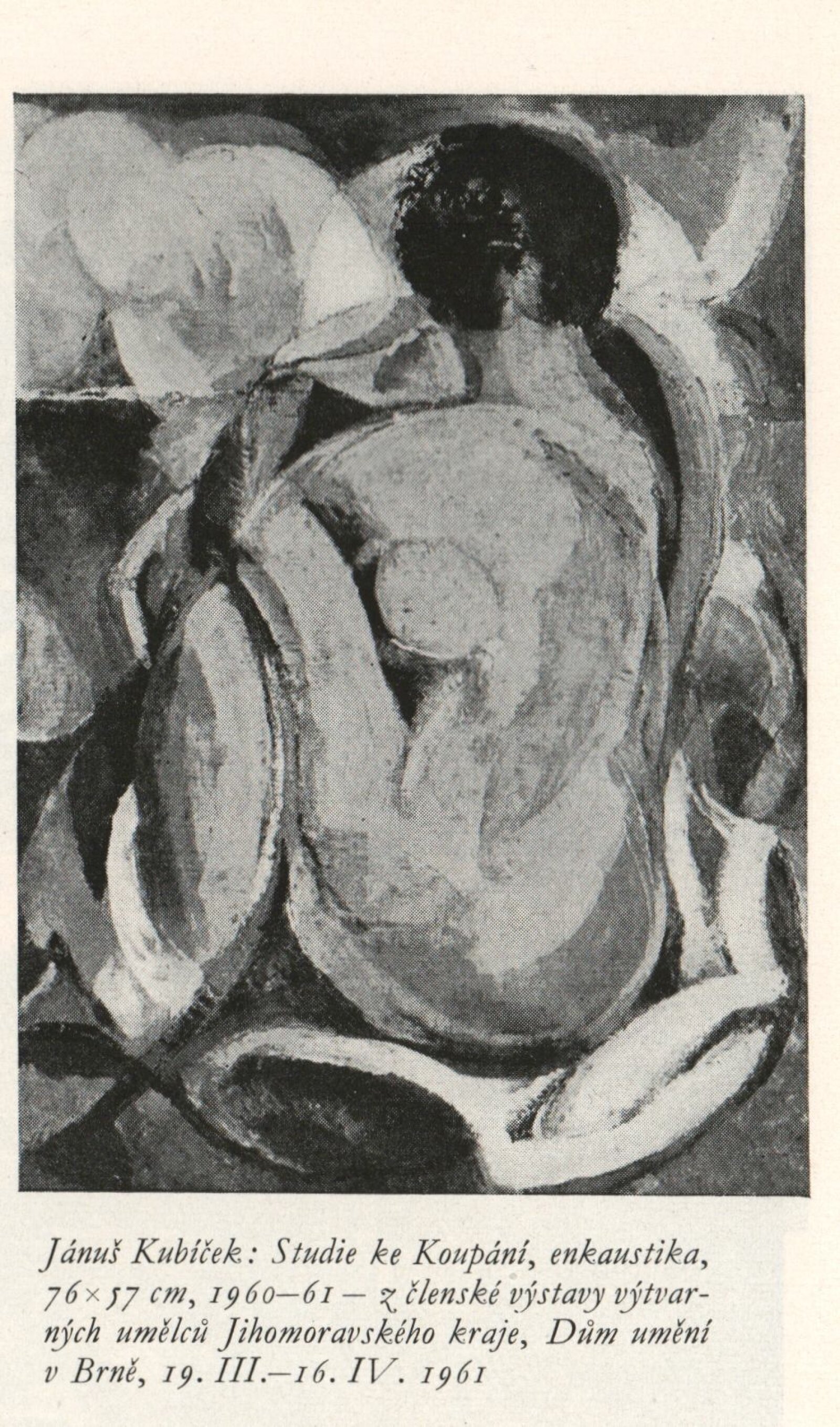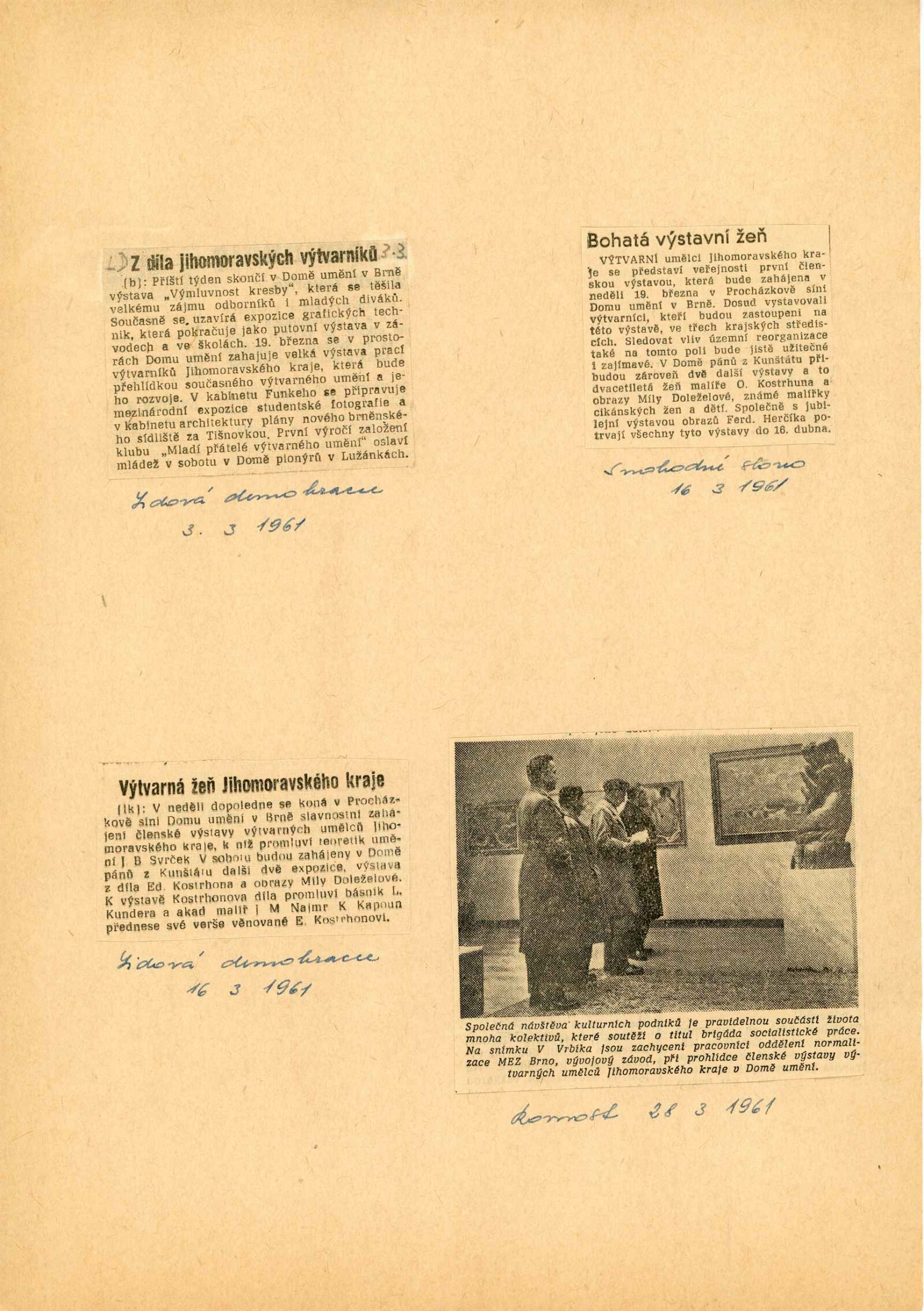 Členská výstava výtvarných umělců Jihomoravského kraje: Dům umění města Brna, 19. 3. – 16. 4. 1961 / Text: Ivo Krsek. – Brno: SČSVU, 1961. – 52 s., obr., životní data vystavujících umělců, DU 396. – MZK; MG