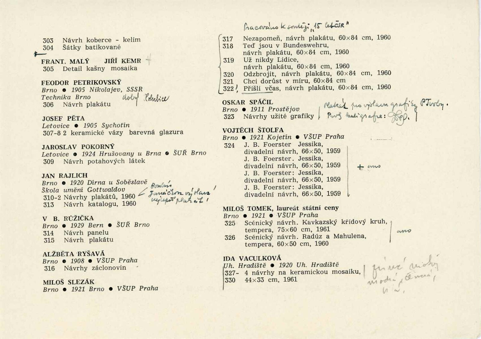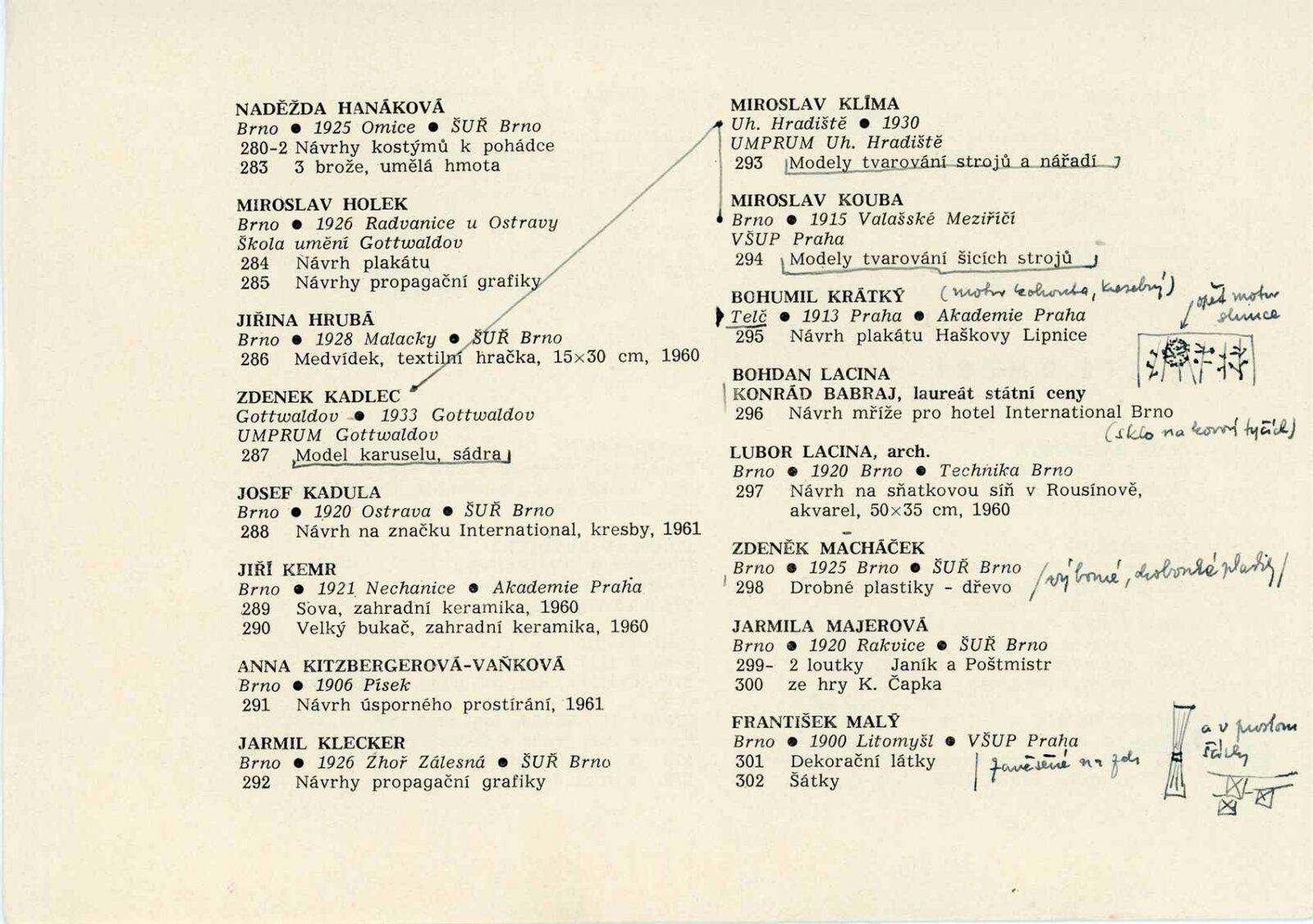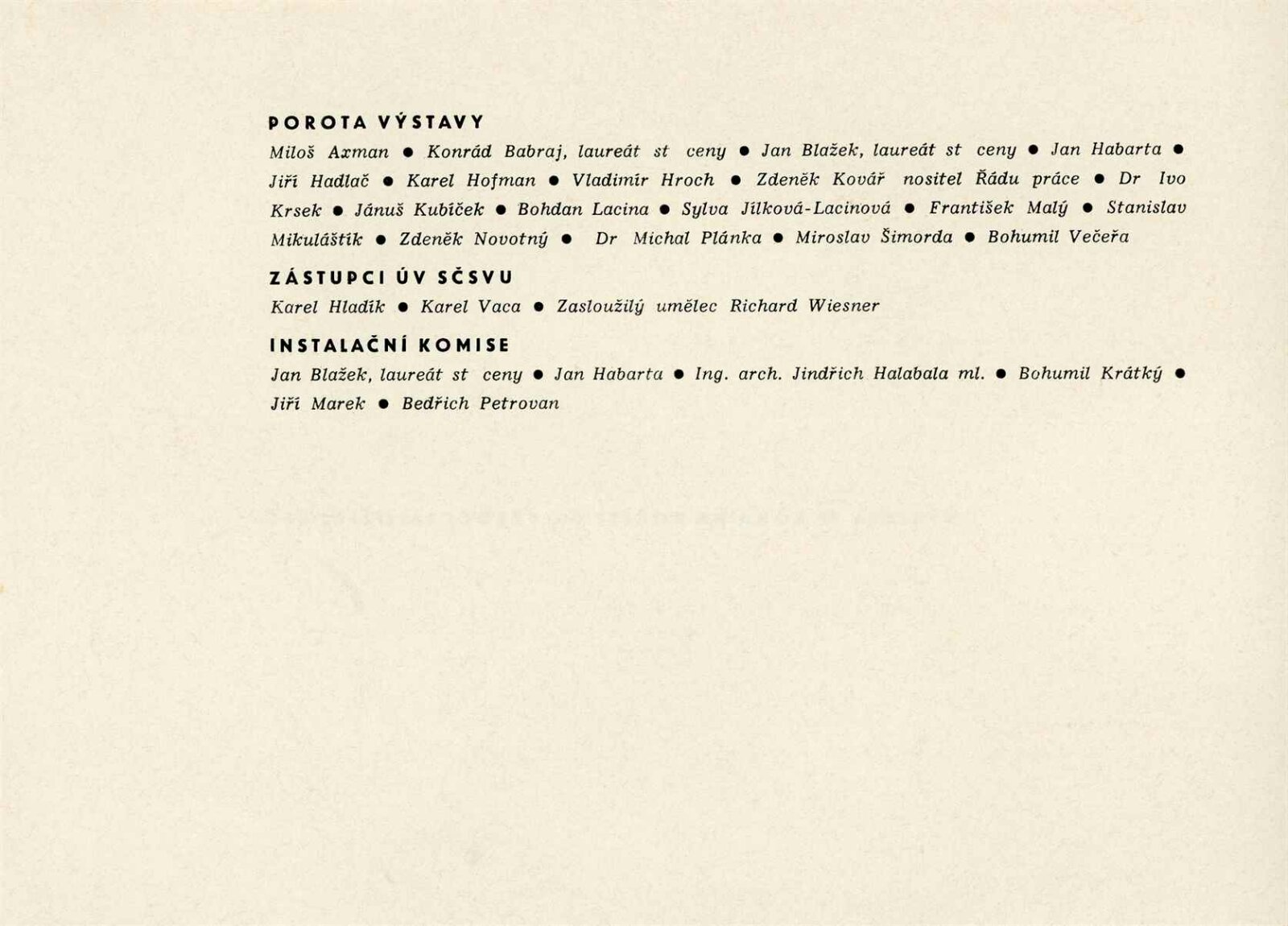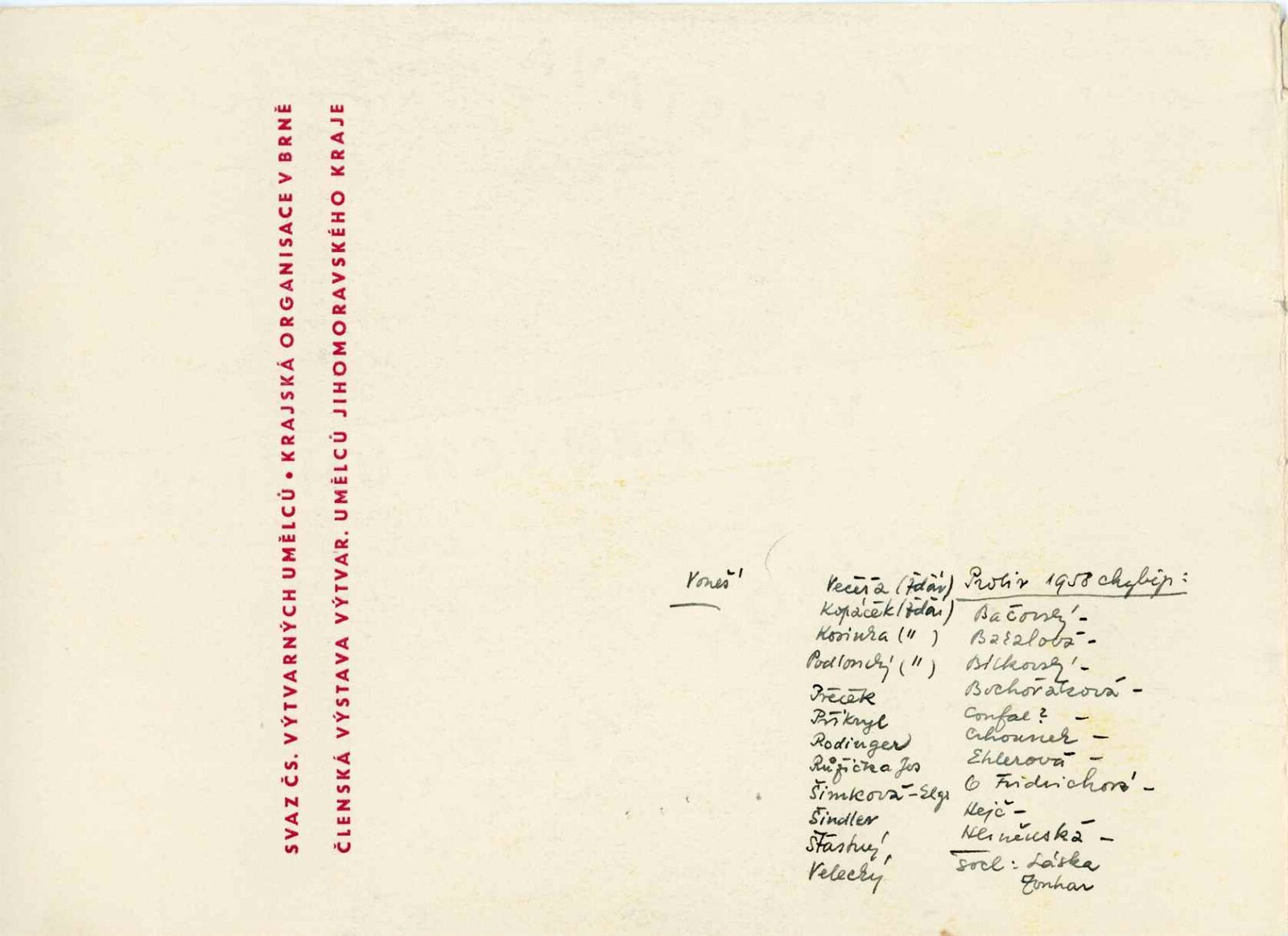Miloš Axman, Konrád Babraj, Olga Babrajová, Jiří Bartoň, Josef Beran, František Bezděk, František Bič, Josef Bieber, Dobroslava Bílovská, Zdeněk Bláha, Jan Blažek, Richard Brun, Alois Černý, Čeněk Dobiáš, Vladimír Drápal, Jaroslav Dvořáček, Michael Florián, Jaroslav Frýdecký, Emil Fučík, Antonín Gajdušek, Milan Geryk, Jan Habarta, Jiří Hadlač, Jindra Halabala, Naděžda Hanáková, Oldřich Hanzl, Robert Hliněnský, Karel Hofman, Miroslav Holek, Jaroslav Hrabec, Vladimír Hroch, Jiřina Hrubá, Zdeněk Hybler, Dalibor Chatrný, František Chmelař, Svatopluk Chudara, Květa Jadrníčková, Bohuš Jágr, Bohumil Jahoda, Jan Janča, Jiří Jaška, Karel Jílek, Sylva Jílková-Lacinová, Josef Jochman, Zdeněk Kadlec, Josef Kadula, Jiří Kemr, Anna Kitzbergerová-Vaňková, Jarmil Klecker, Miroslav Klíma, Milan Klvaňa, František Kocourek, Olga Kolovratová, Dagmar Kopecká , Eduard Kostrhon, Miroslav Kouba, V. A. Kovanič, Bohumil Krátký, Vilém Kraus, Josef Krejčiřík, Karel Kryl, Jánuš Kubíček, Josef Kubíček, Rudolf Kučera, Bohdan Lacina, Lubor Lacina, Oldřich Laštůvka, Vilma Lesková, Jaroslav Lukeš, Zdeněk Macháček, Jarmila Majerová, Vincenc Makovský, František Malý, Jiří Marek, Ladislav Martínek, Stanislav Mikuláštík, Alois Mikulka, František Mikulka, Vilém Mužík, Jan M. Najmr, Pavel Navrátil, Miroslav Netík, Zdeněk Novotný, Antonín Odehnal, František Pavlů, Feodor Petrikovský, Bedřich Petrovan, Josef Pěta, Jaroslav Pokorný, Břetislav Polišenský, František Přikryl, Jan Rajlich, Vilém Reichmann, V. B. Růžička, Alžběta Ryšavá, Bedřich Saňa, Miloš Slezák, Svatopluk Souček, Oskar Spáčil, Miroslav Šimorda, Jaroslav Škarohlíd, Ferda Štábla, Miroslav Štolfa, Vojtěch Štolfa, Miloš Tomek, Jan Tříska, Inez Tuschnerová, Vladislav Vaculka, Ida Vaculková, Oldřich Vašica, Vladimír Vašíček, Ladislav Včelař, Karel Veleba, Jiří Veškrna, Jiří Vláčil, Emil Weirauch, Julie Zemanová, Otakar Zemina, Milan Zezula