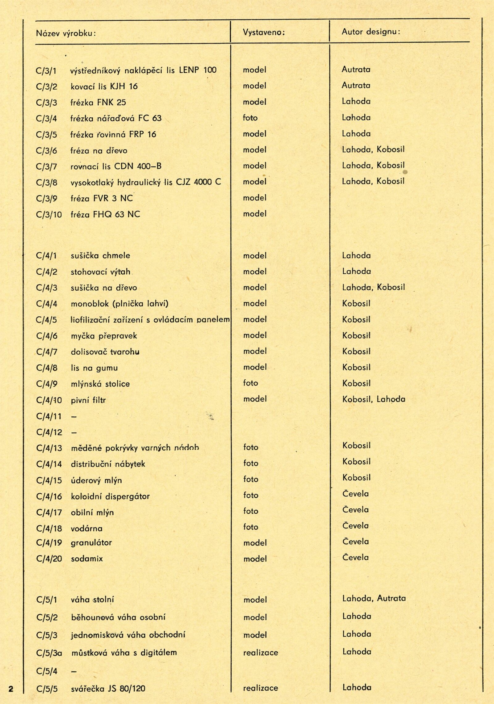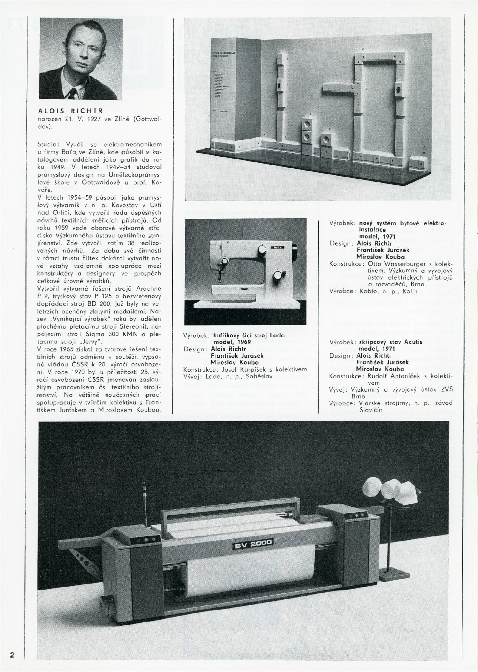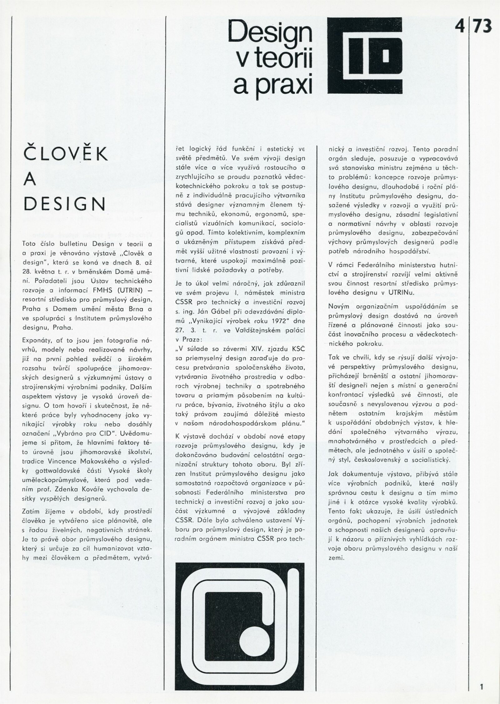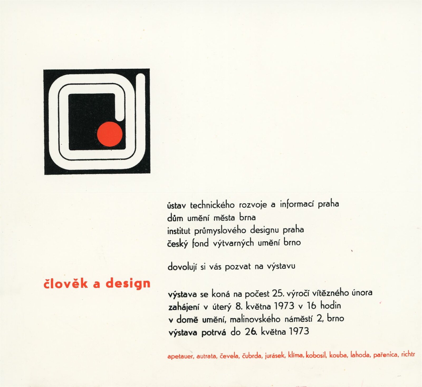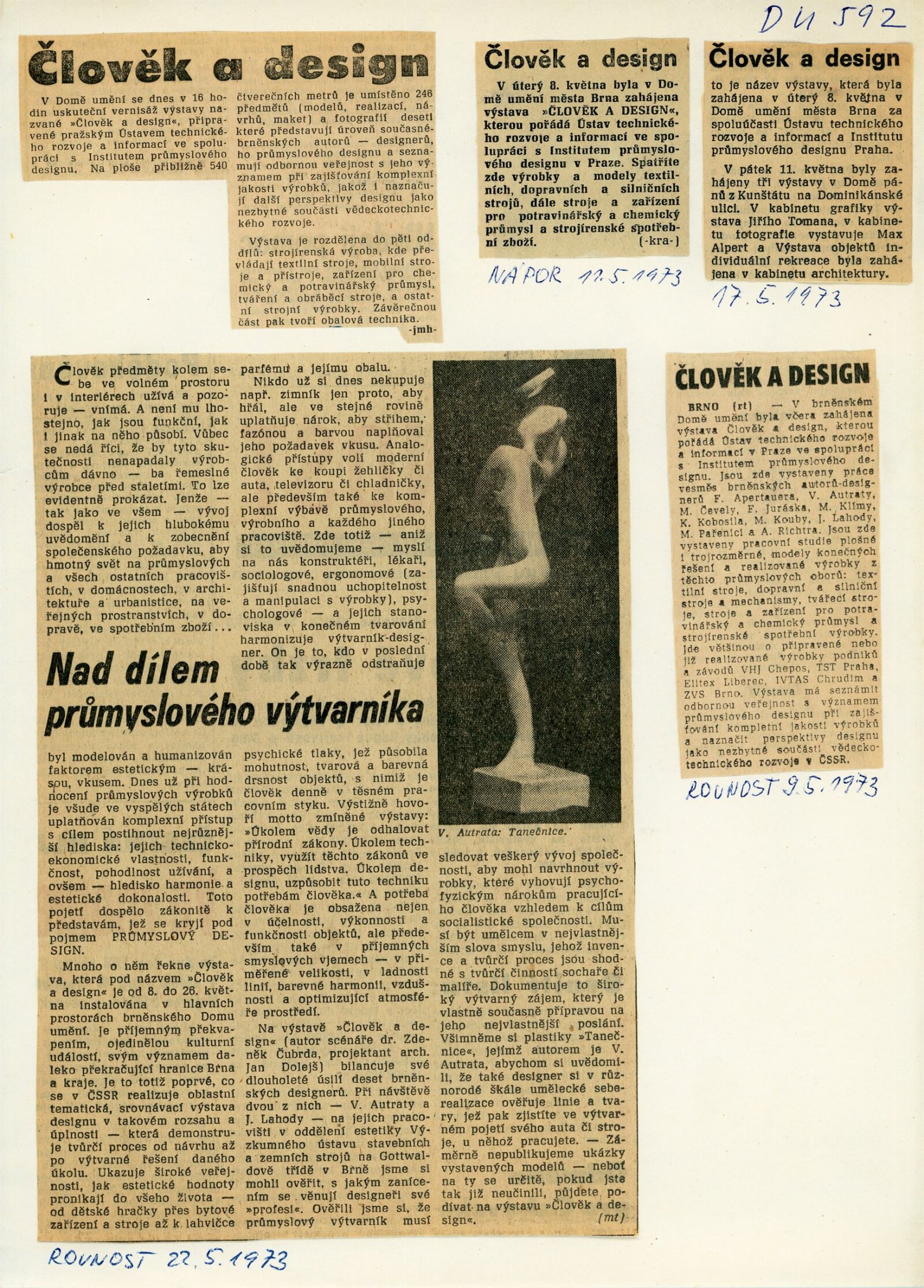 Člověk a design: Dům umění města Brna 8. 5. – 28. 5. 1973 / Praha: Institut průmyslového designu, 1973. – 8 s., obr., seznam vystavených děl 4 s., Vyšlo jako č. 4/1973 časopisu Design v teorii a praxi, portréty, životopisy, DU 592