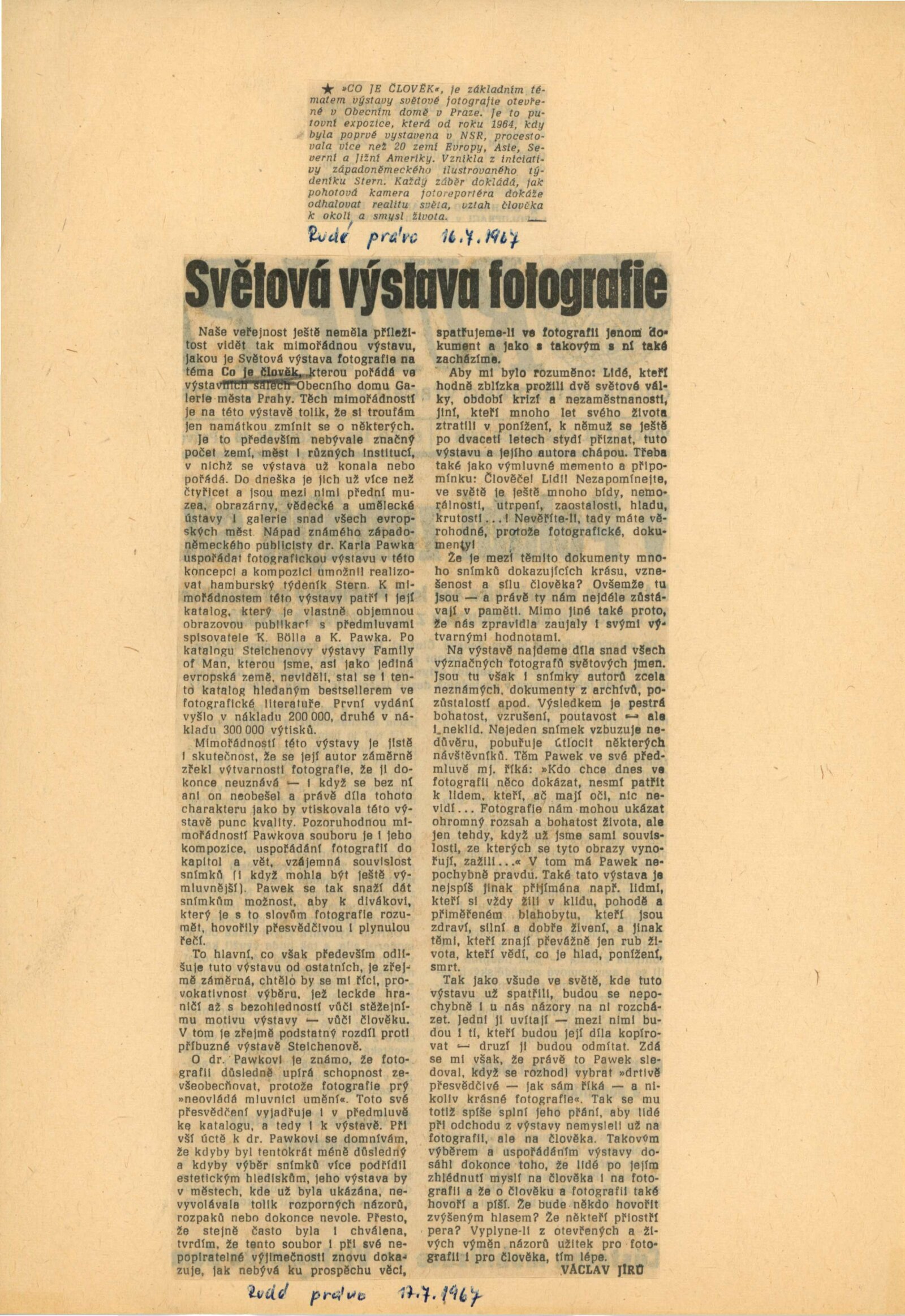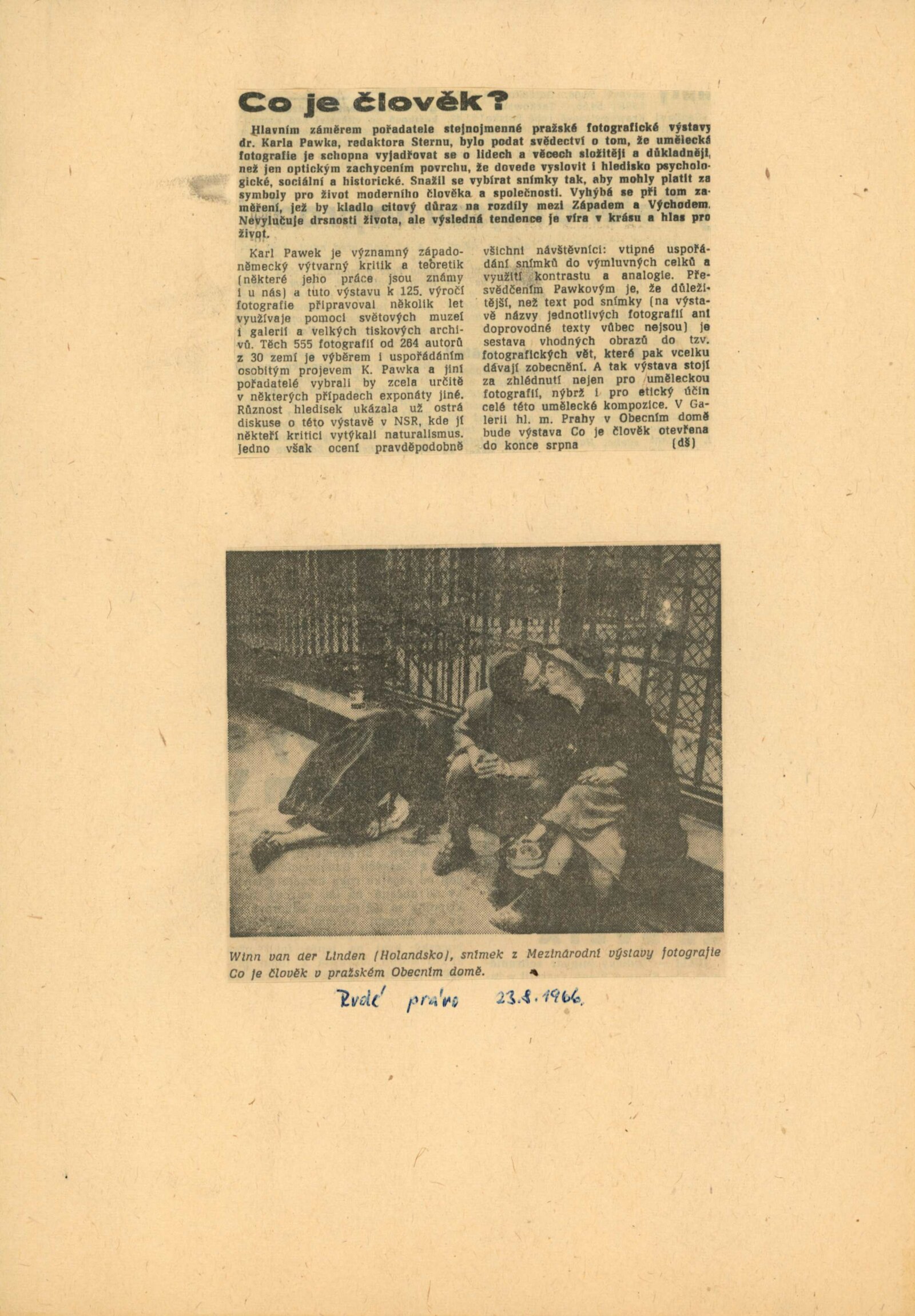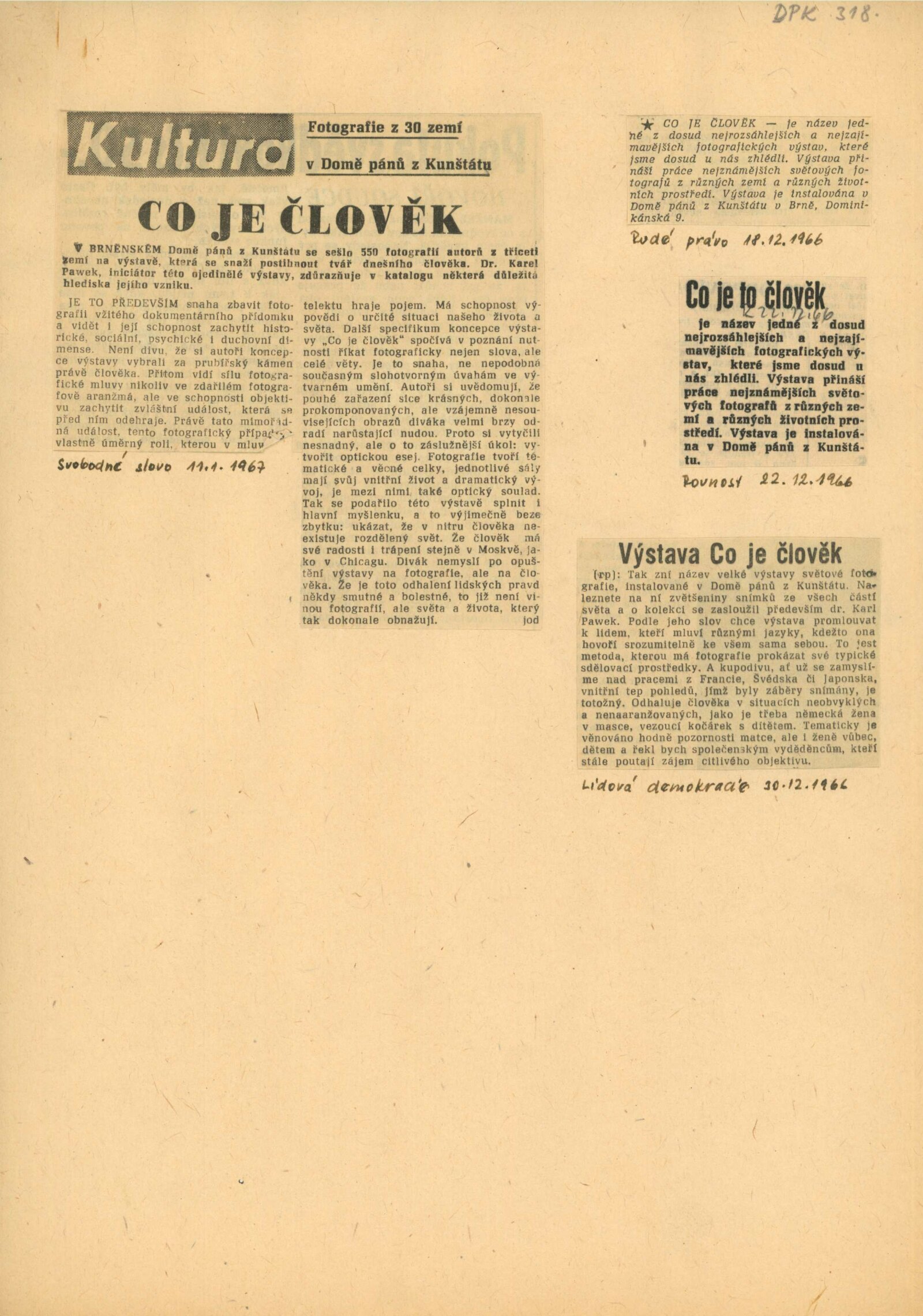 Co je člověk. Mezinárodní výstava fotografií: Dům umění města Brna / Dům pánů z Kunštátu, 15. 12. 1966 – 15. 1. 1967 / Převzatý katalog. Co je člověk: Text: Karl Pawek. – Hamburg: Verlag Gruner. – 190 s. obr., úvod 4 s., DPK 318