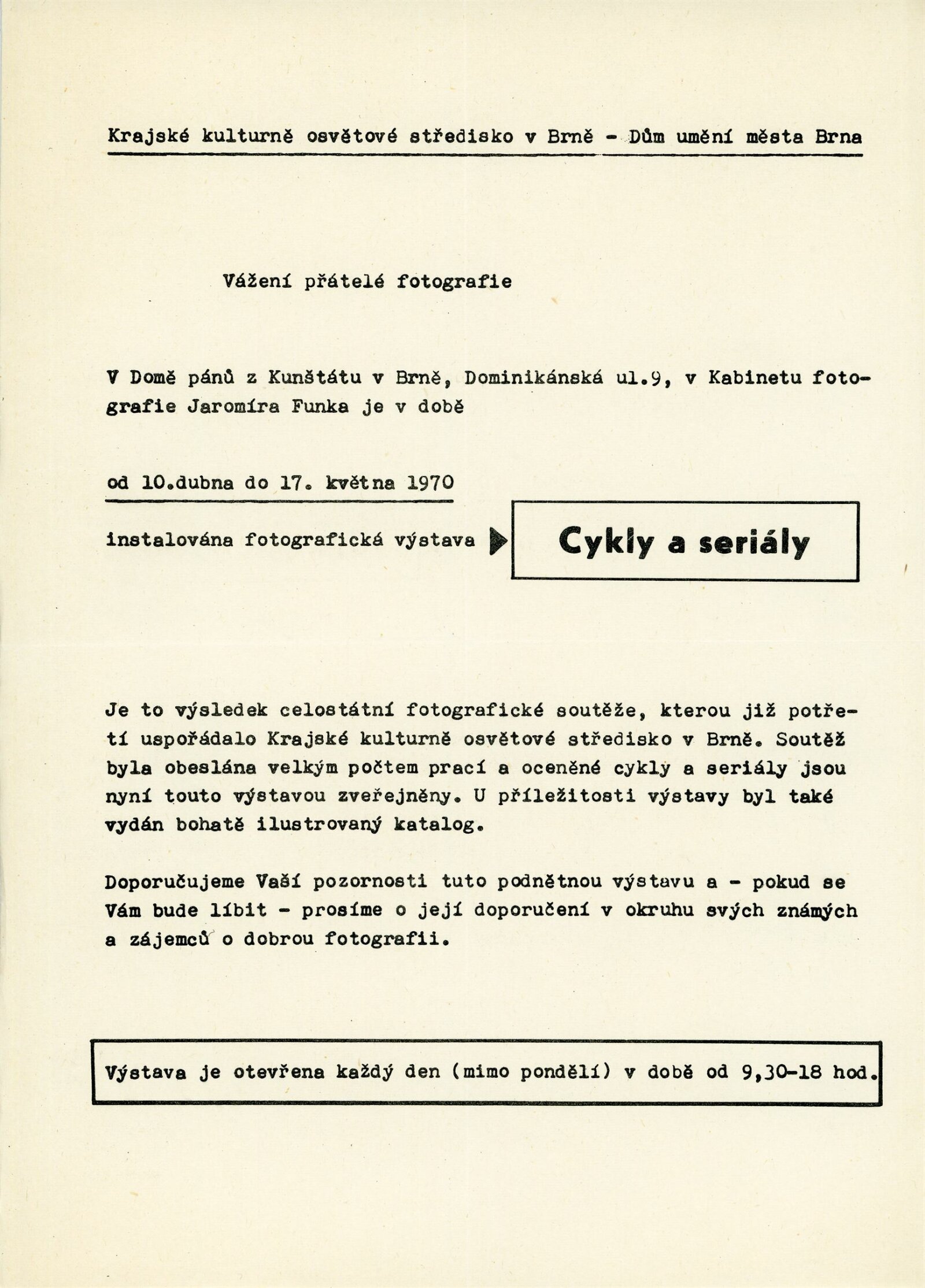 Cykly a seriály: Dům umění města Brna / Dům pánů z Kunštátu, 105. výstava Kabinetu fotografie Jaromíra Funka, 14. 4. – 17. 5. 1970 / Texty: Antonín Koutník, Karel Otto Hrubý. – Brno: Krajské kulturně osvětové středisko, 1970. – 30 s., obr., DPK 442. – MZK; MG