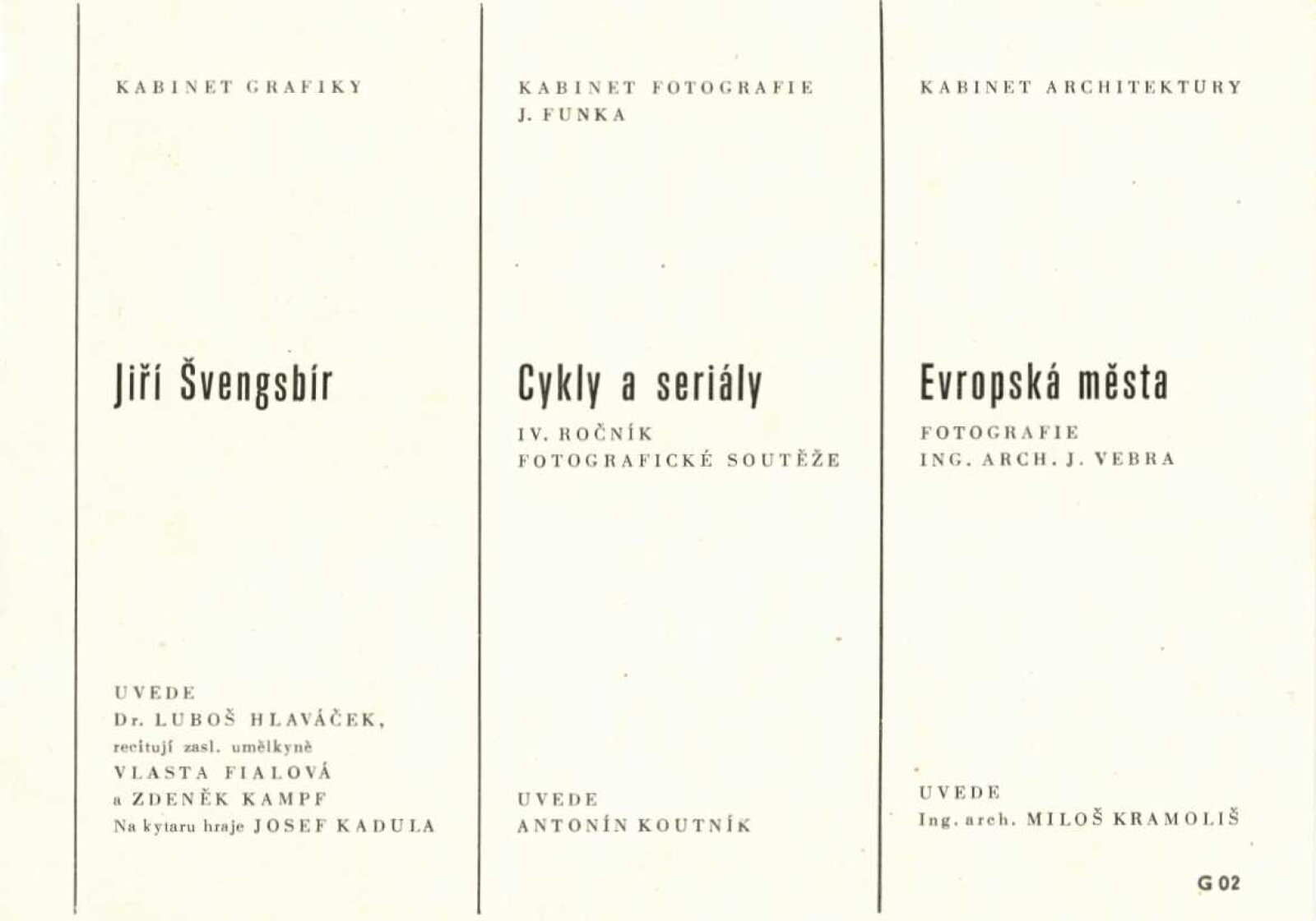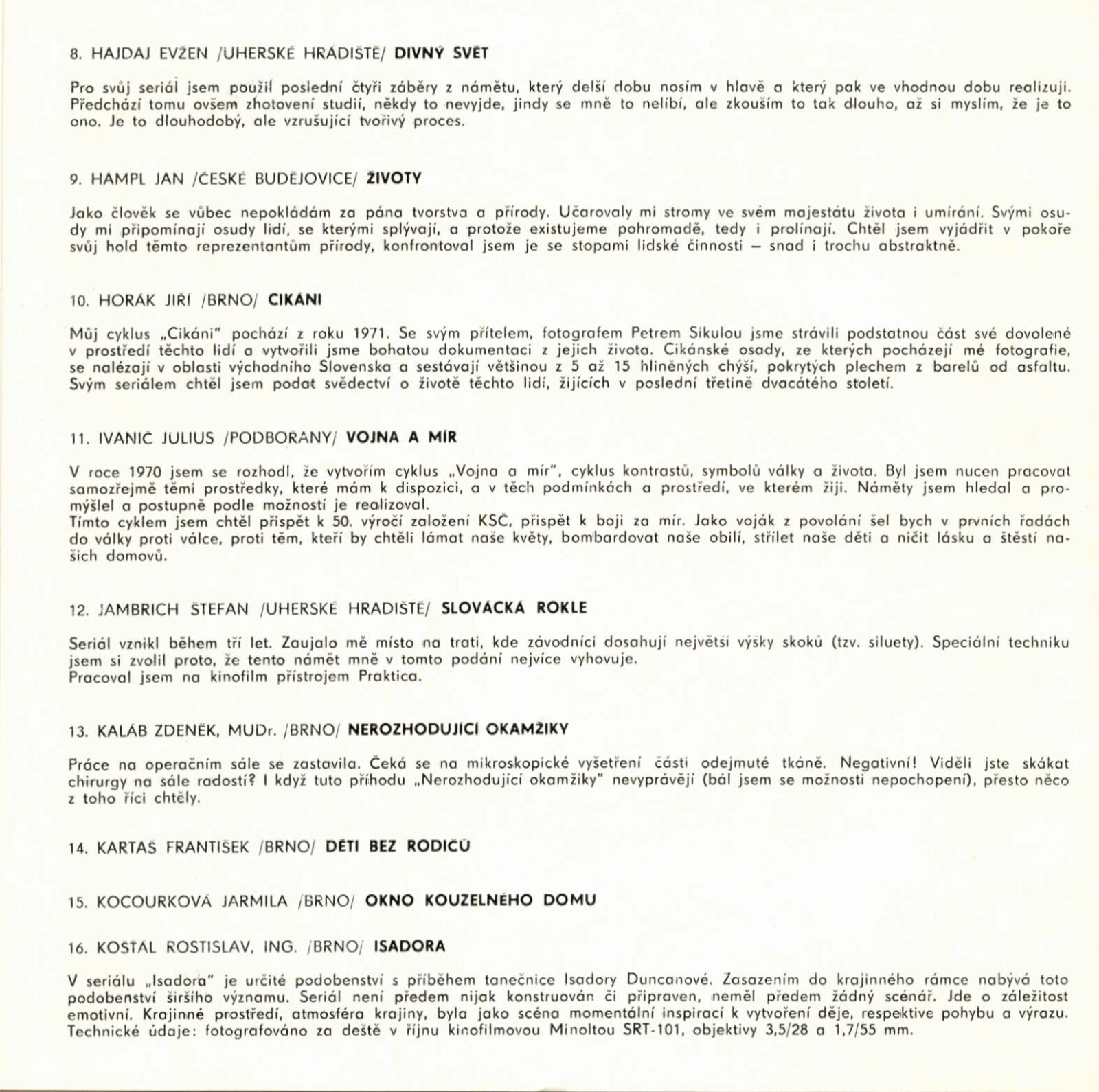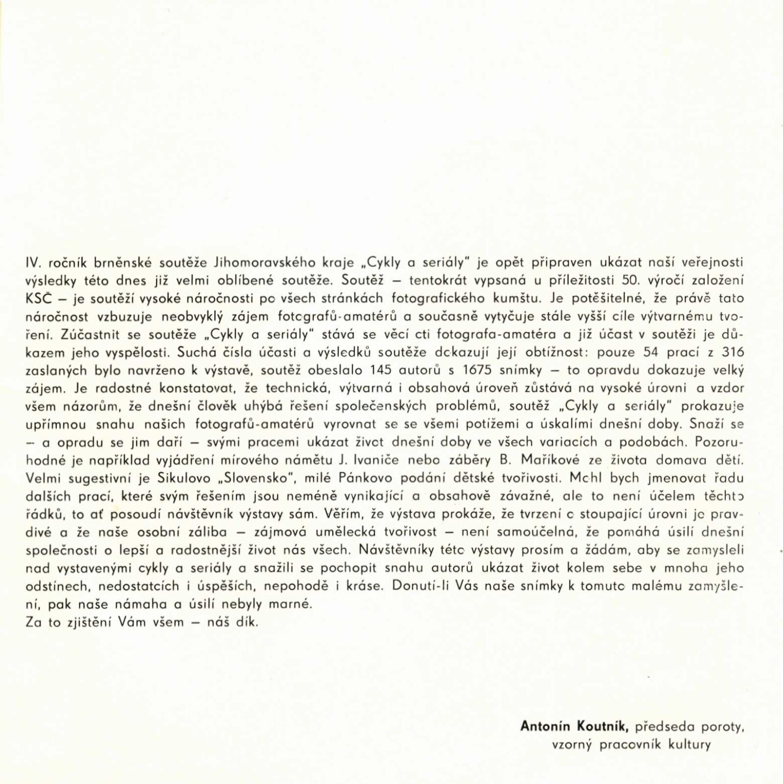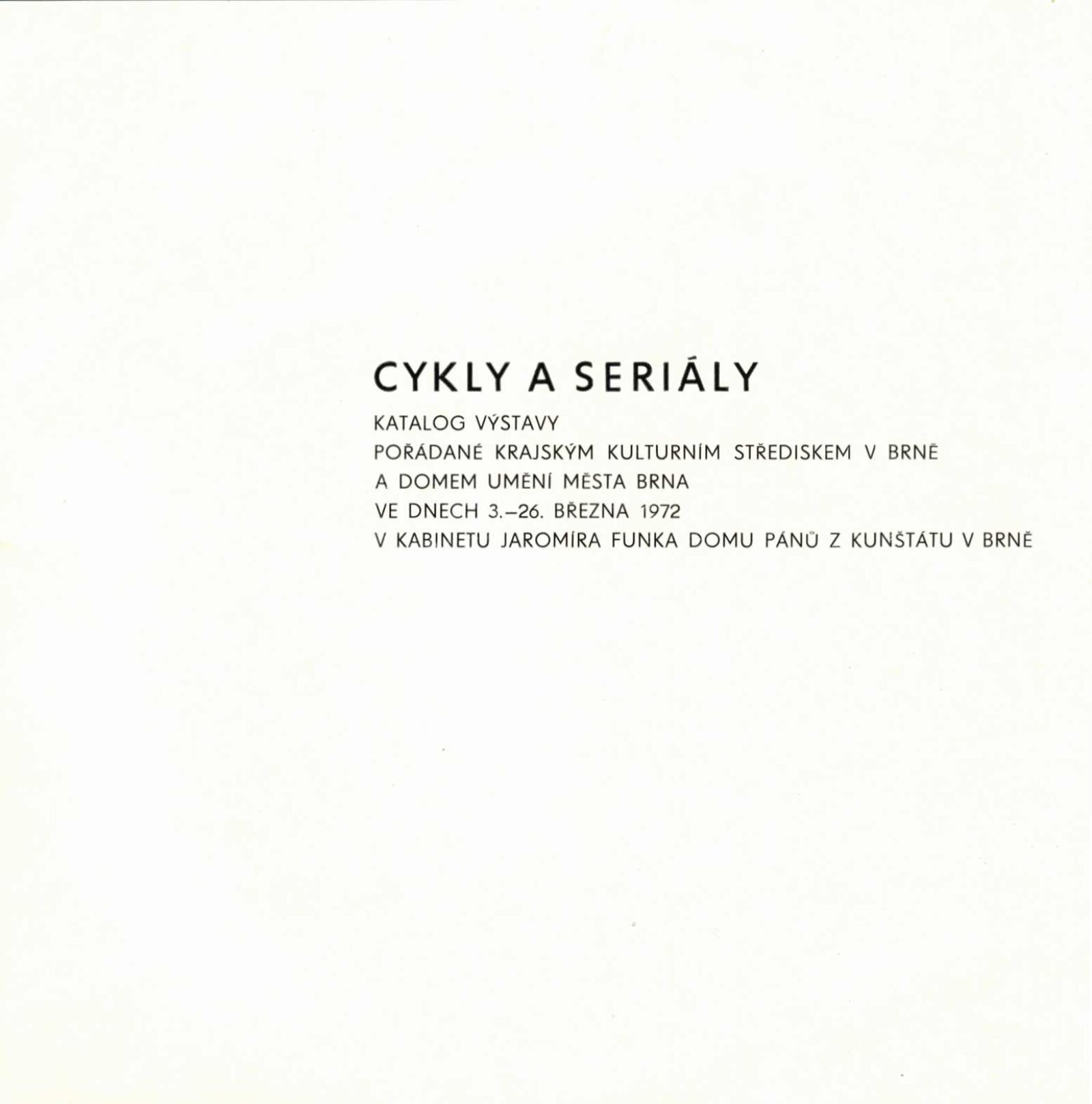 Cykly a seriály. Katalog výstavy: Dům umění města Brna / Dům pánů z Kunštátu, 120. výstava Kabinetu fotografie Jaromíra Funka, 3. 3. – 26. 3. 1972 / Texty: Antonín Koutník, autoři fotografií. – Brno: Krajské kulturní středisko, 1972. – 30 s., obr., DPK 501. – MZK