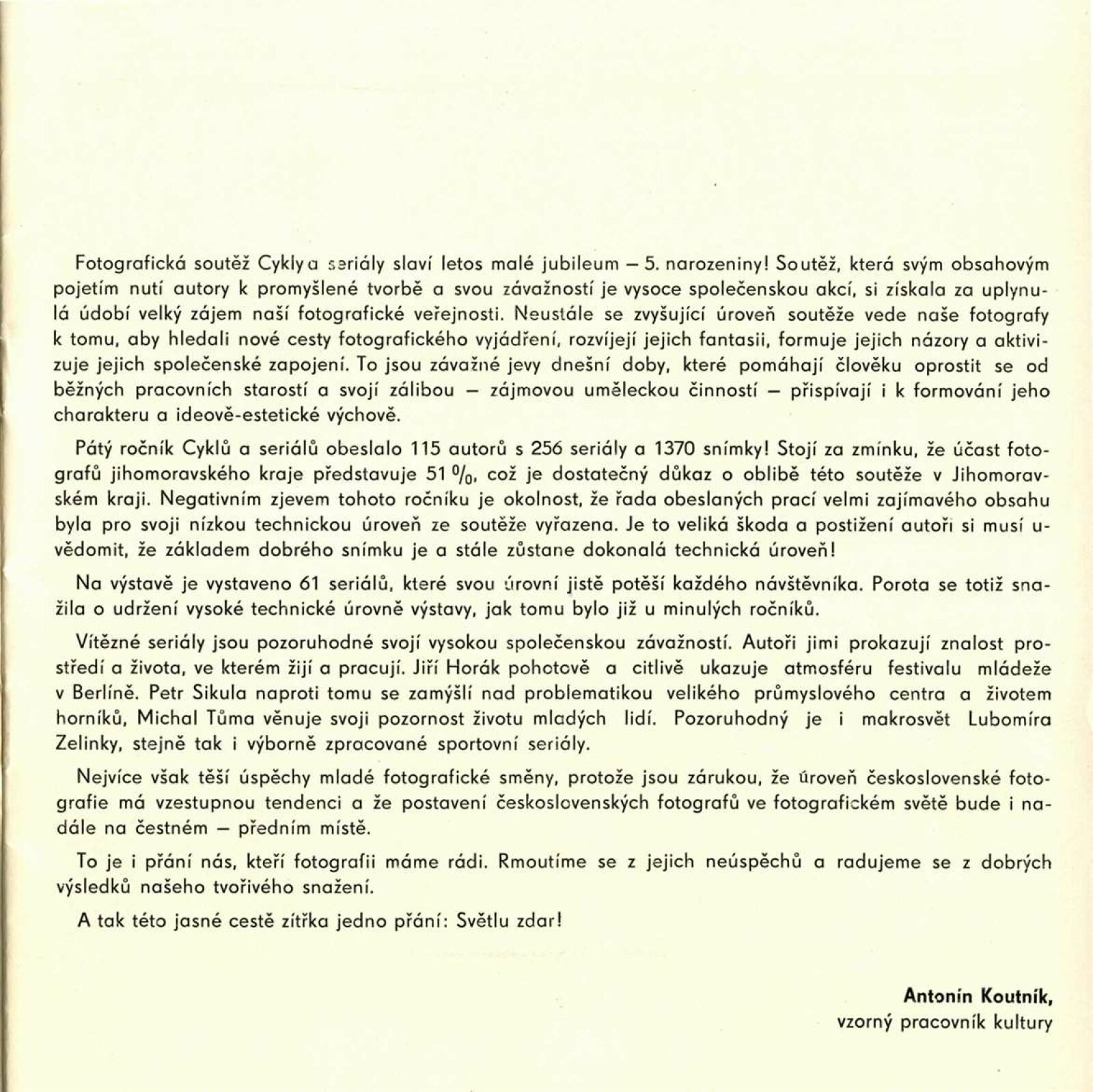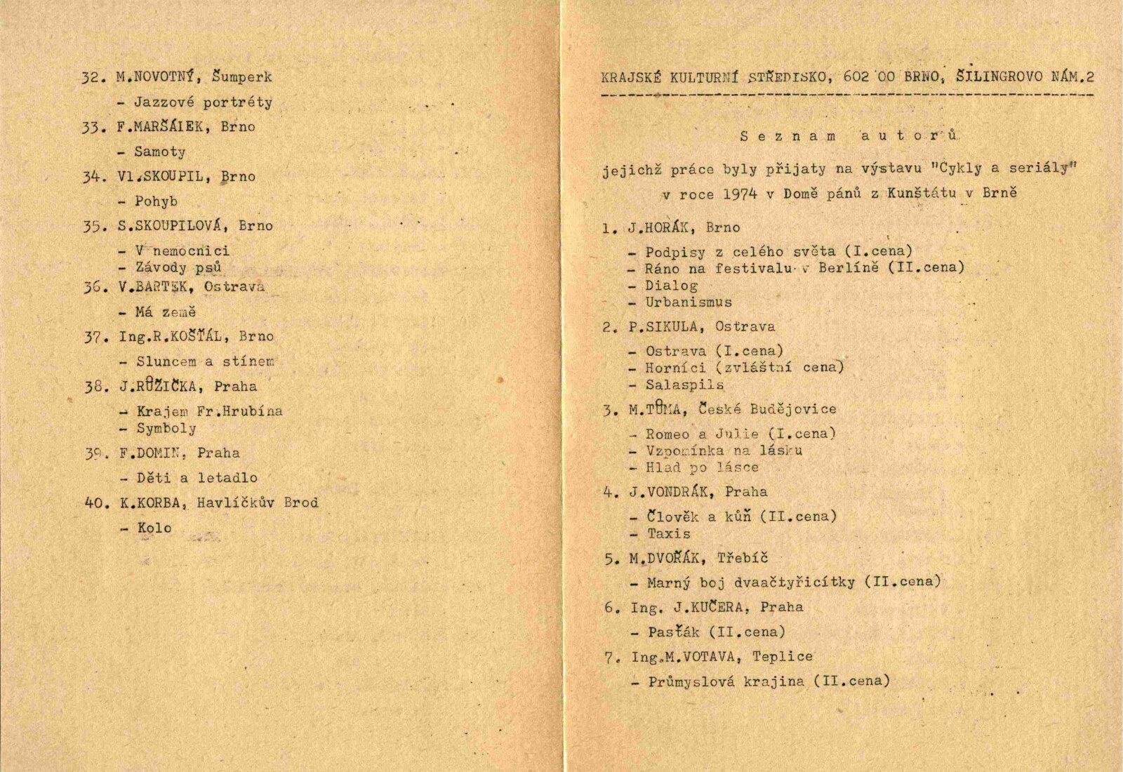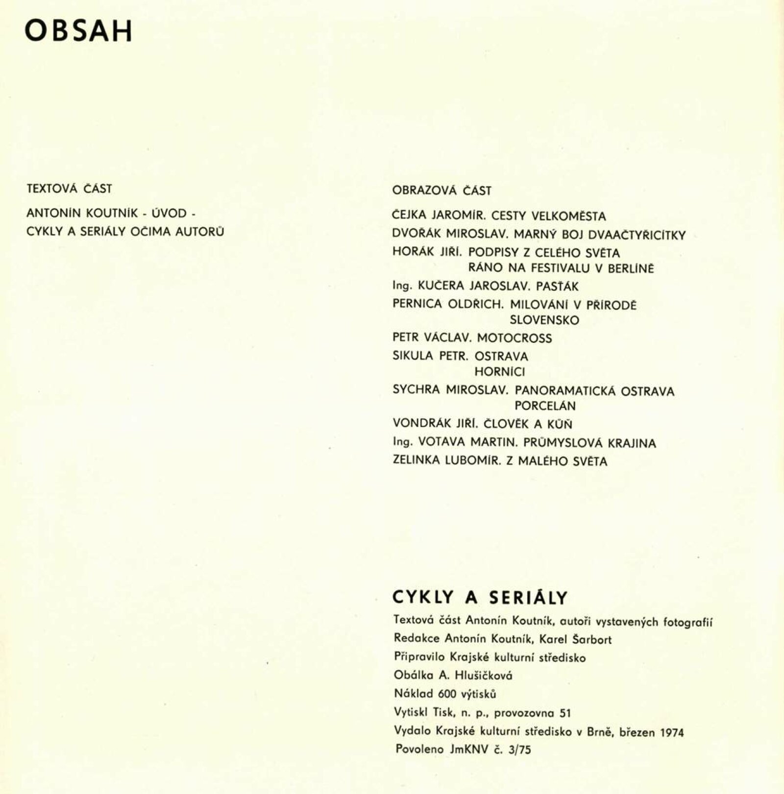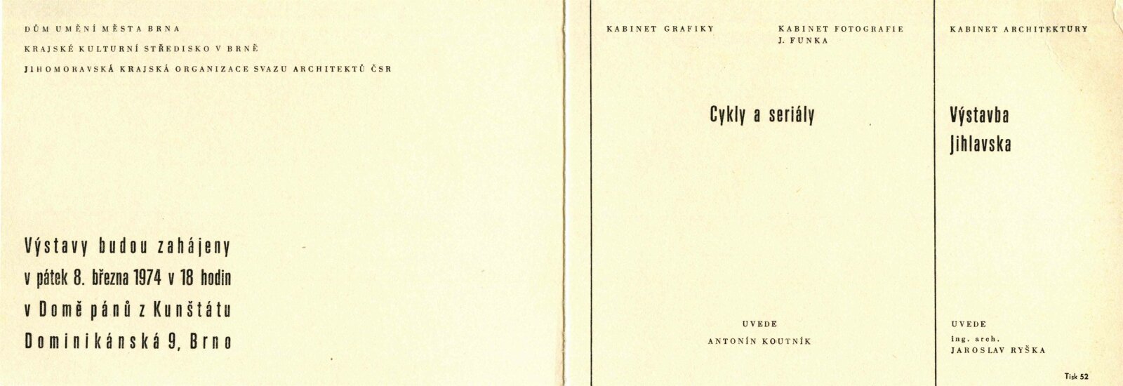 Cykly a seriály: Dům umění / Dům pánů z Kunštátu, 8. 3. – 14. 4. 1974 / Katalog výstavy pořádané Krajským kulturním střediskem a Domem umění města Brna. – Texty: Antonín Koutník a někteří autoři fotografií. – Brno: Krajské kulturní středisko, 1974. – 24 s., obr., DPK 564