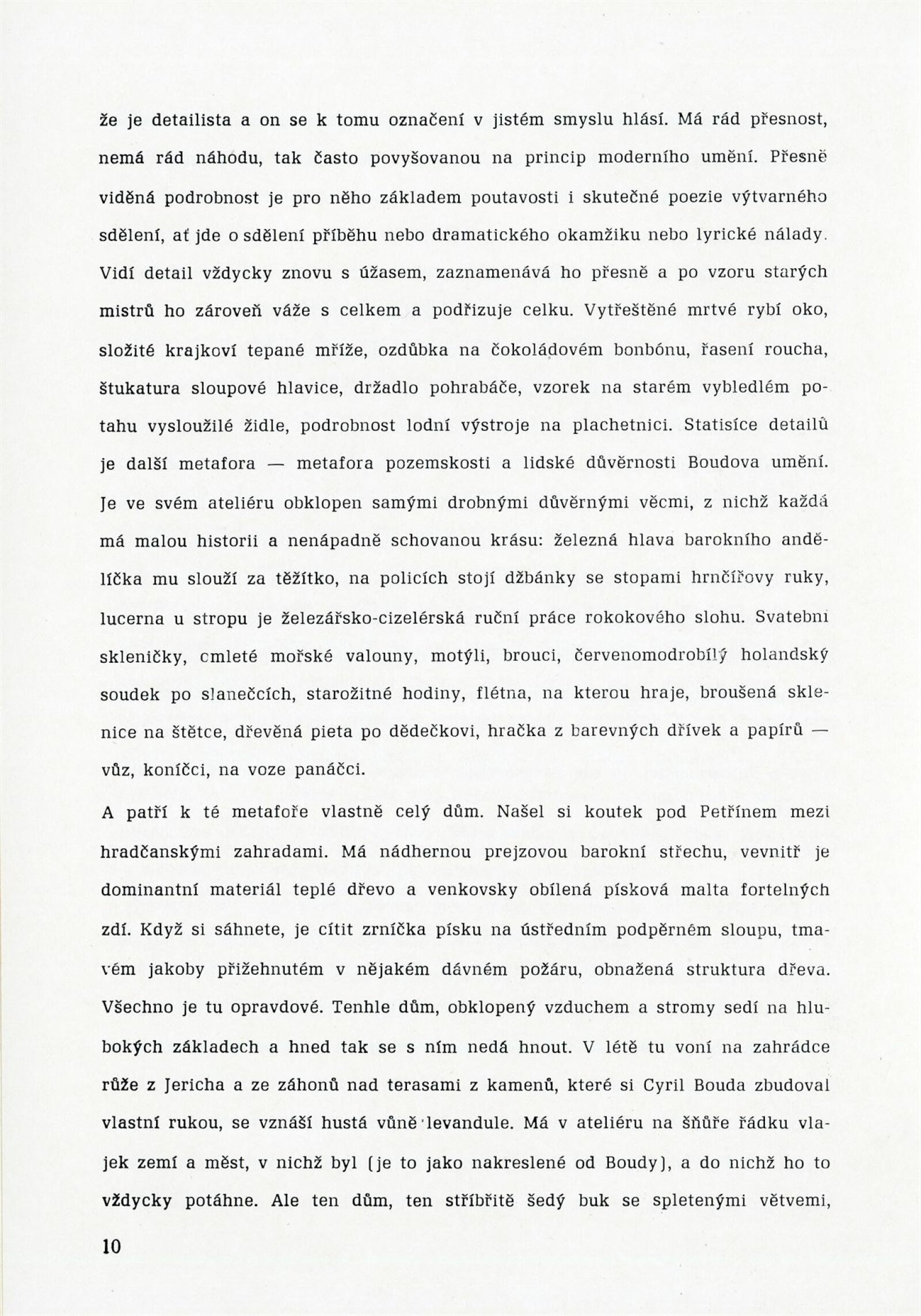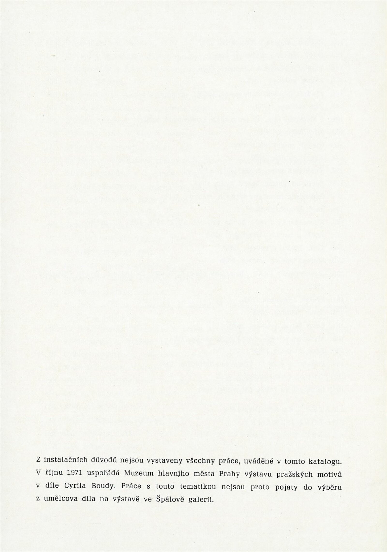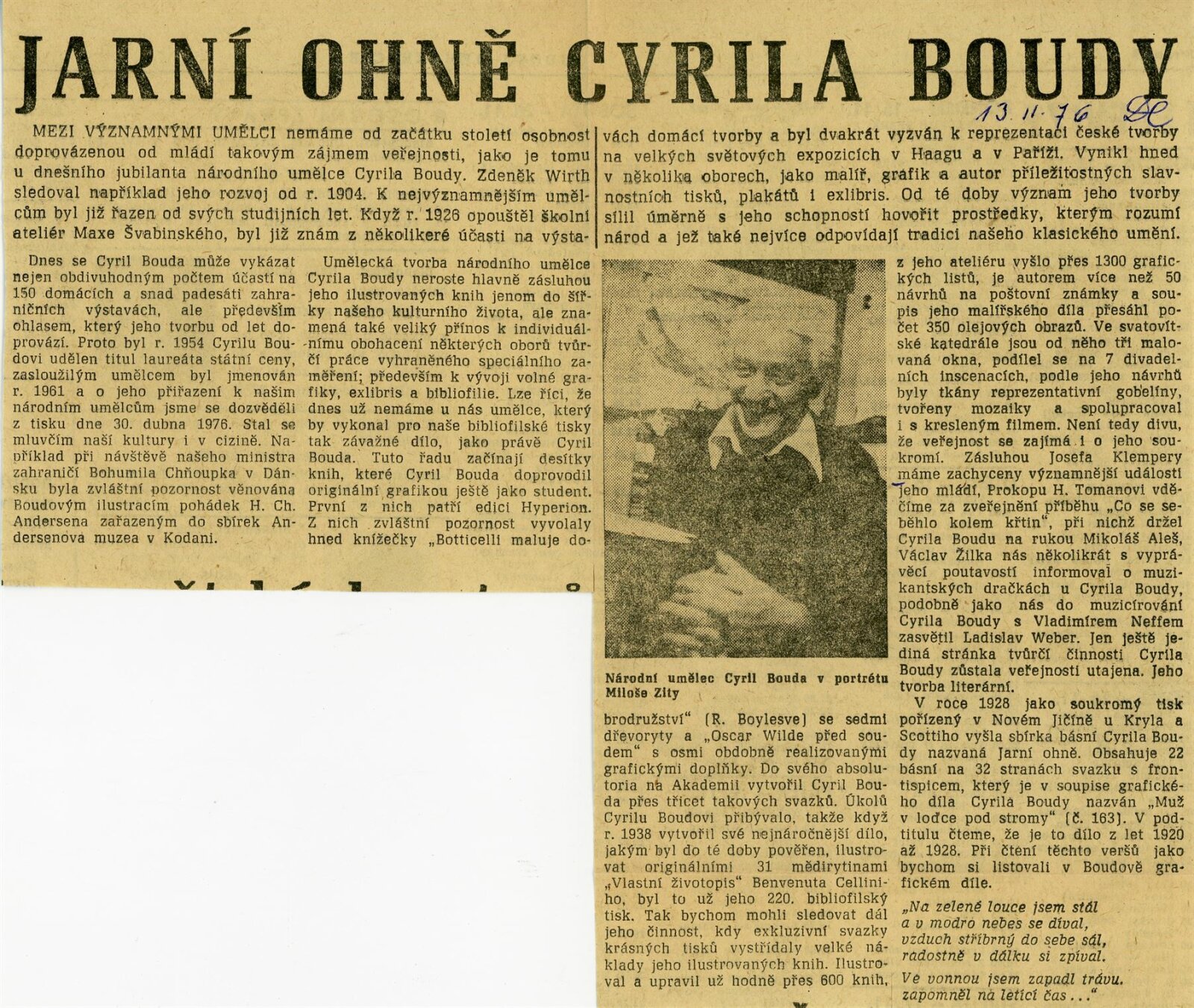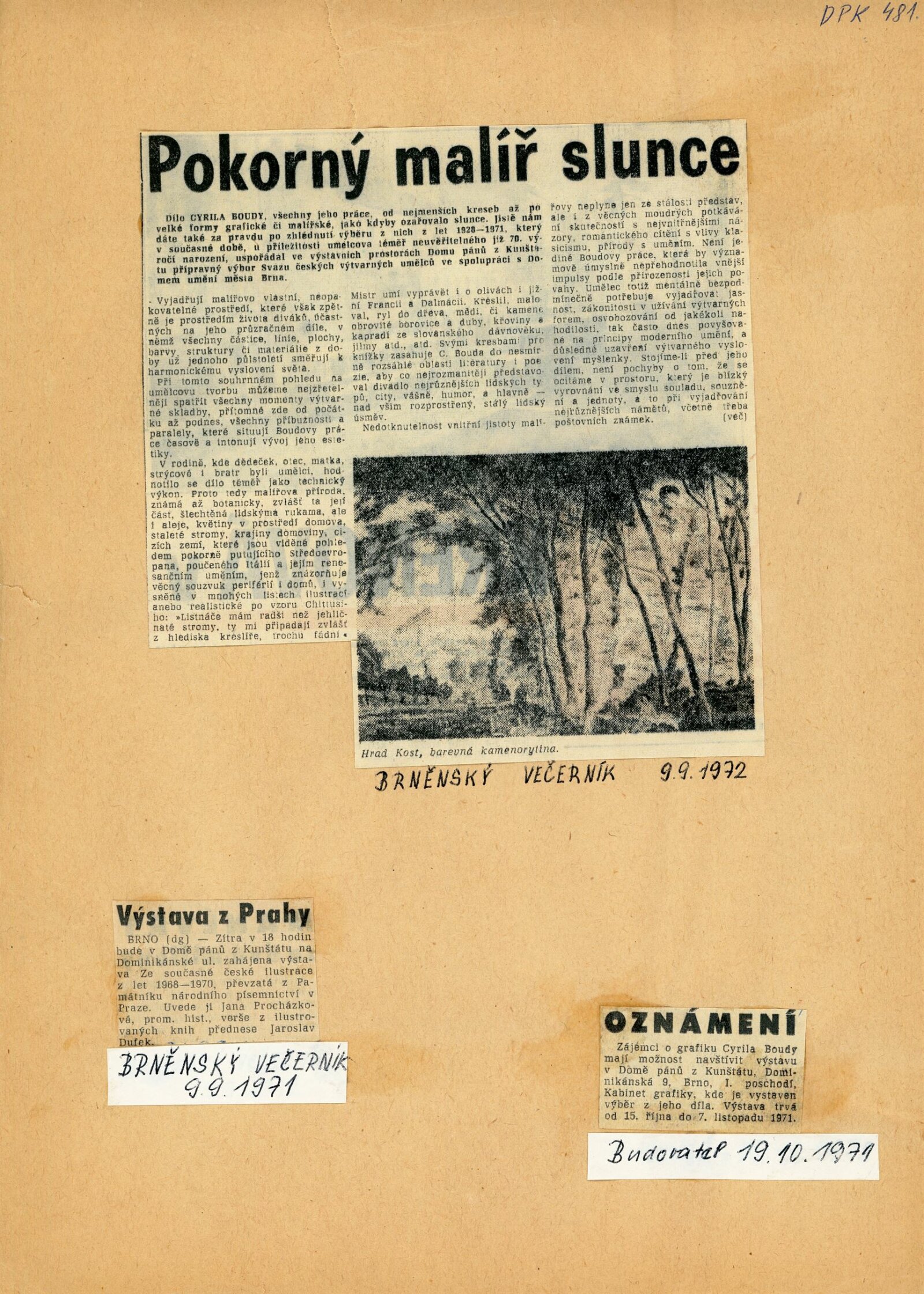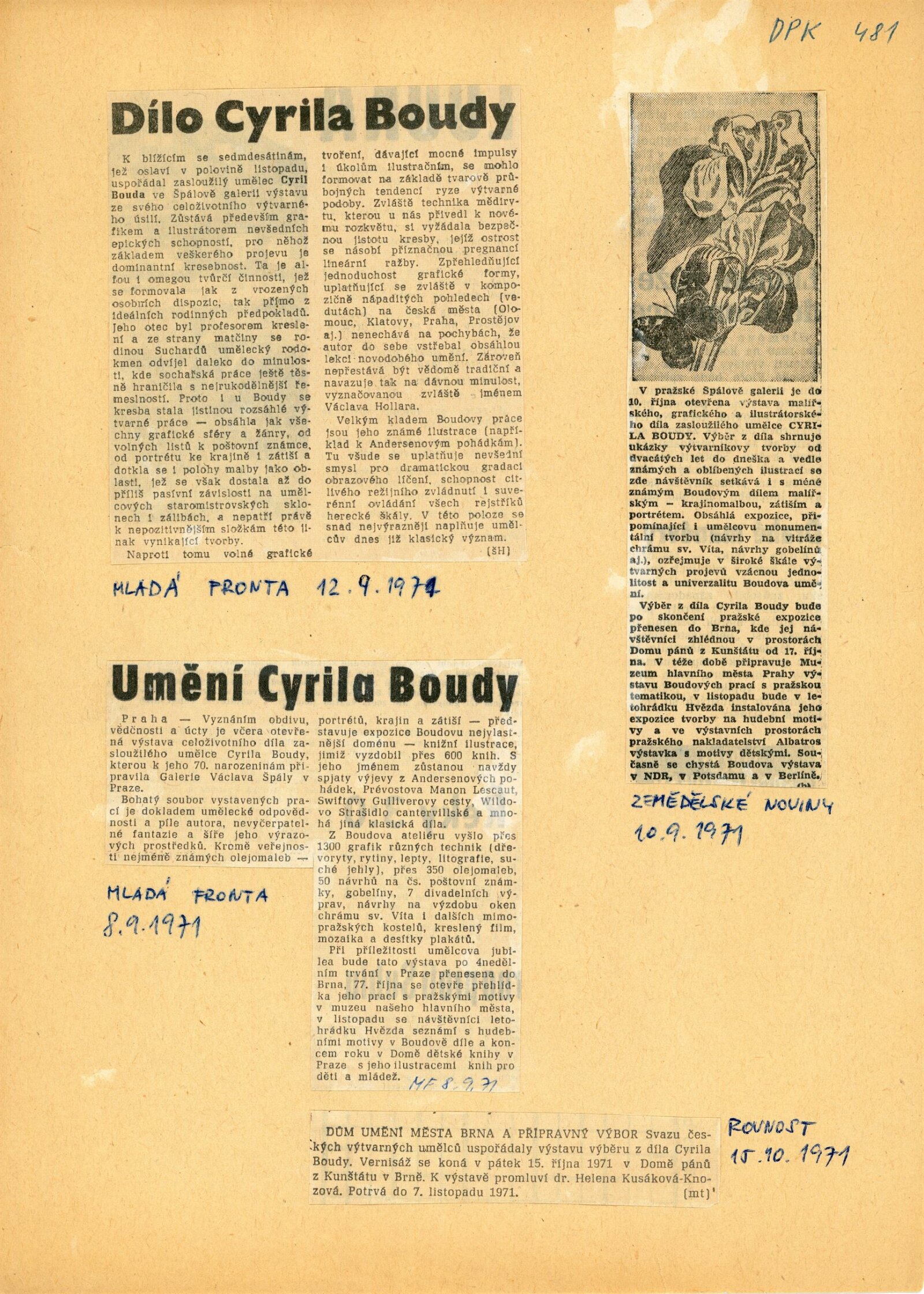 pozvánka, katalog DPK (společný s GVŠ Praha), úvodní slovo na vernisáži (Helena Kusáková-Knozová), seznam prací pro GVŠ Praha, provozní korespondence (SČVU, NG, DU), korespondence o převzetí výstavy (SČVU), žádost o povolení výstavy, recenze v tisku, parte Cyrila Boudy, pozvánka převzaté výstavy (Galerie Václava Špály v Praze), informační leták, katalog (Galerie Josefa R. Vilímka), leták k výstavě v Boskovicích (1976)