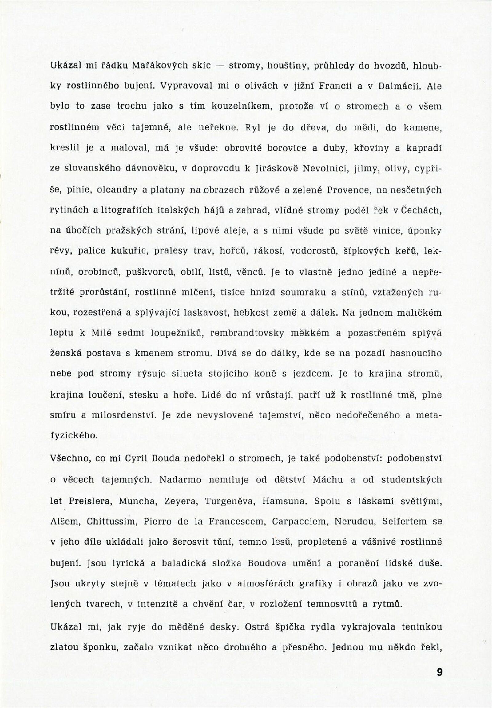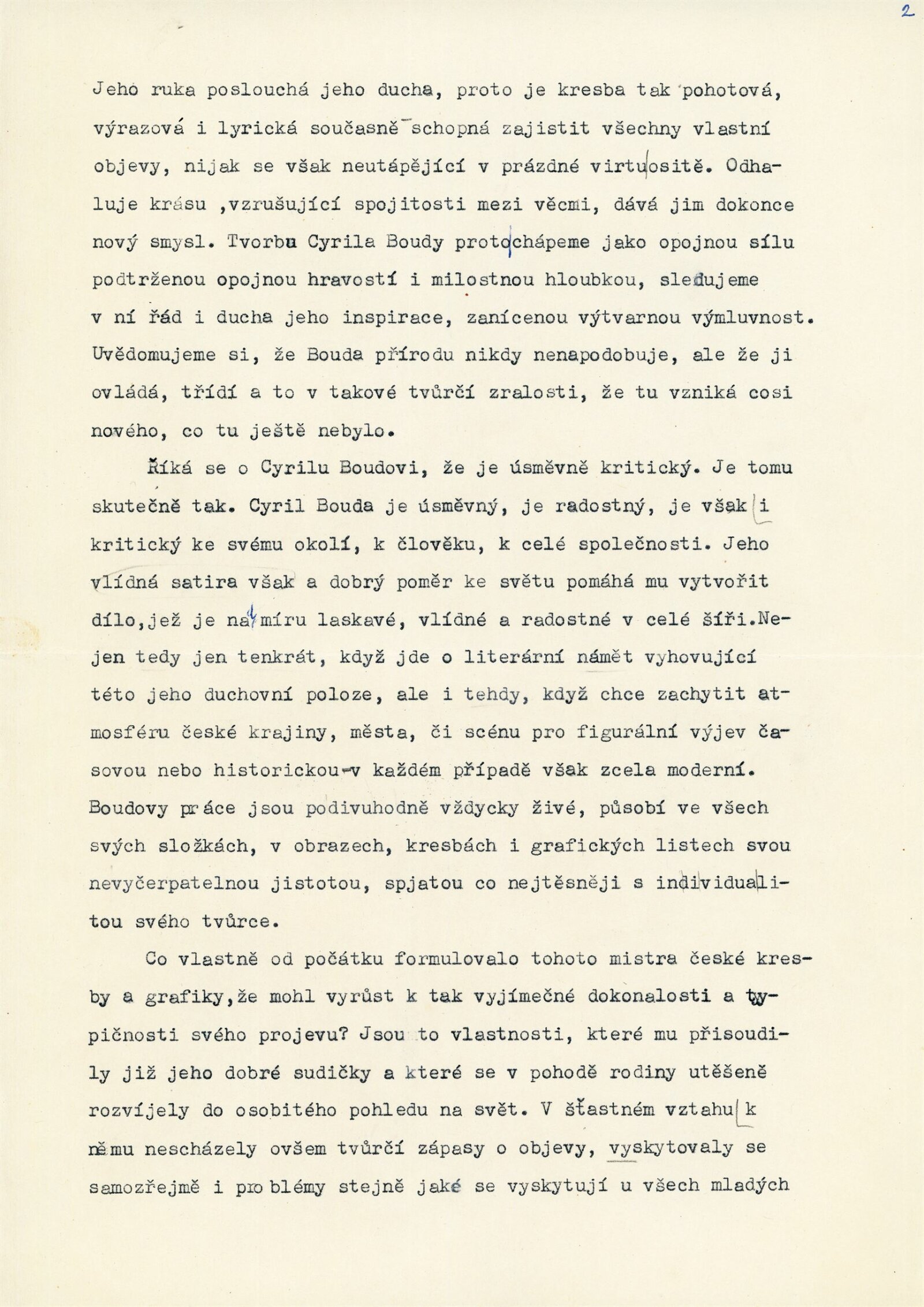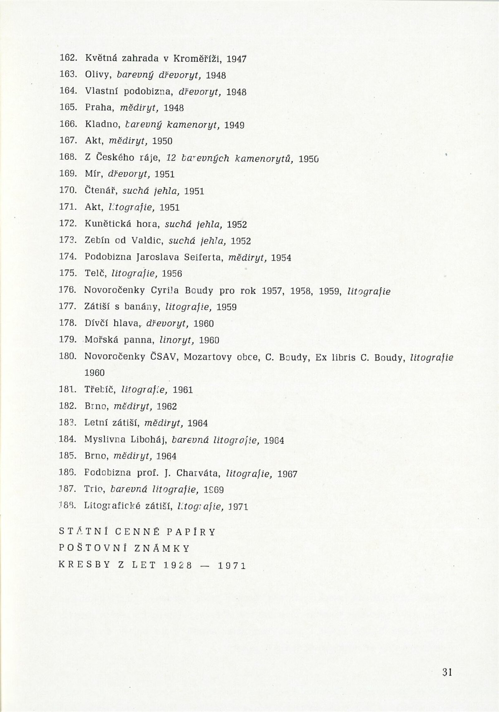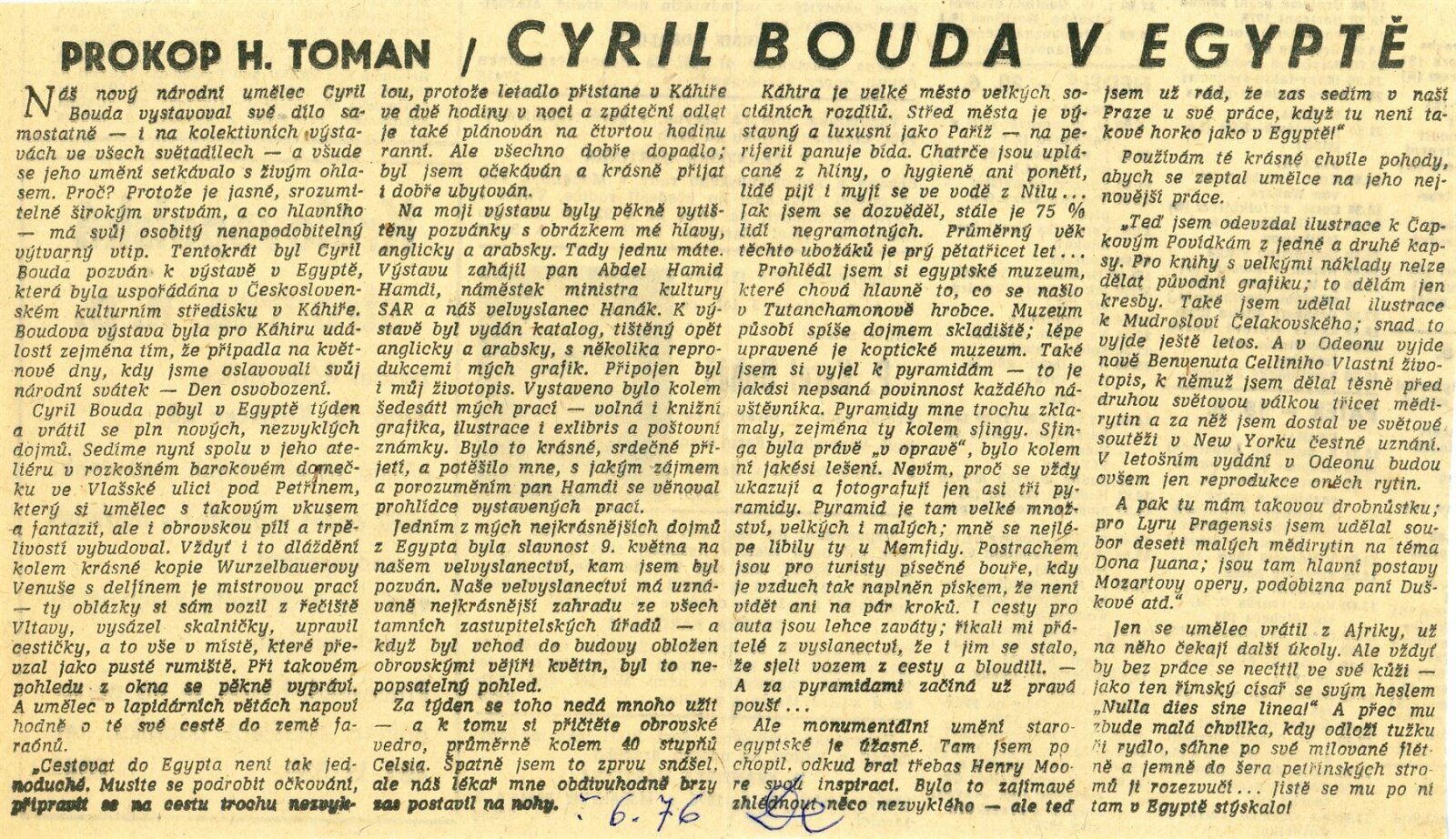 pozvánka, katalog DPK (společný s GVŠ Praha), úvodní slovo na vernisáži (Helena Kusáková-Knozová), seznam prací pro GVŠ Praha, provozní korespondence (SČVU, NG, DU), korespondence o převzetí výstavy (SČVU), žádost o povolení výstavy, recenze v tisku, parte Cyrila Boudy, pozvánka převzaté výstavy (Galerie Václava Špály v Praze), informační leták, katalog (Galerie Josefa R. Vilímka), leták k výstavě v Boskovicích (1976)