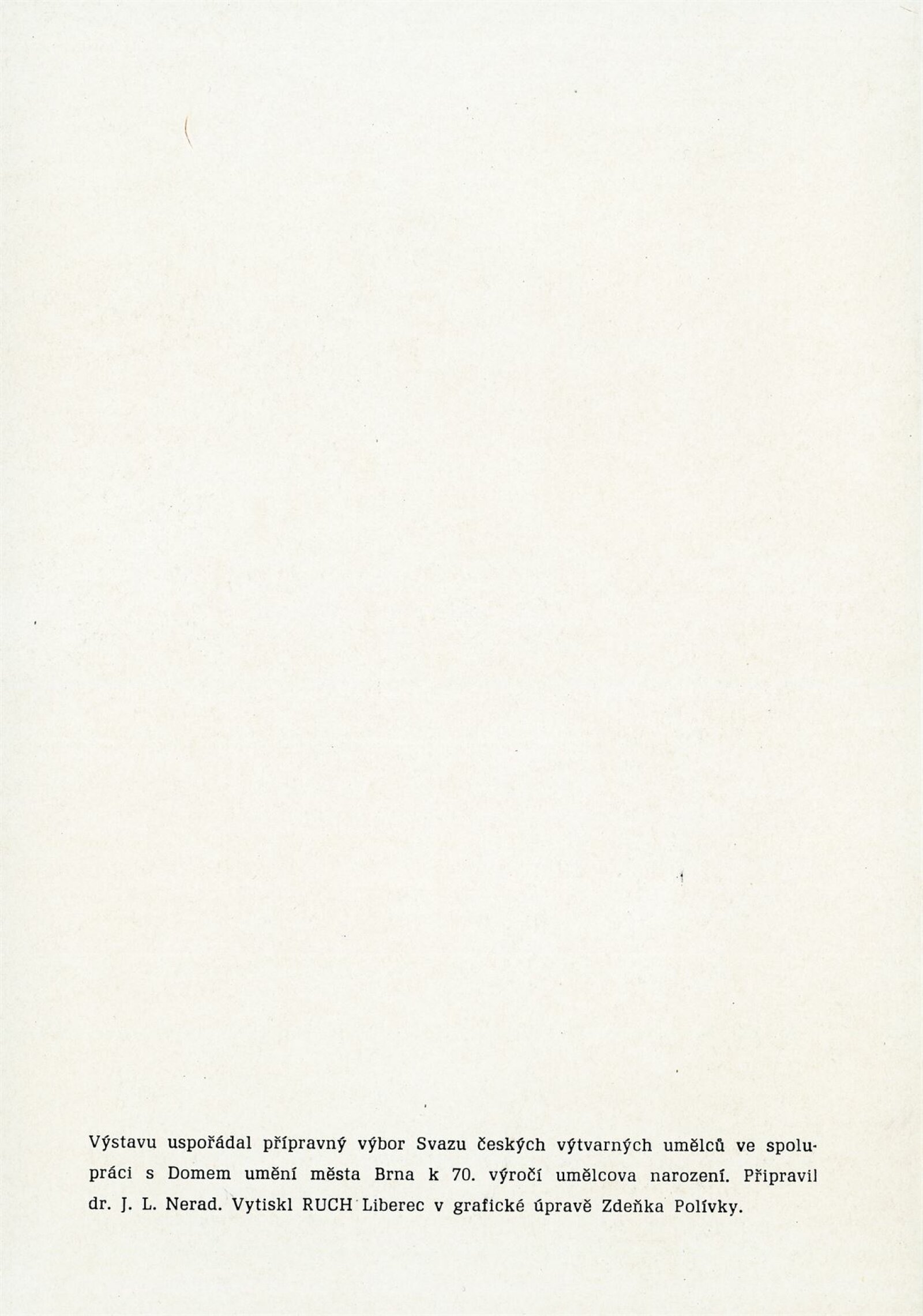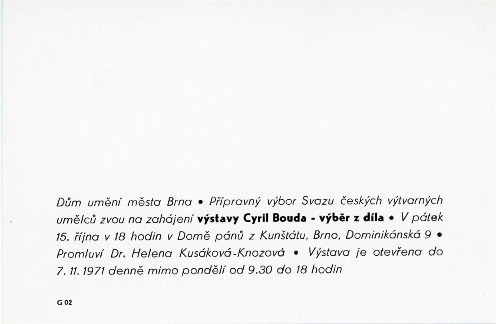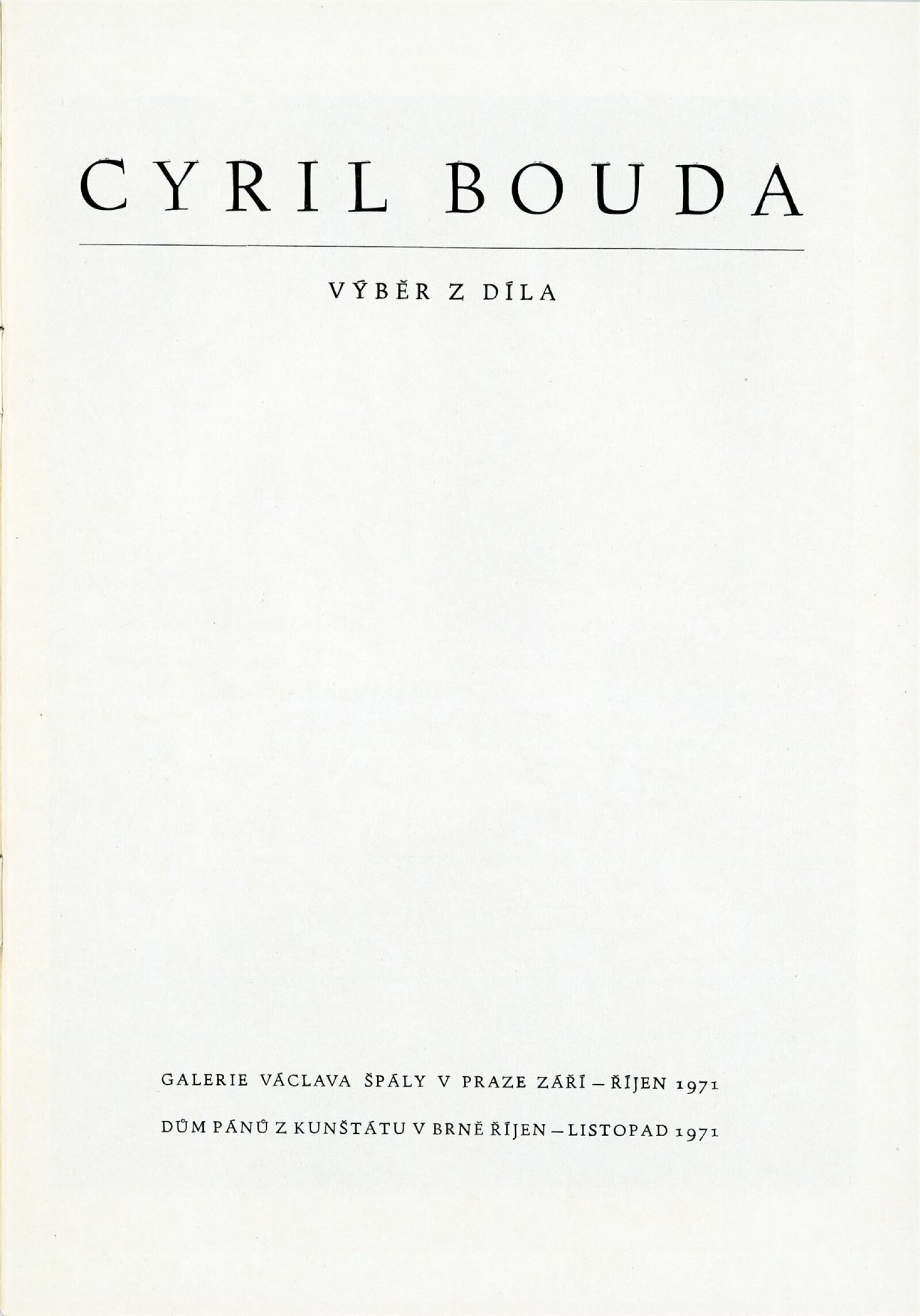 Cyril Bouda. Výběr z díla: Dům umění města Brna / Dům pánů z Kunštátu, 15. 10. – 7. 11. 1971 / Texty: Josef Lev Nerad, Sergěj Machonin. – Praha: SČVU, 1971. – 31 s., obr., portrét, životopis