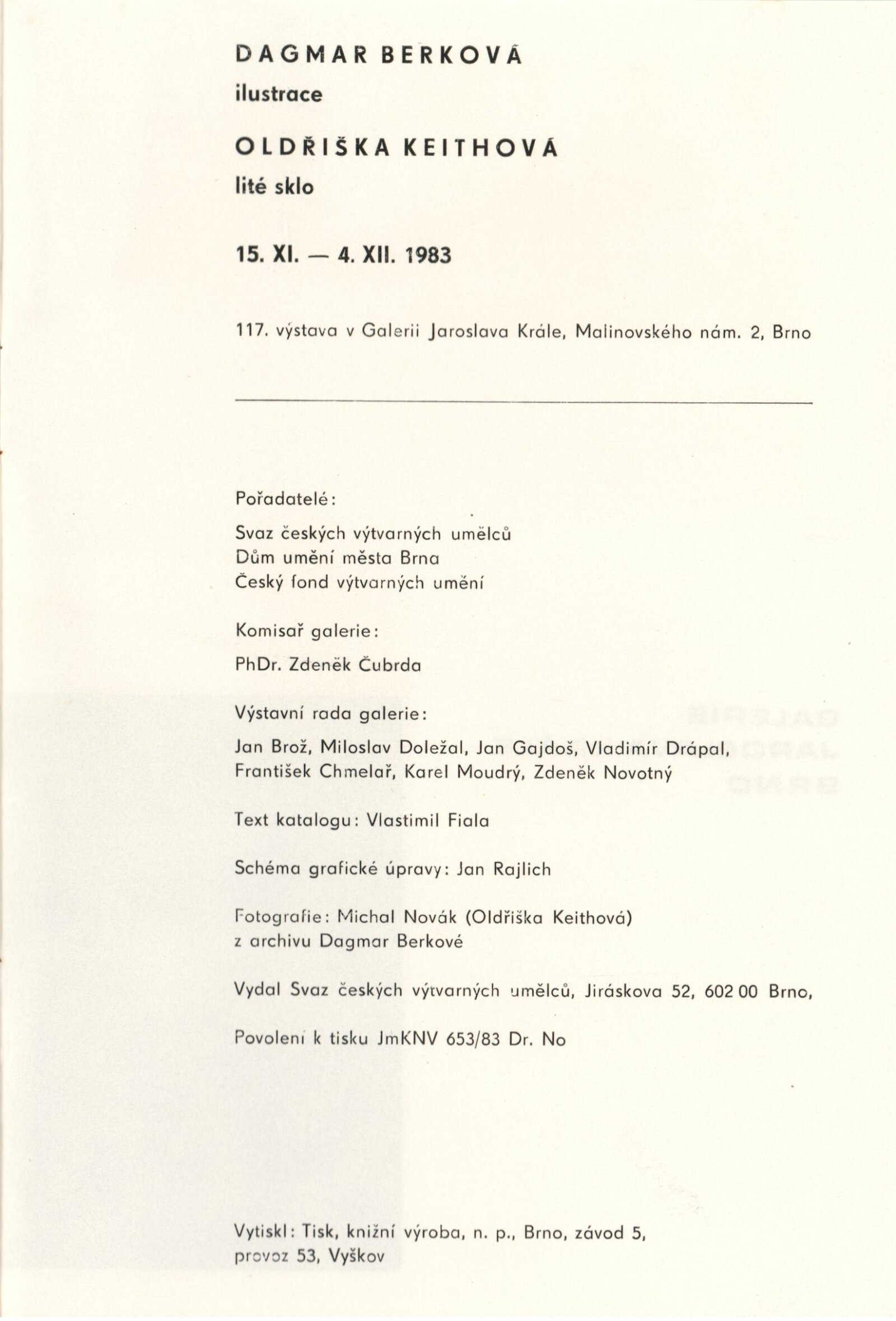 Dagmar Berková. Ilustrace. Oldřiška Keithová. Lité sklo: Dům umění, 117. výstava v Galerii Jaroslava Krále, 15. 11. – 4. 12. 1983 / Text: Vlastimil Fiala. – Brno SČVU, 1983. – 12 s., obr., Berková: portrét, životopis, seznam výstav, oceněných knih, cen, loutkových filmů, Keithová: portrét, životopis, seznam výstav, realizací, DU 770. – MG