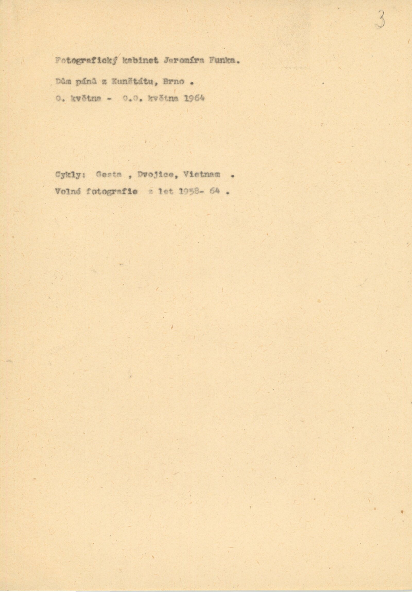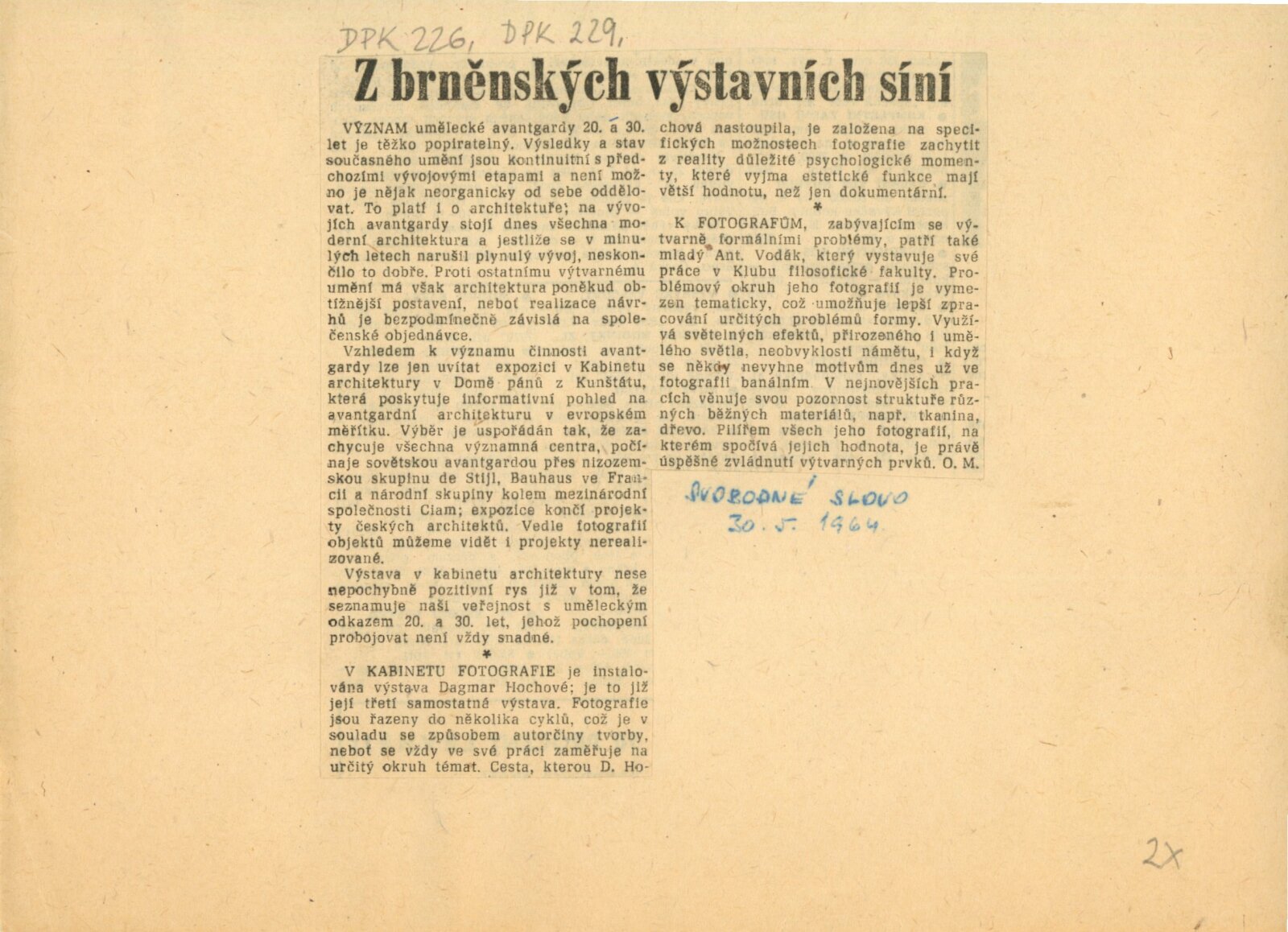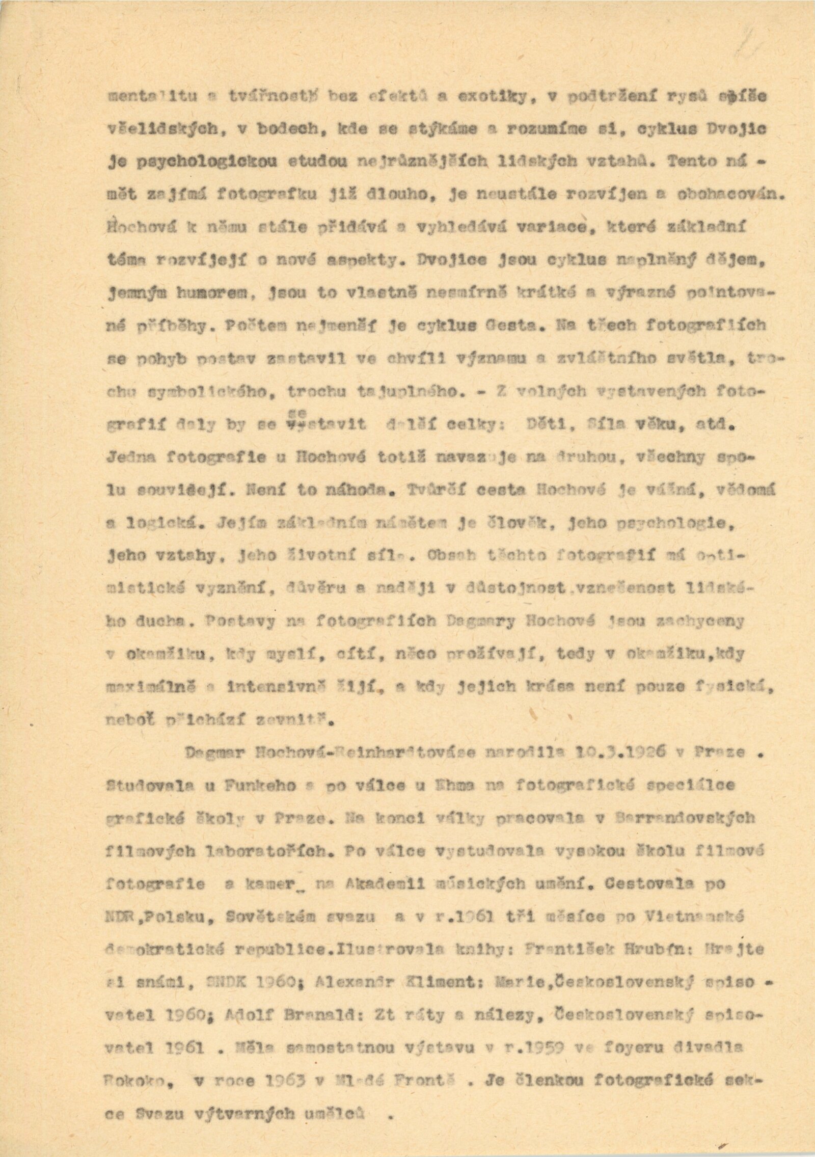 Dagmar Hochová. Fotografie: Dům umění města Brna / Dům pánů z Kunštátu, 55. výstava Kabinetu fotografie Jaromíra Funka, 7. 5. – 31. 5. 1964 / Text: Anna Fárová. – Brno: DUmB, 1964. – skládačka, 6 s., obr., neobsahuje seznam vystavených fotografií, DPK 229. – MZK; MG