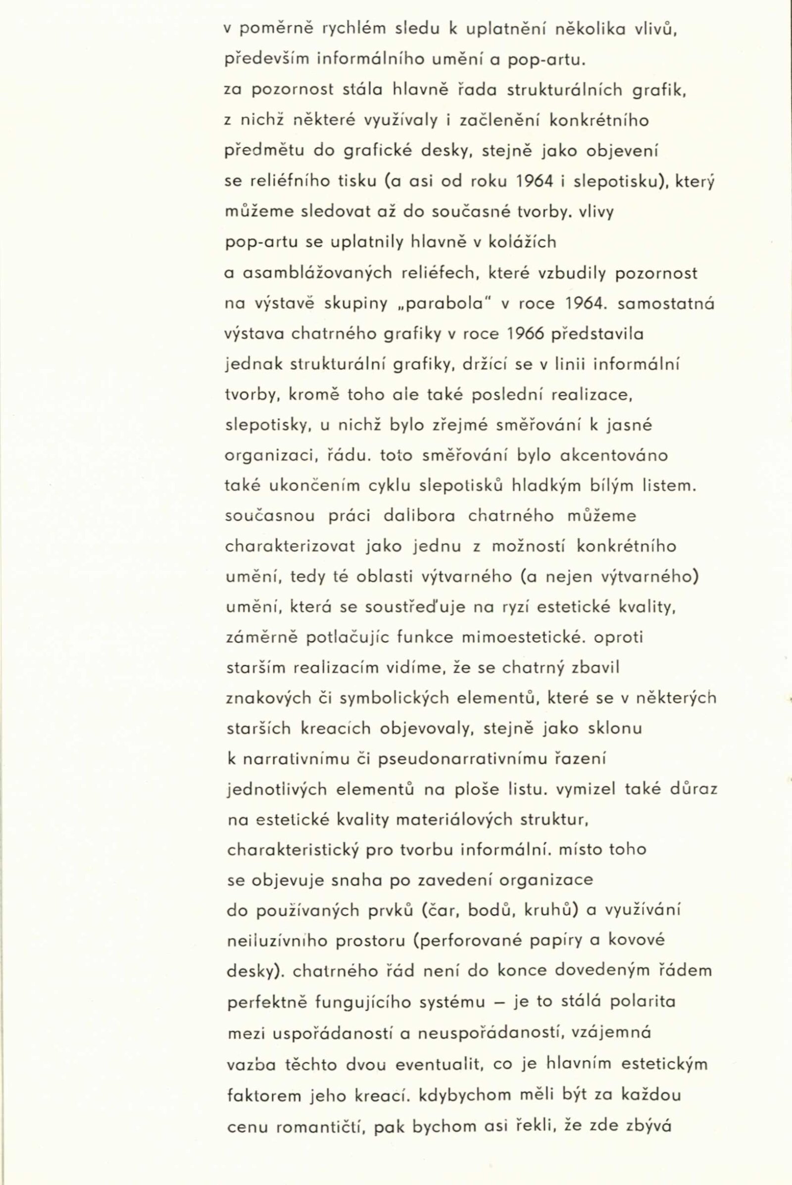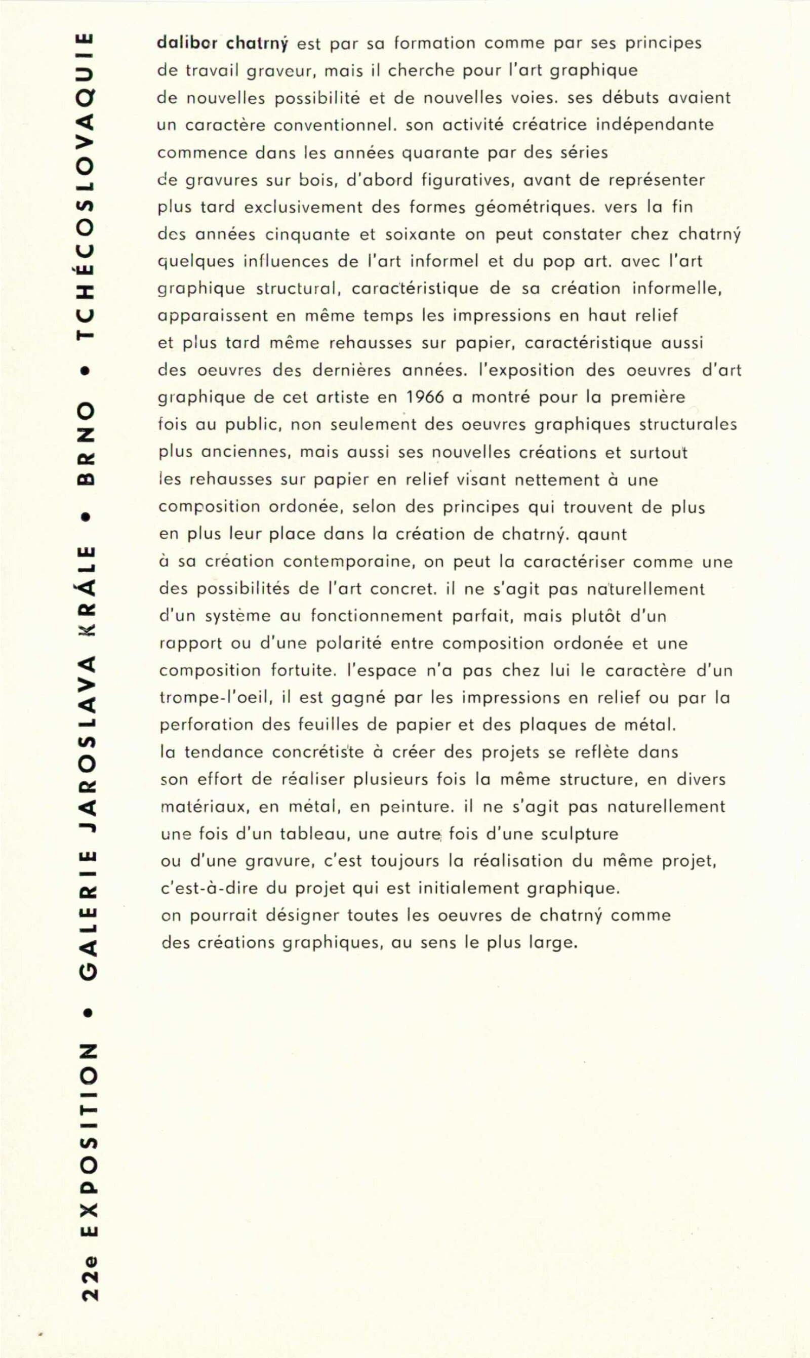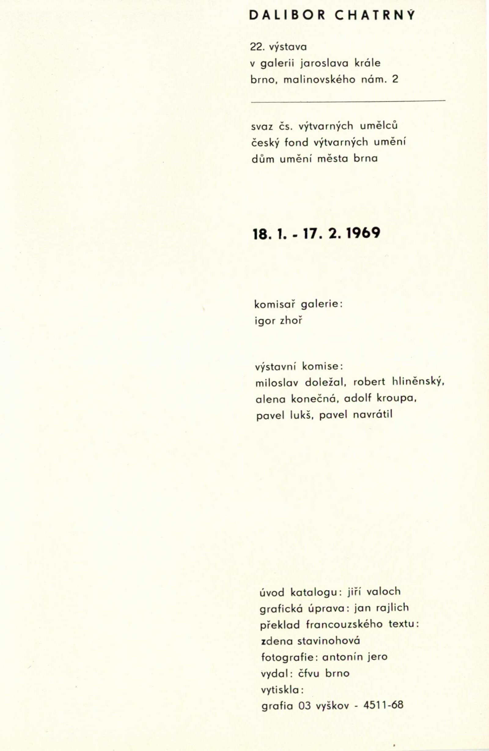 Dalibor Chatrný: Dům umění, 22. výstava v Galerii Jaroslava Krále, 18. 1. – 17. 2. 1969 / Text: Jiří Valoch. – Brno: ČFVU, 1969. – 10 s., obr., portrét, životní data, seznam výstav, DU 515. – MZK; MG; MMB