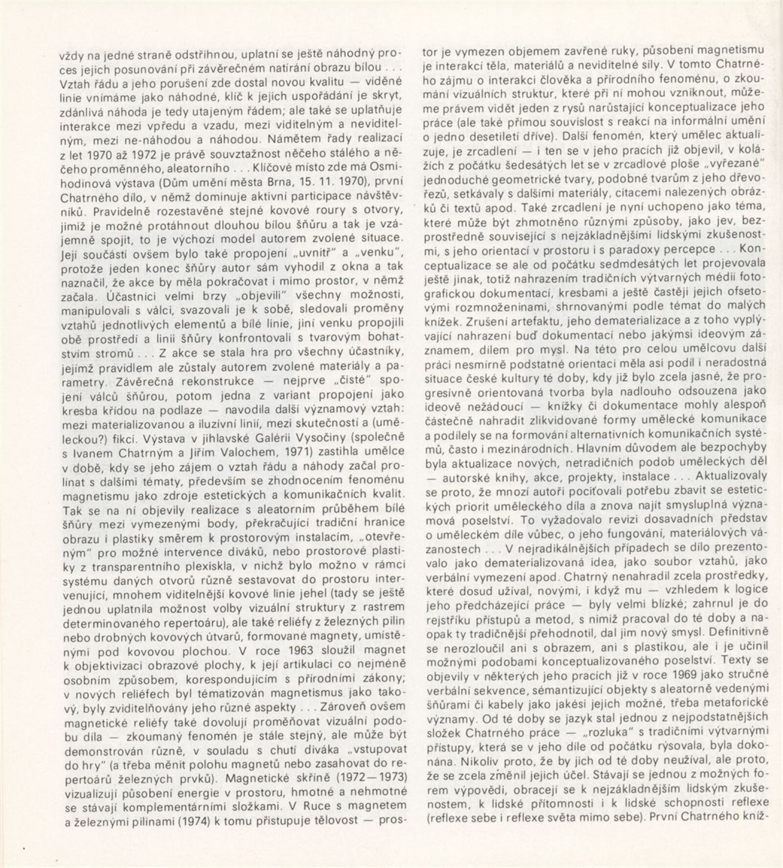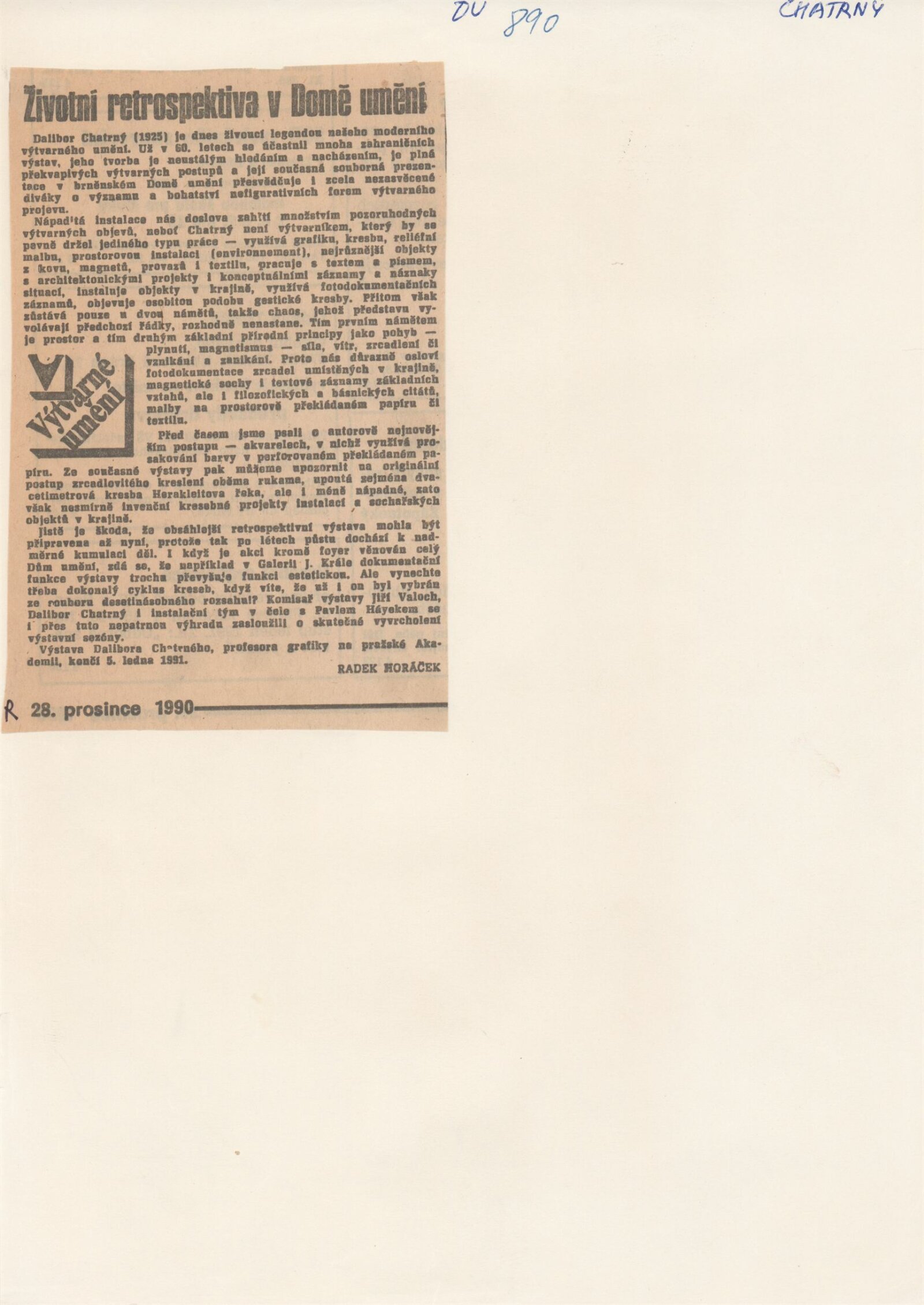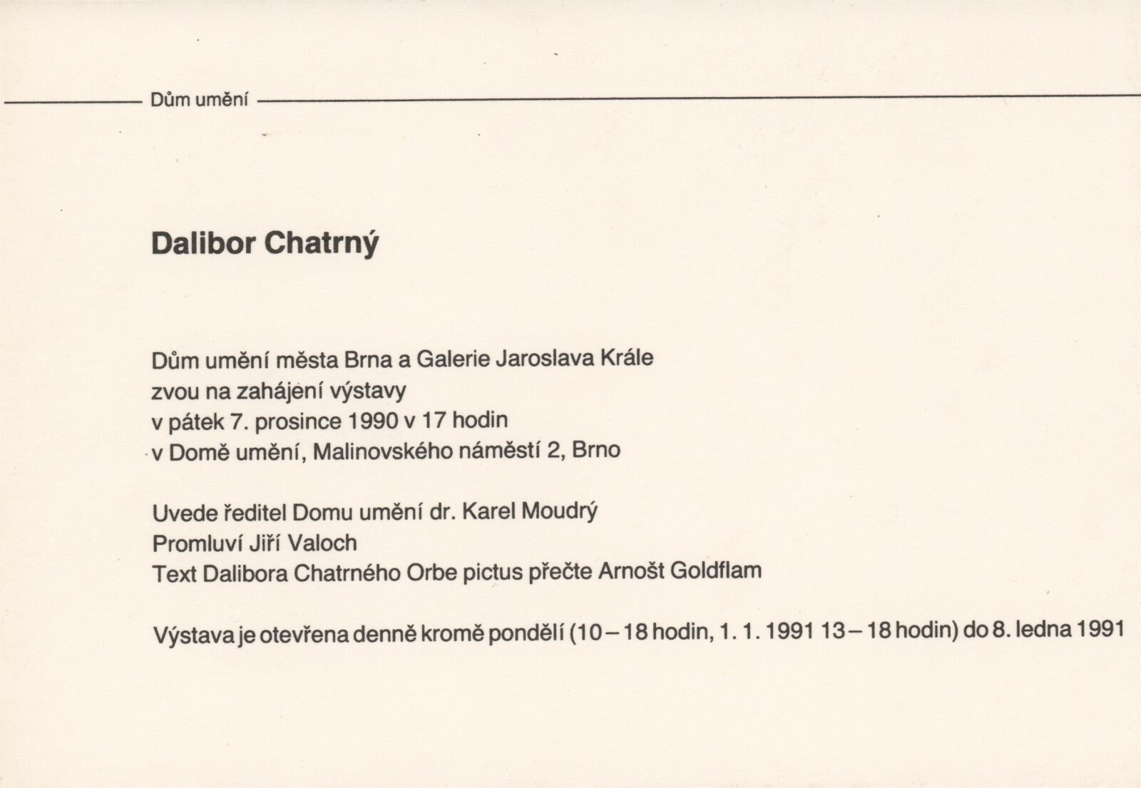 Dalibor Chatrný: Dům umění města Brna, Galerie Jaroslava Krále, 1. patro, 7. 12. 1990 – 7. 1. 1991 / Text: Jiří Valoch. – Brno: DUmB, 1990. – [66] s., obr., životní data, výstavy, zastoupení ve sbírkách, ceny, soukromé publikace, realizace, DU 890. – MZK; MG; MMB