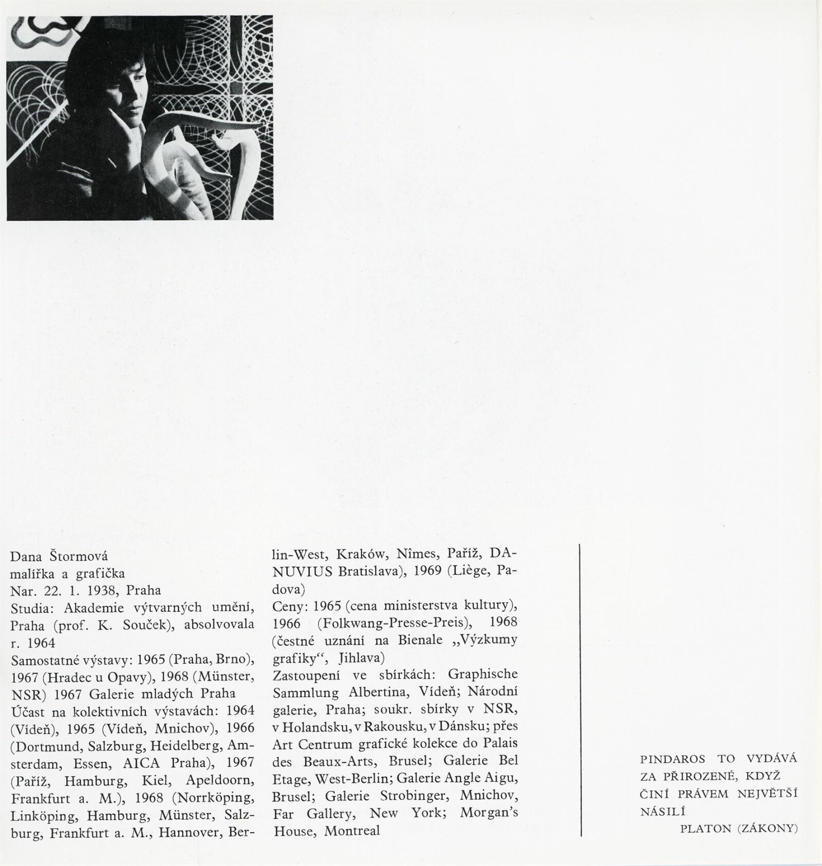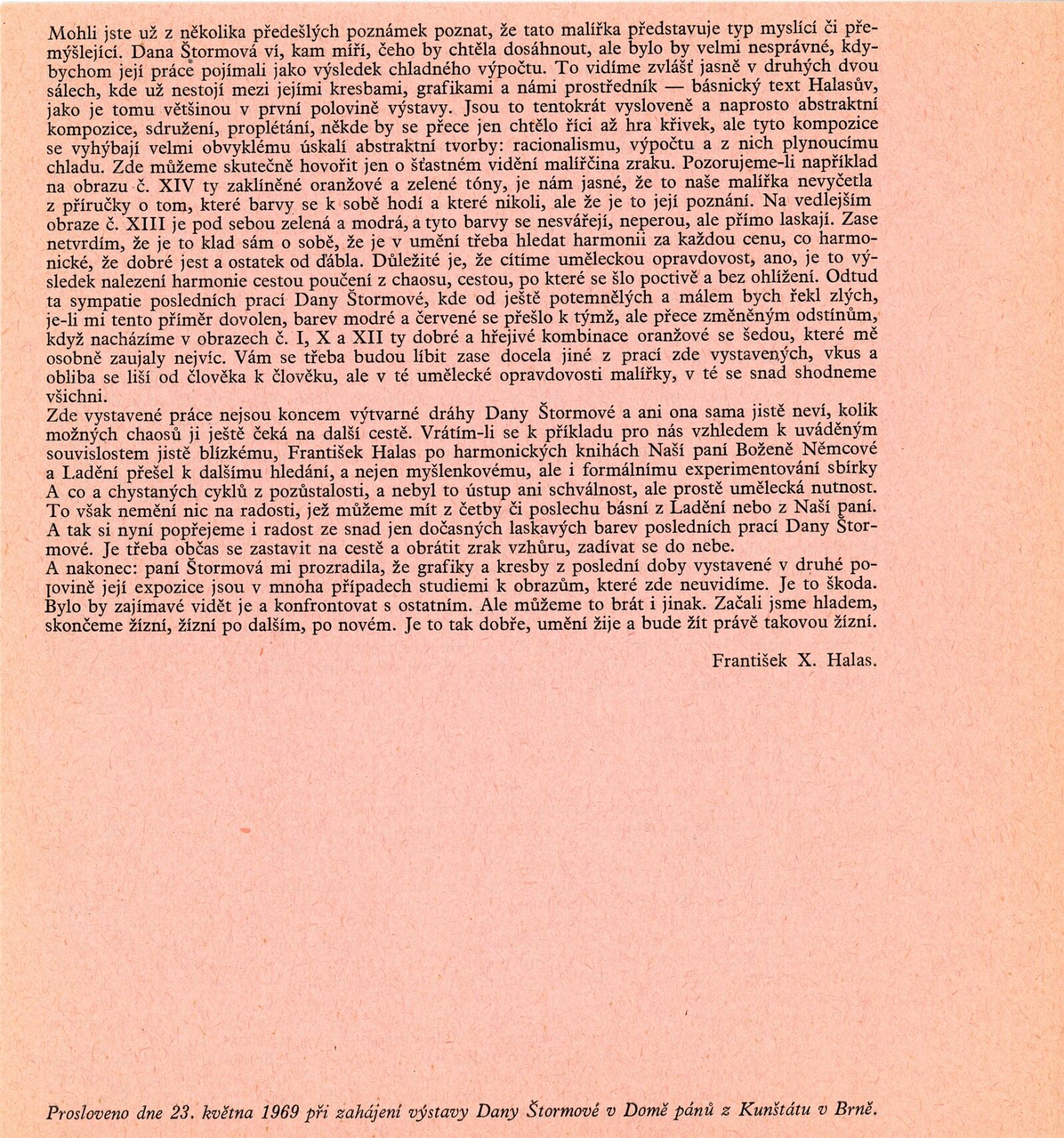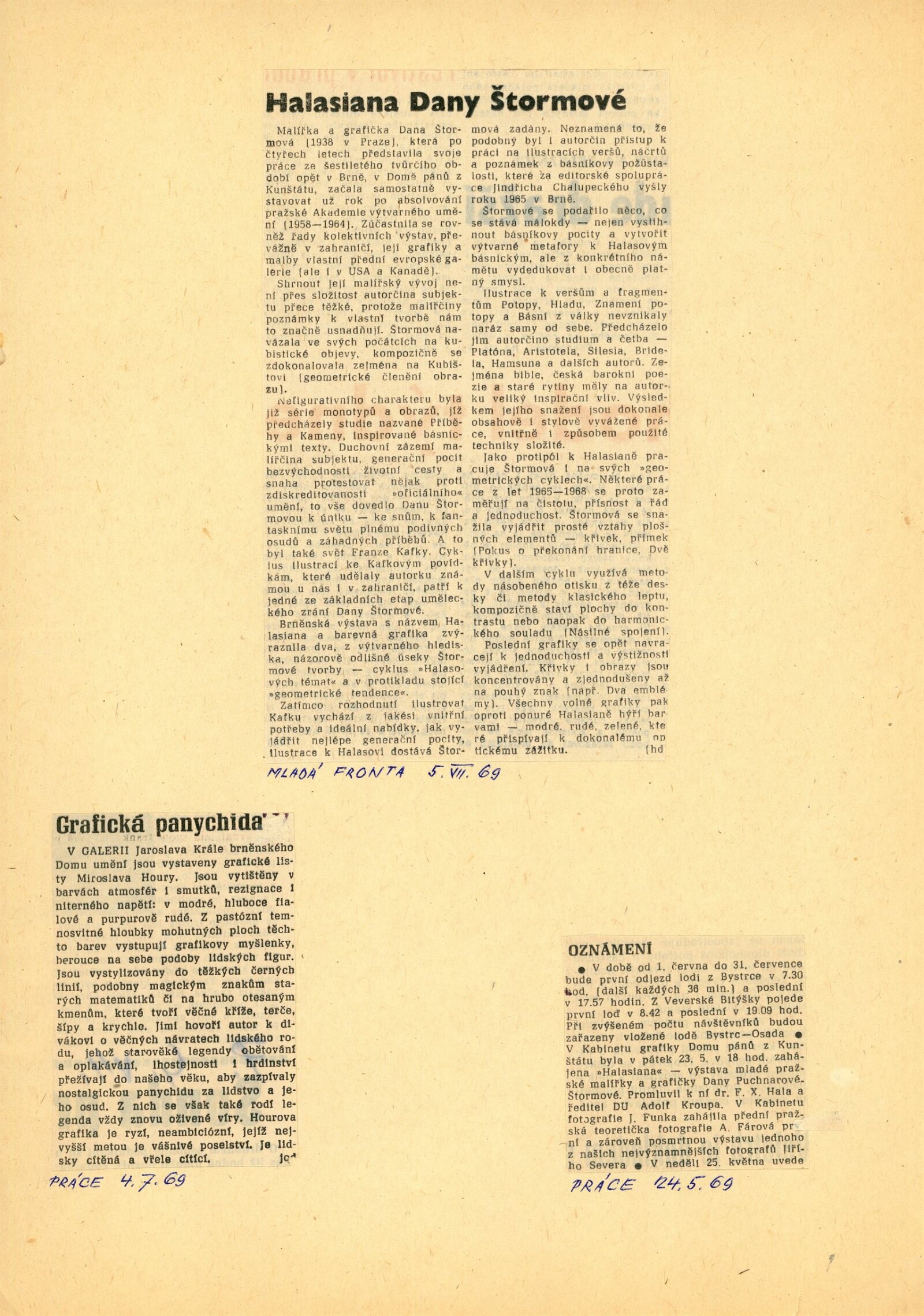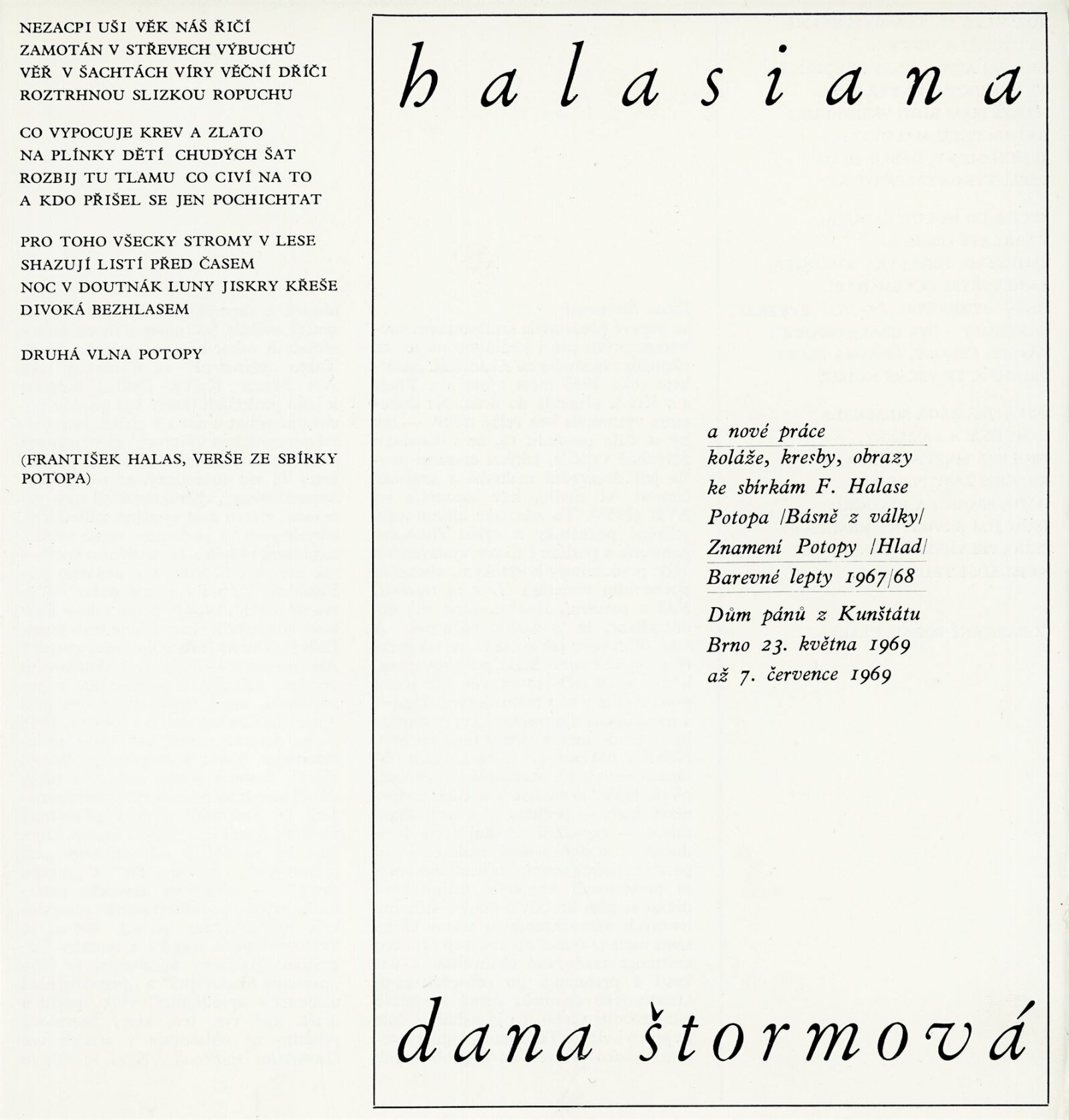 Dana Puchnarová-Štormová. Halasiana a barevná grafika: Dům umění města Brna / Dům pánů z Kunštátu, 23. 5. – 7. 7. 1969 / Text: A. Hartmann. – Brno: DUmB, 1969. – 12 s., obr., texty Adolf Kroupa, František X. Halas 4 s., životní data, výstavy, ceny, zastoupení ve sbírkách, DPK 413. – MZK; MG; MMB