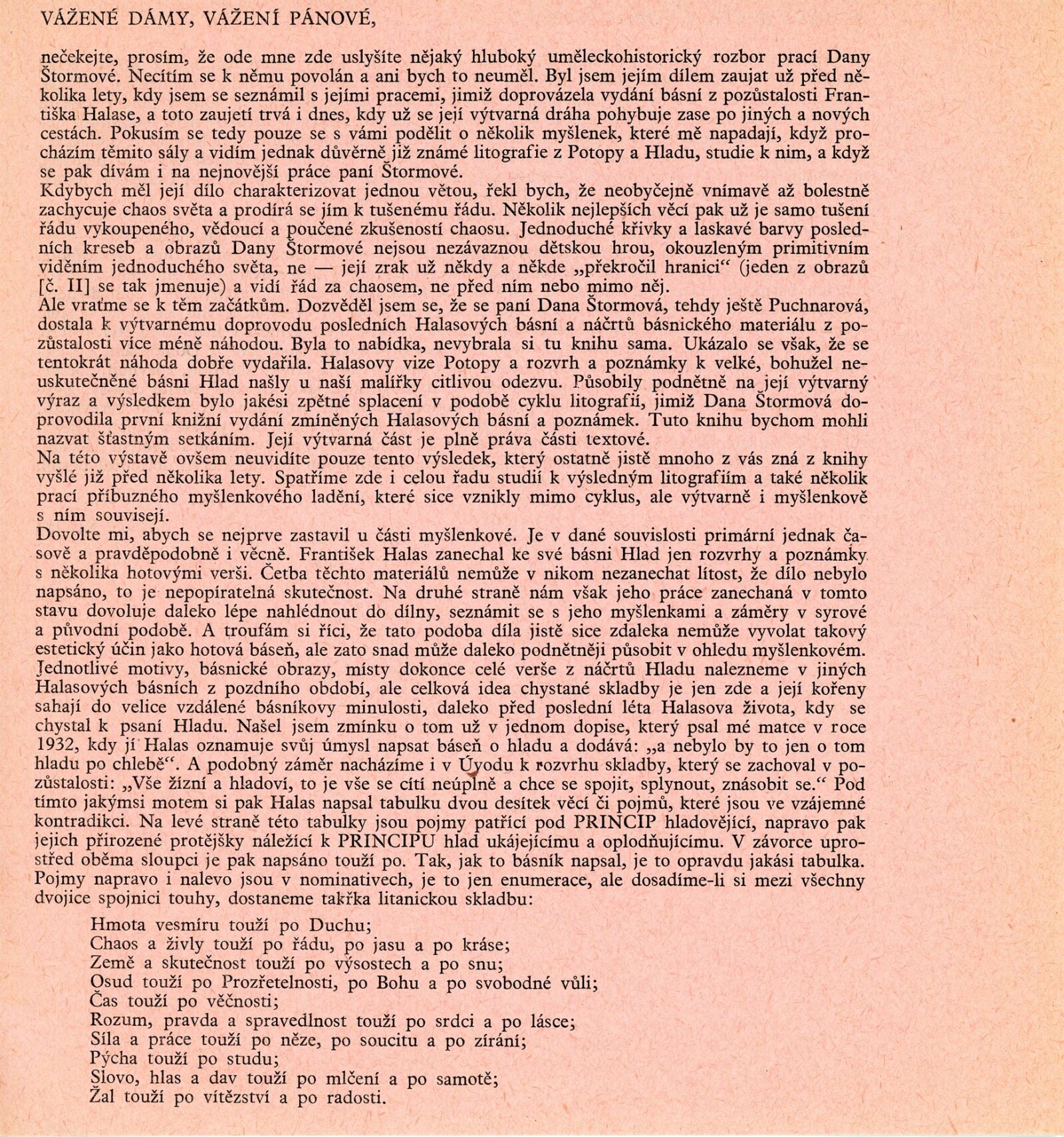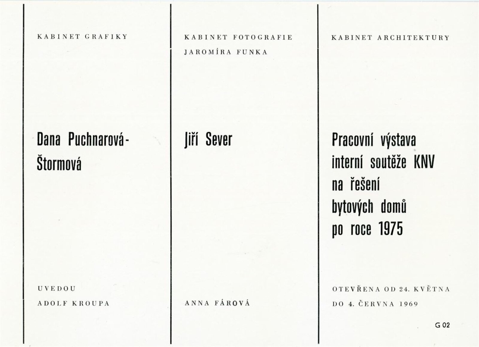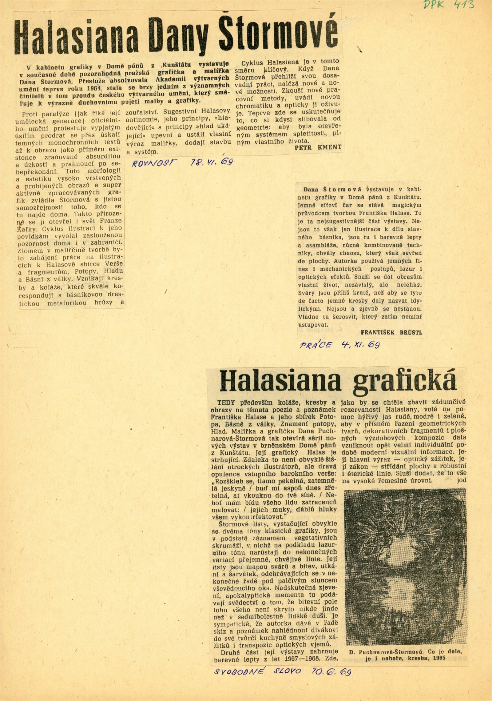 společná pozvánka DPK 413–414, katalog, strojopis úvodního slova na vernisáži (F. X. Halas), strojopis a rukopis básní ke katalogu, strojopis katalogu (Antonín Hartmann, Adolf Kroupa, F. X. Halas), seznam prací, korespondence (příprava výstavy a katalogu, odklad výstavy na rok 1967 – Dana Puchnarová-Štormová / DU, žádost o výstavu – D. Puchnarová), recenze v tisku, pozvánka (Hradec u Opavy 1967), katalog (Praha 1965)