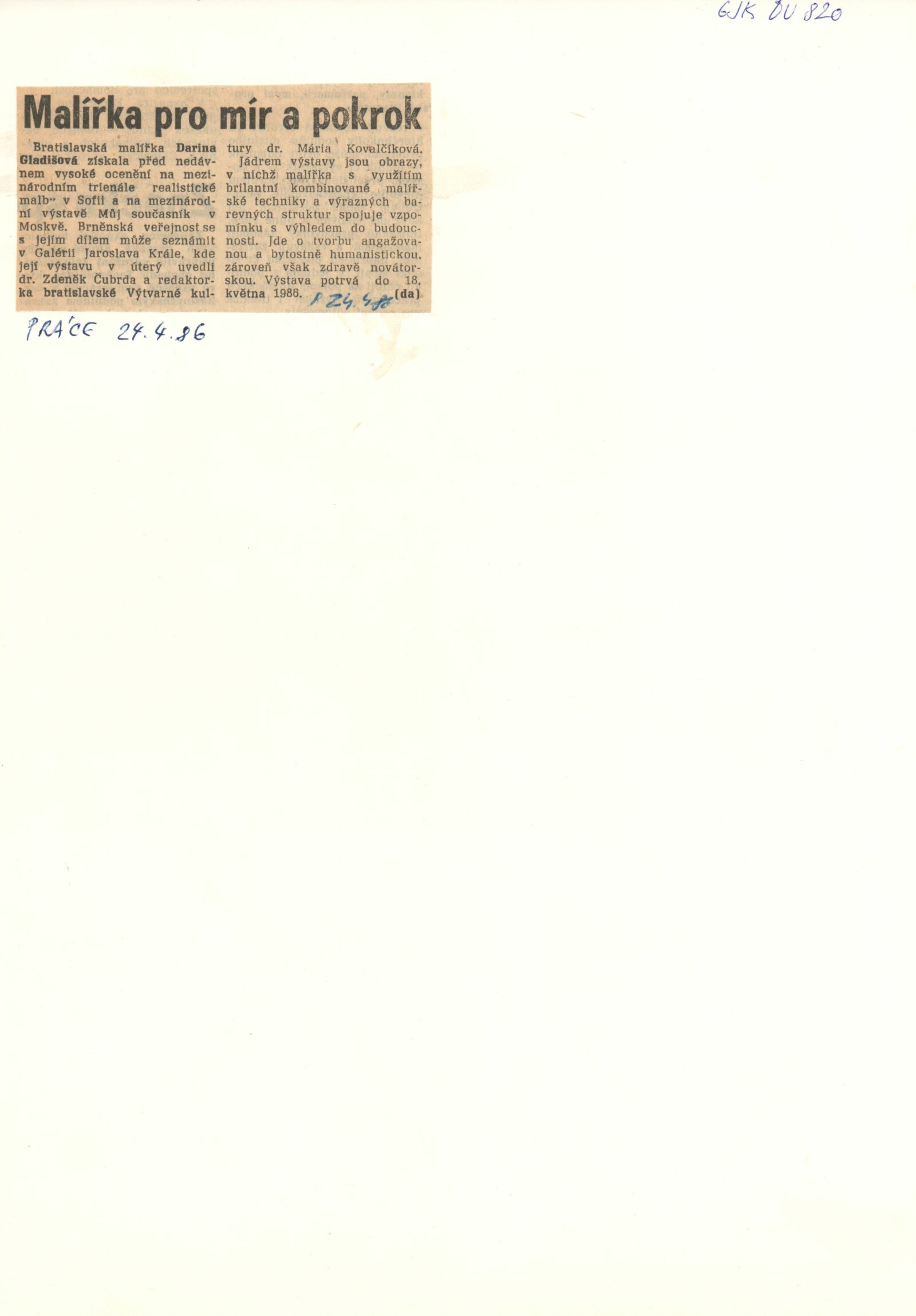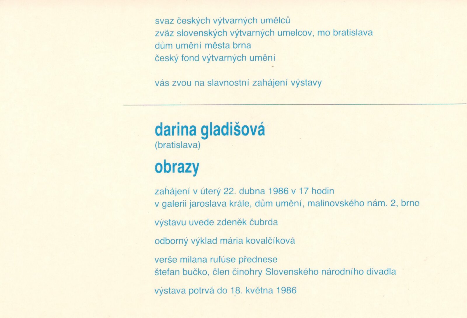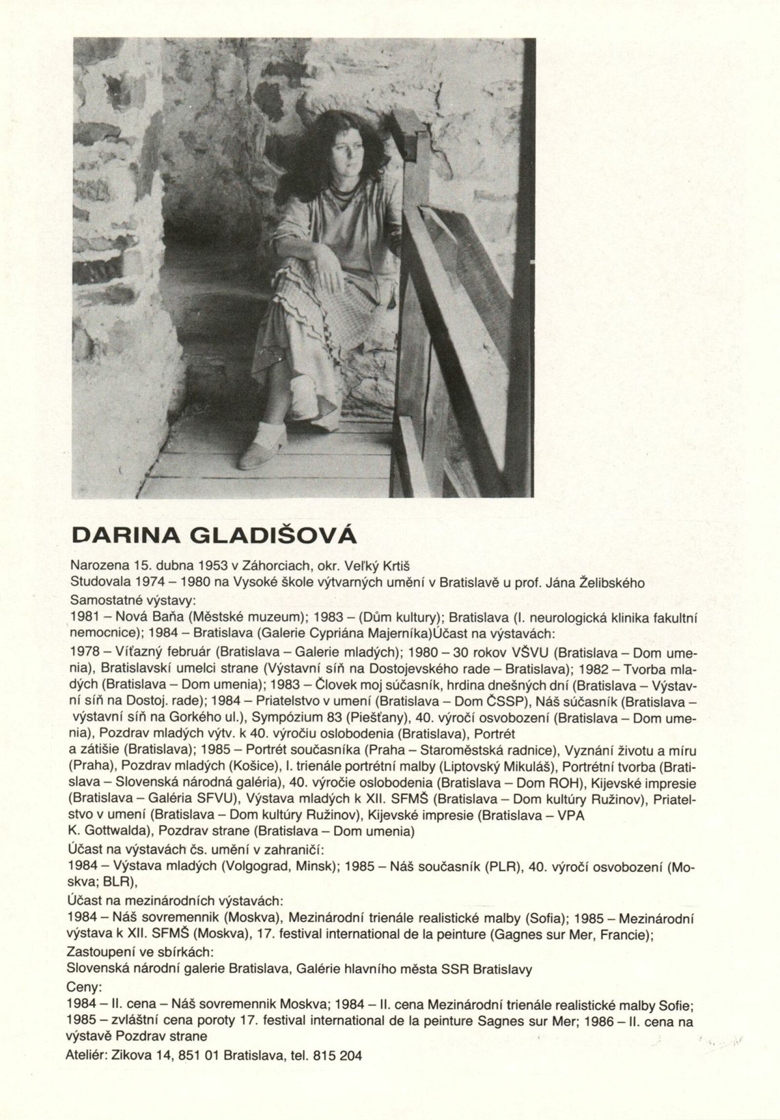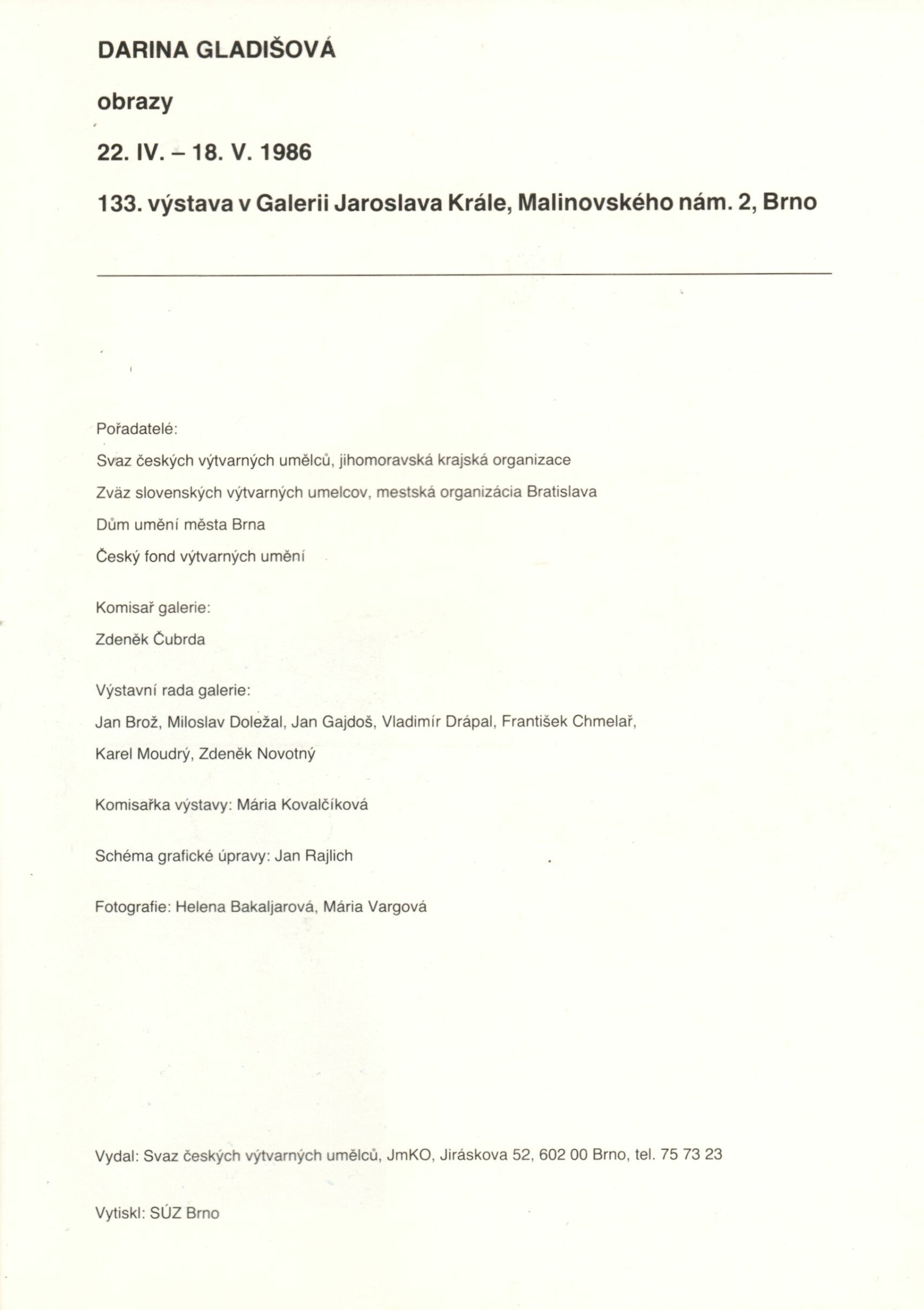 Darina Gladišová [Bratislava]. Obrazy: Dům umění, 133. výstava v Galerii Jaroslava Krále, 22. 4. – 18. 5. 1986 / Text: Mária Kovalčíková. – Brno: SČVU, 1986. – [12] s., obr., seznam vystavených prací [1] s., portrét, životní data, výstavy, zastoupení ve sbírkách, ceny, DU 820. – MZK; MG
