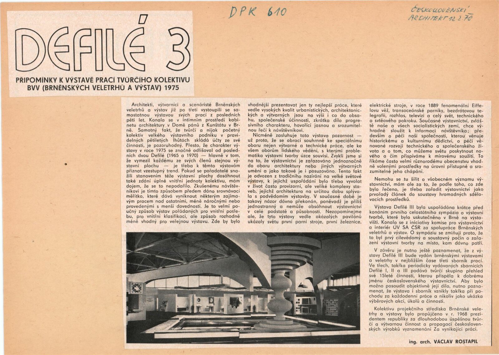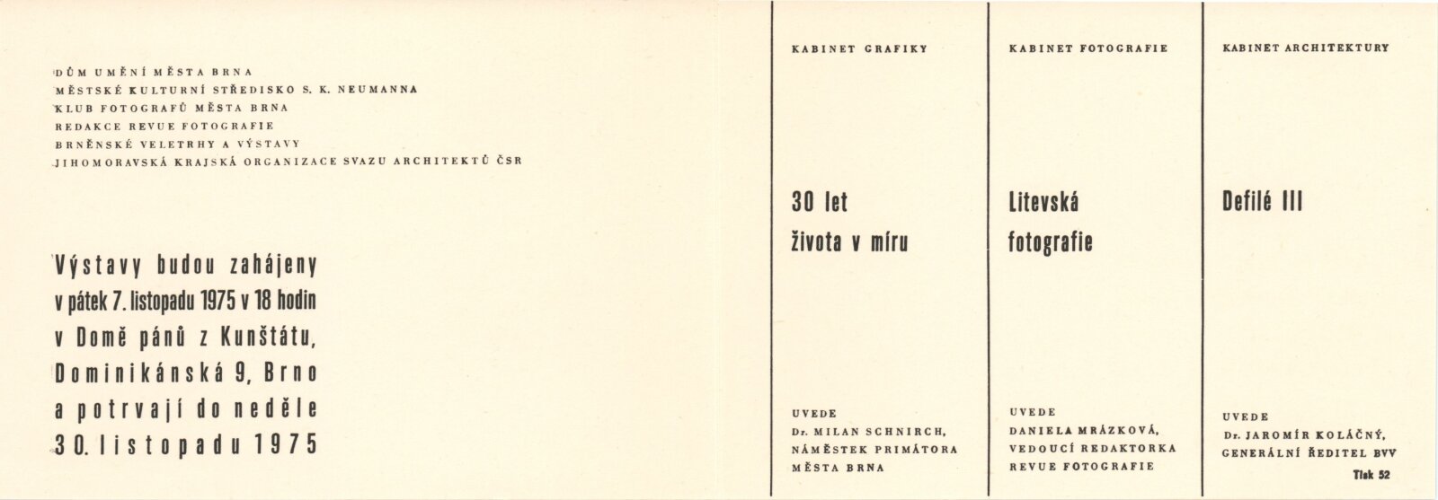 Defilé III. Tvůrčí kolektiv Brněnských veletrhů a výstav 1971–1975. Pět let práce tvůrčího kolektivu Brněnských veletrhů a výstav 1971–1975: Dům umění / Dům pánů z Kunštátu, Kabinet architektury, 7. 11. – 30. 11. 1975 / Text: Jaromír Koláčný, Miroslav Kramoliš. – Brno: propagační oddělení Brněnských veletrhů a výstav, 1975. – 51 s., obr., katalog tvůrčí skupiny Brněnských veletrhů a výstav Defilé II 1966–1970 Brno, Výstaviště, pavilon A3, měl vyjít v roce 1971, ale vzhledem k úmrtí architekta Františka Kalivody vyšel až v roce 1975, DPK 610. – MZK