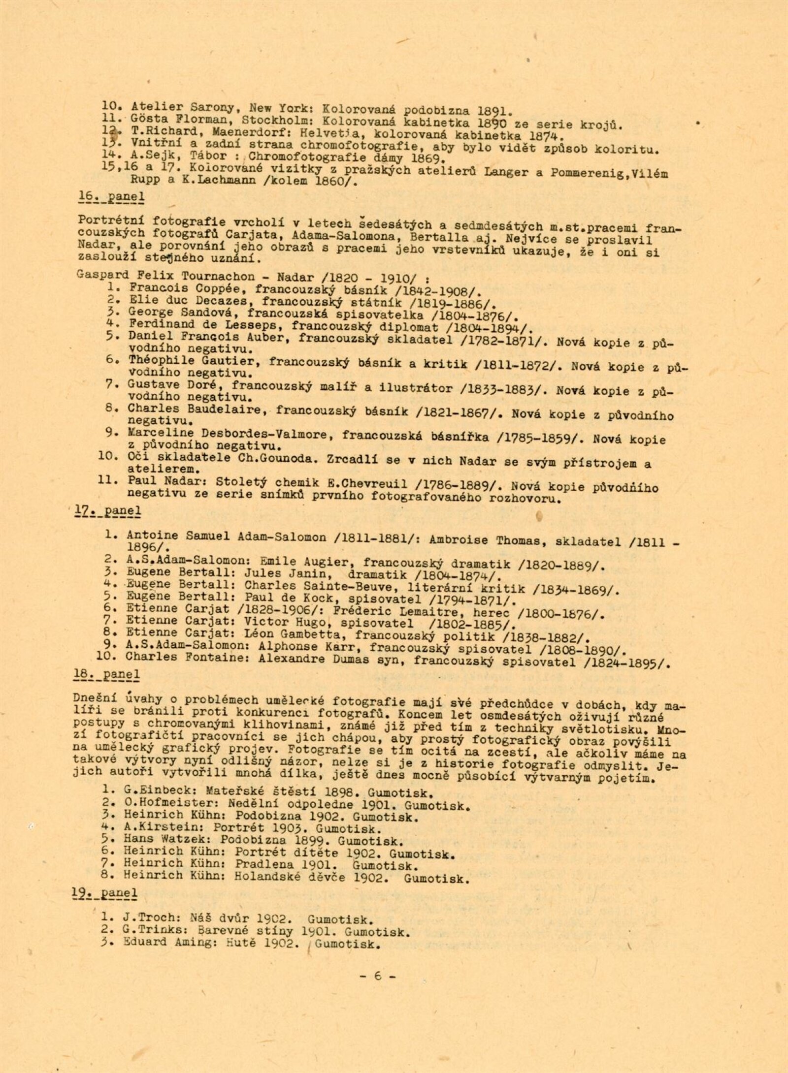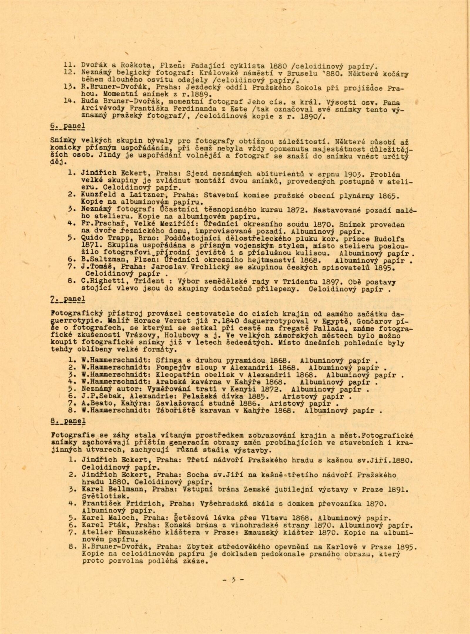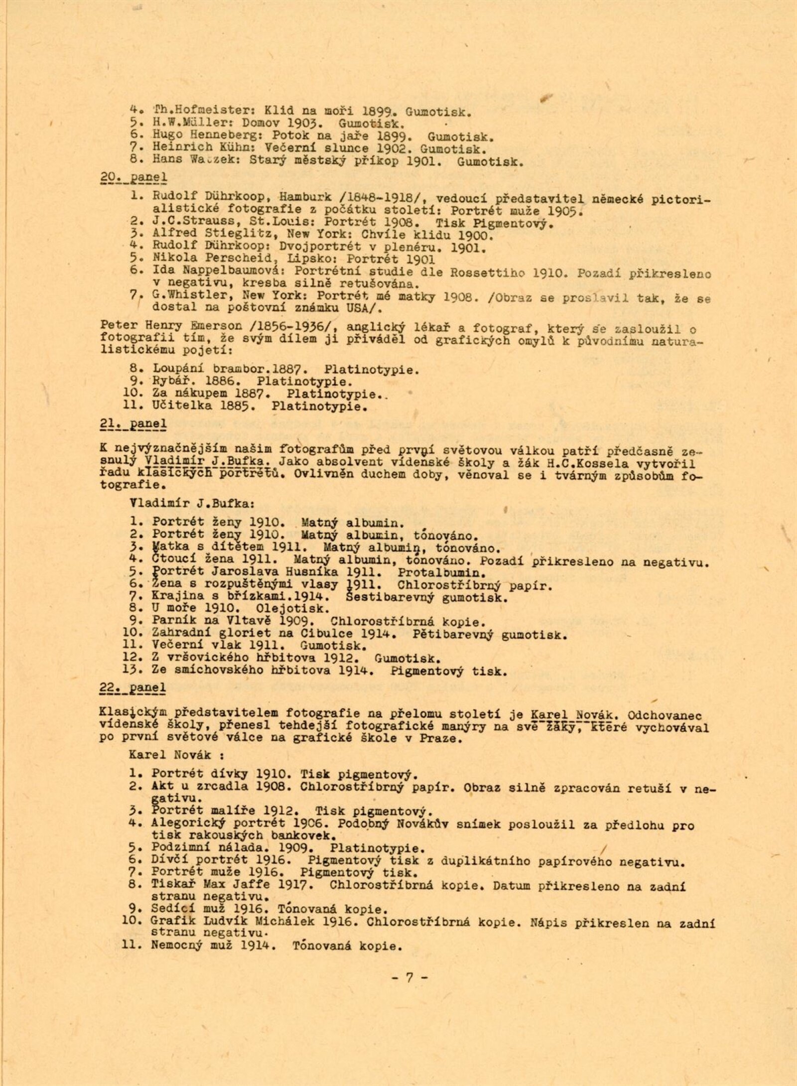 F. Anděl, Josef Binko, Karel Binko, Karel Bellman, Beuronská škola, Mayer Bohuslav, Rudolf Böhm, Josef Böttinger, František Böger, Alexandr Brabec, Jan Adolf Brandeis, Rudolf Bruner-Dvořák, Vladimír Jindřich Bufka, J. Čvančara, František Čermák, František Drtikol, Karel Dvořák, Jindřich Eckert, Jaroslav Feyfar, Hynek Fiedler, Tomáš Frenzl, F. Fridrich, J. Friedberg-Mírohorský, Vladimír Grégr, F. Gödel, Karel Hellich, Atelier Helios, Vilém Horn, Jakub Husník, Jindra Imlauf, Josef Božetěch Klemens, M. Klempfner, Karel Václav Klíč, František Komers, C. Körper, P. V. Kramer, Ignác Kranzfelder, Karel Krupka, Jan Kříženecký, Jan Kučka, J. F. Langhans, Adolf Ledebour, Alfred Liebig, Gustav Majer, Jan Maloch, Karel Maloch, F. Milde, J. Müllern, Josef Němeček, Karel Novák, F. Pavlík, Karel Paspa, Nik. Pelzbauer, Josef Picek, C. Pietzner, Ludvík Pinka, František Polak, Jan Posselt, Karel Pták, J. Rádl, Bartoloměj Salzman, Schlosser, A. Schwöder, F. G. Seeburger, František Seidel, Josef Steffel, František Svoboda, Karel Svoboda, Otto Šetele, Augustin Škarda, J. V. Sládek, František Šlechta, Jan Špillar, Jan Špinar, Antonín Štifter, F. Tauber, J. Tomáš, Quido Trapp, Jan Veigner, R. Veverka, Adolf Vyšata, Wenisch, Stanislav Wirth, J. Zuna, František Ženíšek
