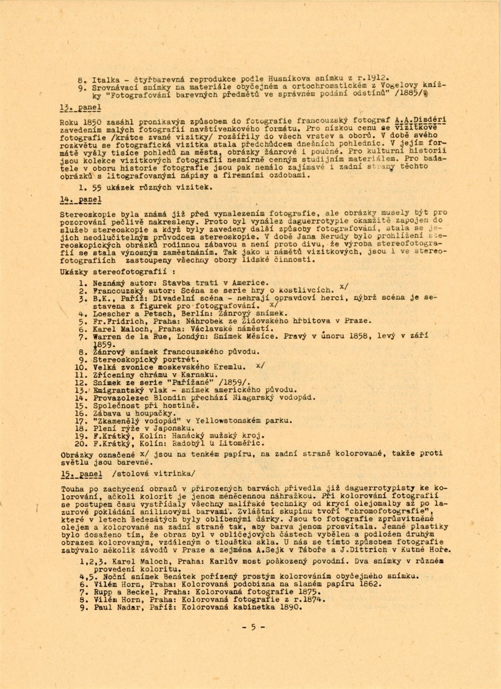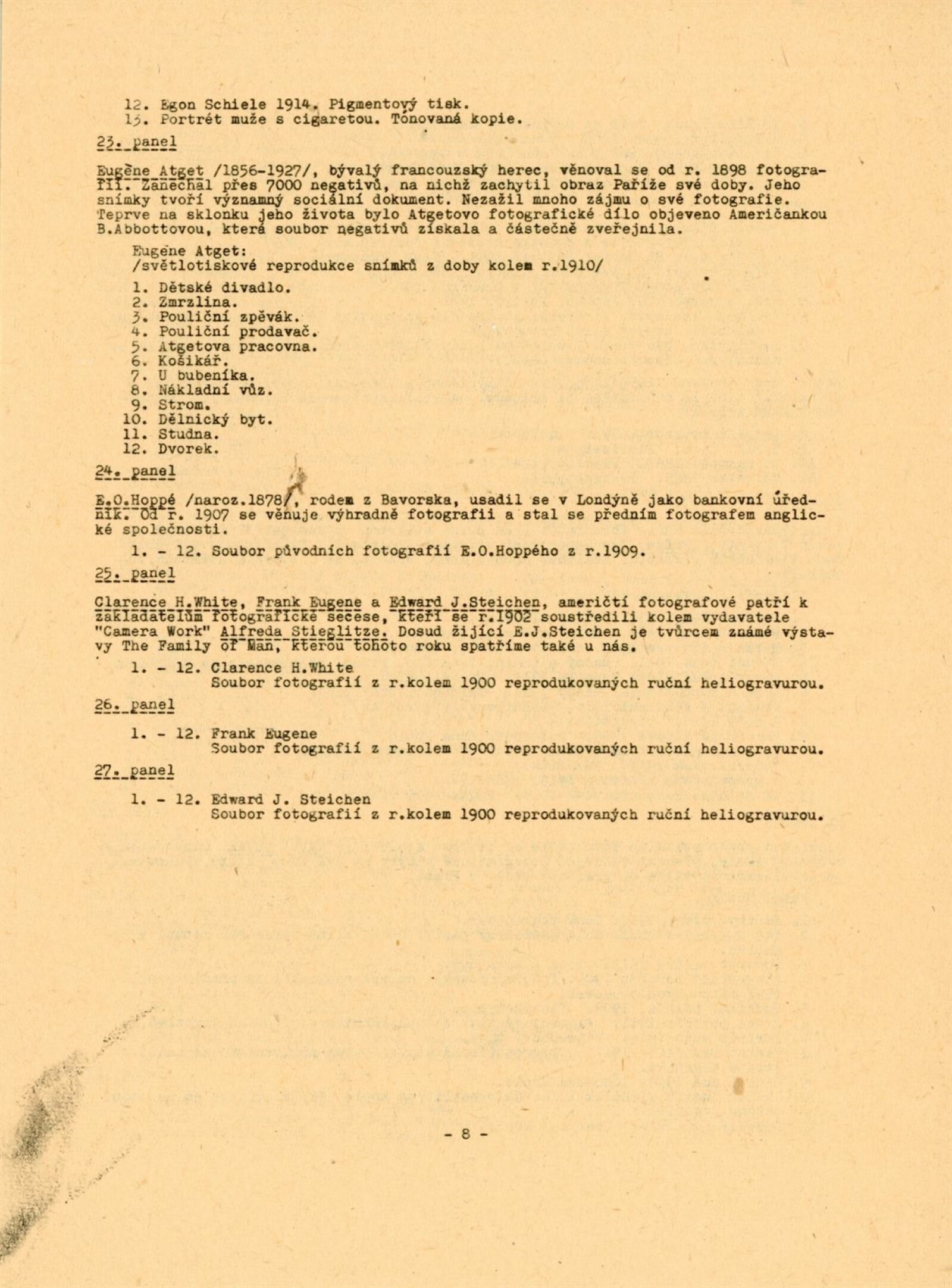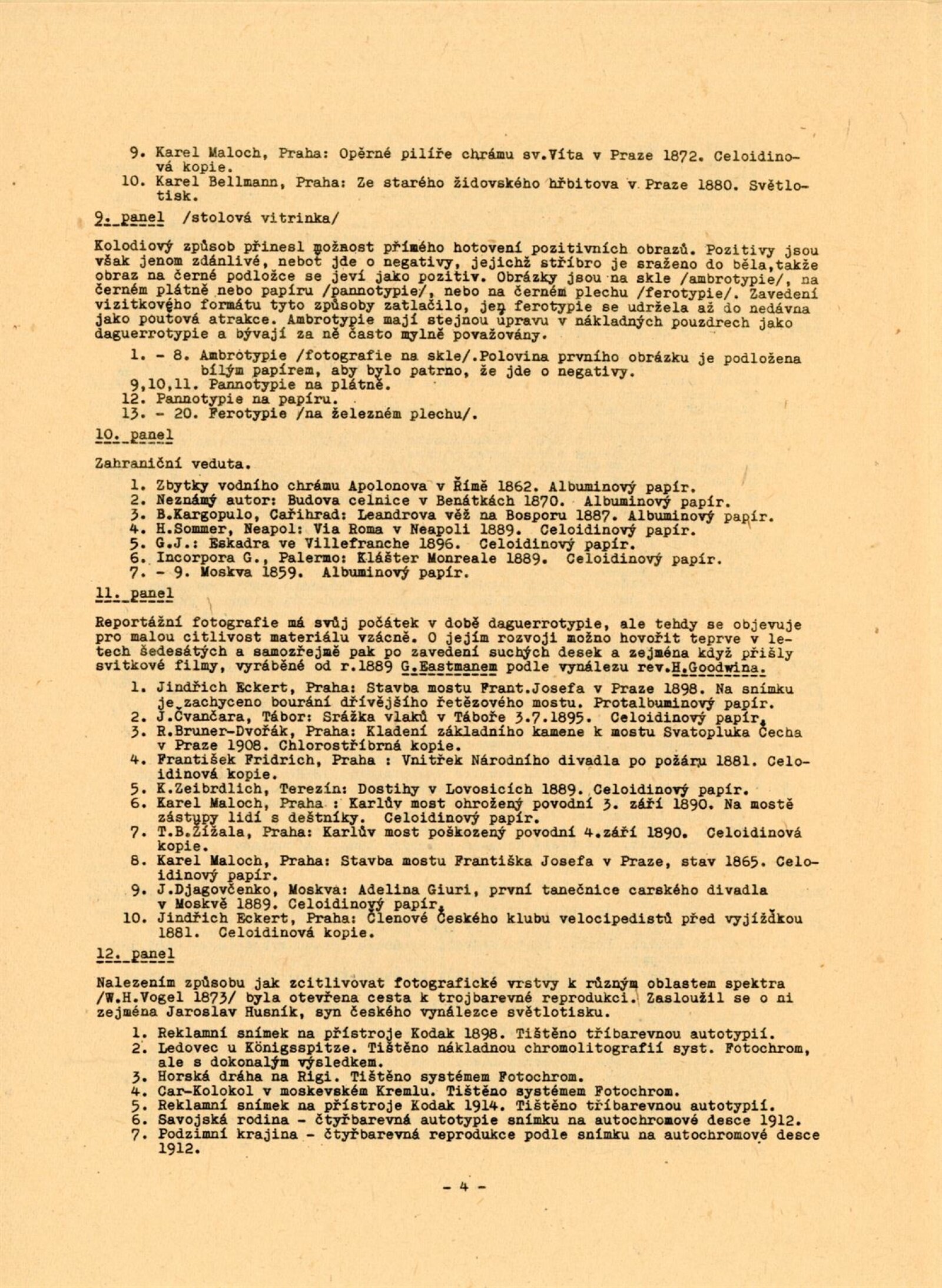 F. Anděl, Josef Binko, Karel Binko, Karel Bellman, Beuronská škola, Mayer Bohuslav, Rudolf Böhm, Josef Böttinger, František Böger, Alexandr Brabec, Jan Adolf Brandeis, Rudolf Bruner-Dvořák, Vladimír Jindřich Bufka, J. Čvančara, František Čermák, František Drtikol, Karel Dvořák, Jindřich Eckert, Jaroslav Feyfar, Hynek Fiedler, Tomáš Frenzl, F. Fridrich, J. Friedberg-Mírohorský, Vladimír Grégr, F. Gödel, Karel Hellich, Atelier Helios, Vilém Horn, Jakub Husník, Jindra Imlauf, Josef Božetěch Klemens, M. Klempfner, Karel Václav Klíč, František Komers, C. Körper, P. V. Kramer, Ignác Kranzfelder, Karel Krupka, Jan Kříženecký, Jan Kučka, J. F. Langhans, Adolf Ledebour, Alfred Liebig, Gustav Majer, Jan Maloch, Karel Maloch, F. Milde, J. Müllern, Josef Němeček, Karel Novák, F. Pavlík, Karel Paspa, Nik. Pelzbauer, Josef Picek, C. Pietzner, Ludvík Pinka, František Polak, Jan Posselt, Karel Pták, J. Rádl, Bartoloměj Salzman, Schlosser, A. Schwöder, F. G. Seeburger, František Seidel, Josef Steffel, František Svoboda, Karel Svoboda, Otto Šetele, Augustin Škarda, J. V. Sládek, František Šlechta, Jan Špillar, Jan Špinar, Antonín Štifter, F. Tauber, J. Tomáš, Quido Trapp, Jan Veigner, R. Veverka, Adolf Vyšata, Wenisch, Stanislav Wirth, J. Zuna, František Ženíšek