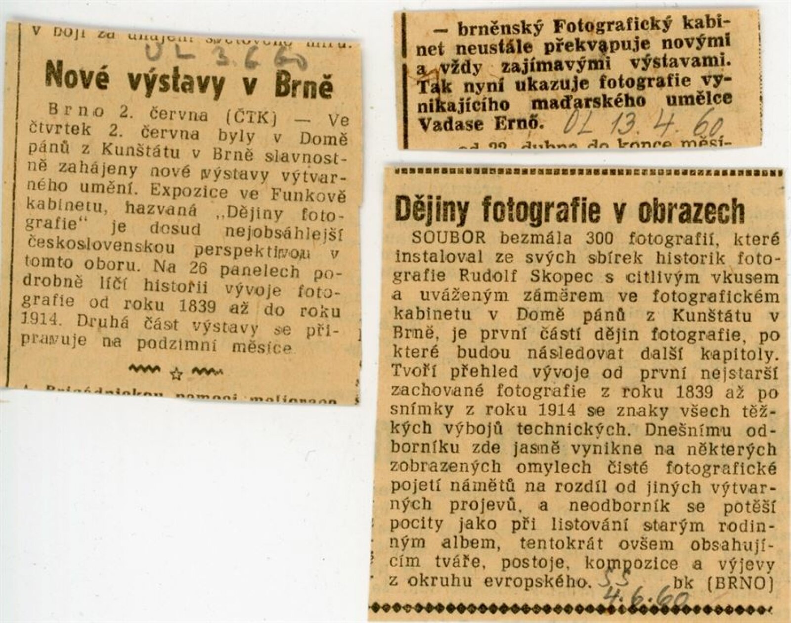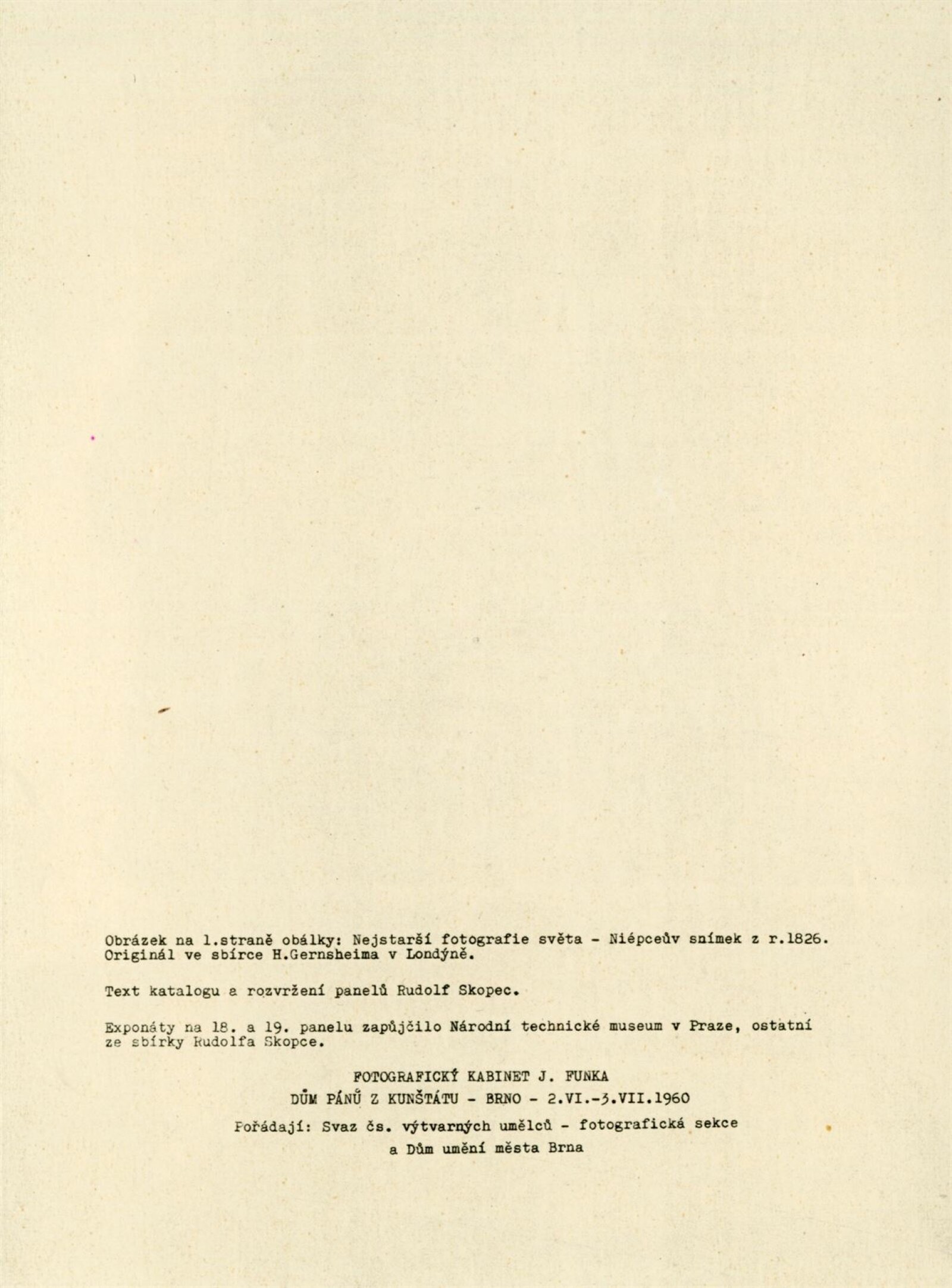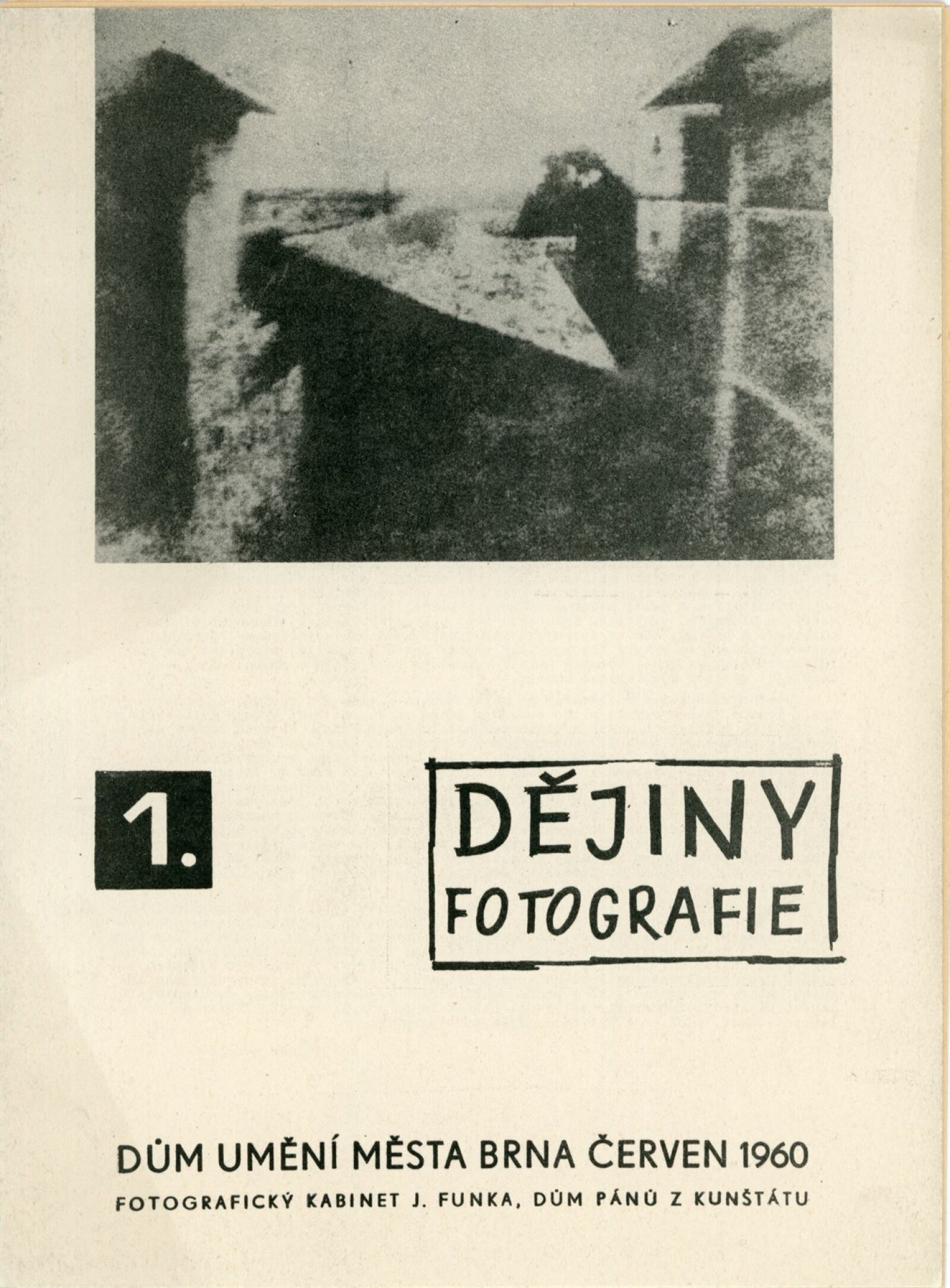 Dějiny fotografie. 1. 1839–1914: Dům umění města Brna / Dům pánů z Kunštátu, 14. výstava Kabinetu fotografie Jaromíra Funka, 2. 6. – 3. 7. 1960 / Text: Rudolf Skopec. – Brno: DUmB, 1960. – 8 s., DPK 76. – MG; MMB