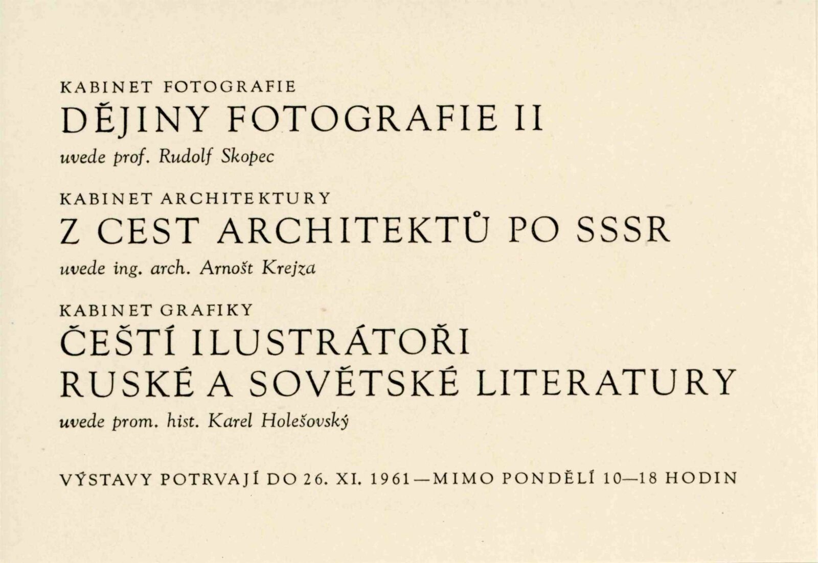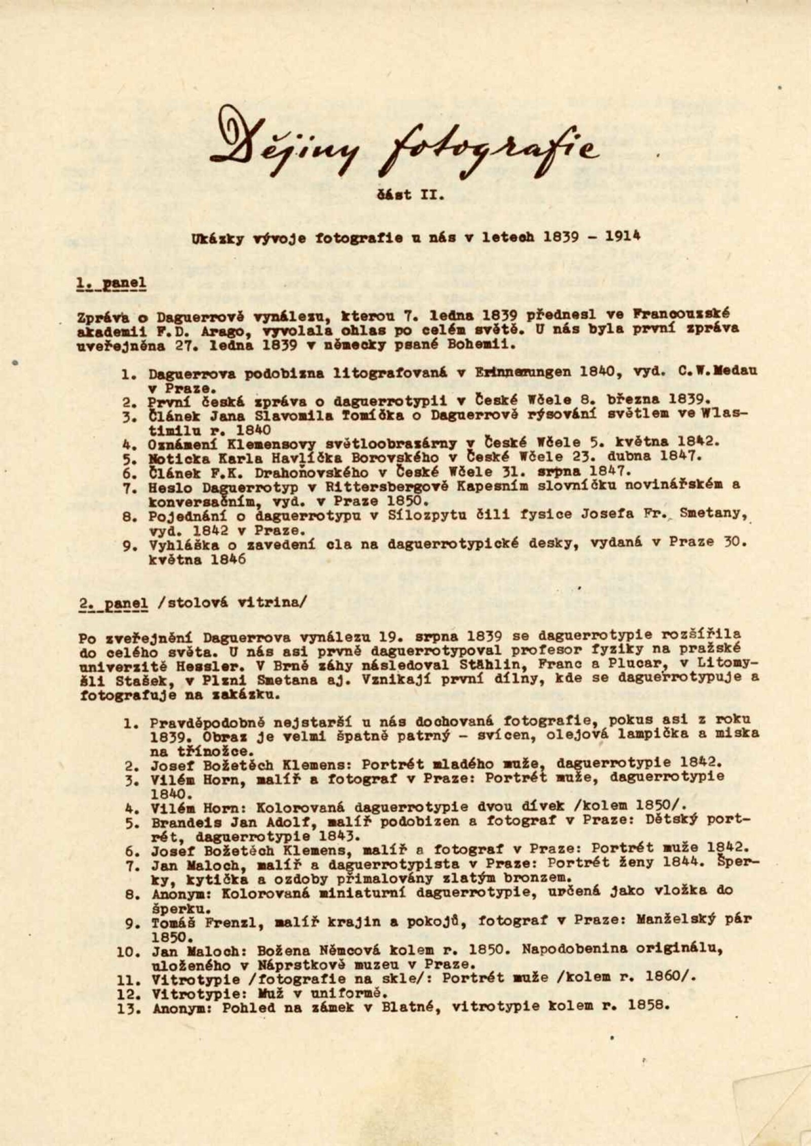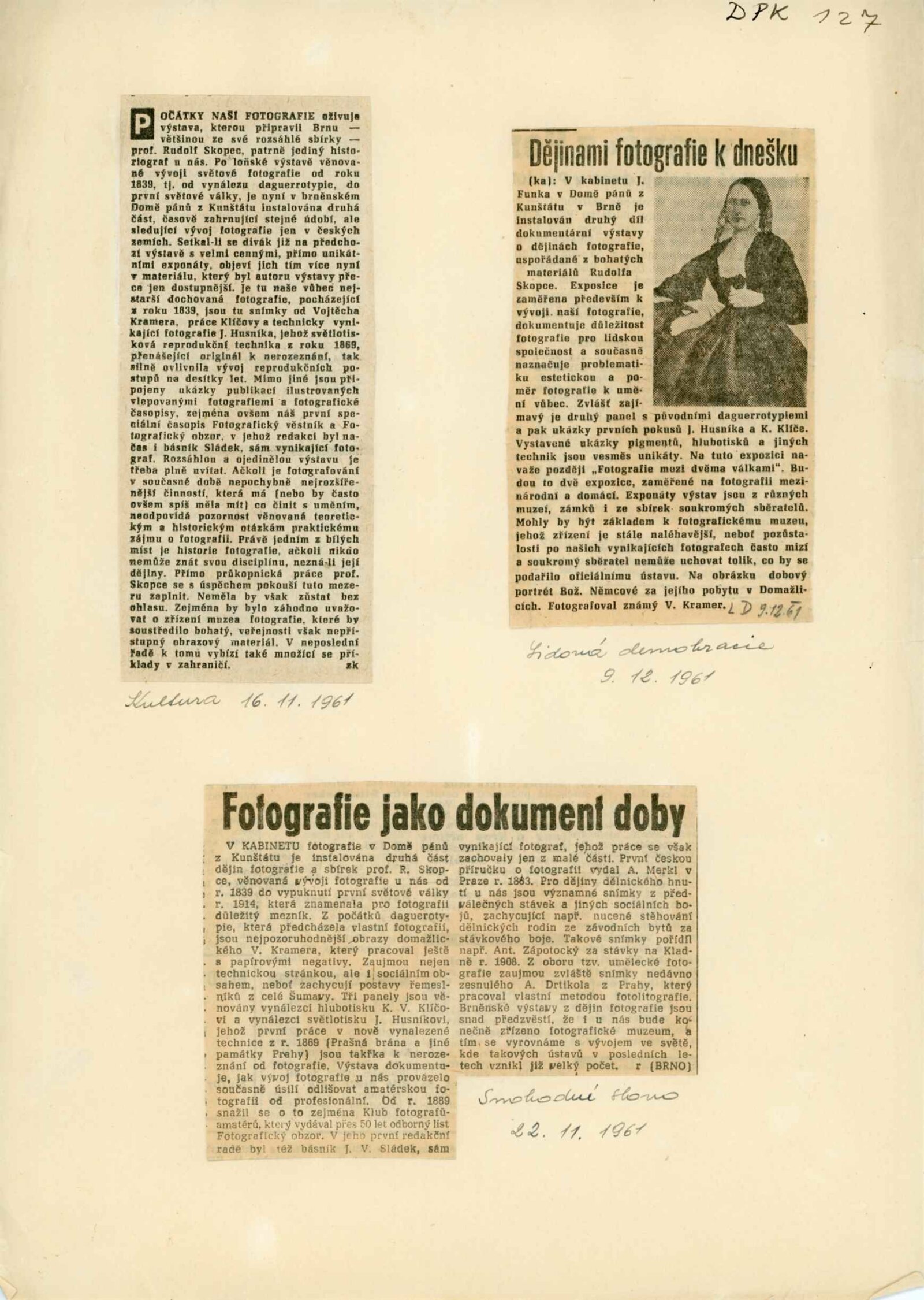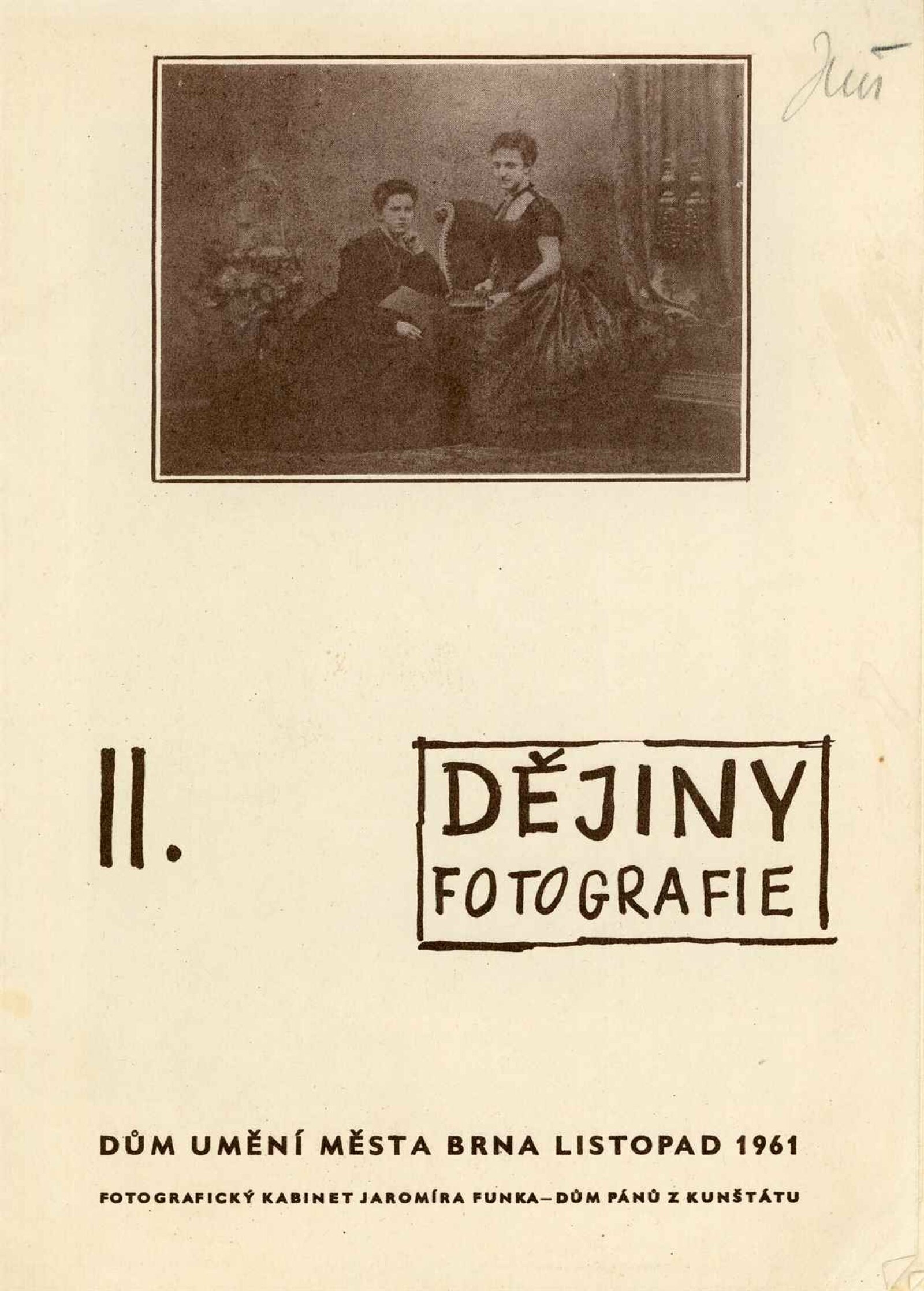 Dějiny fotografie II. 1839–1914: Dům umění města Brna / Dům pánů z Kunštátu, 26. výstava Kabinetu fotografie Jaromíra Funka, 3. 11. – 26. 11. 1961 / Text: Rudolf Skopec. – Brno: DUmB, 1961. – 8 s., DPK 127. – MZK; MG; MMB